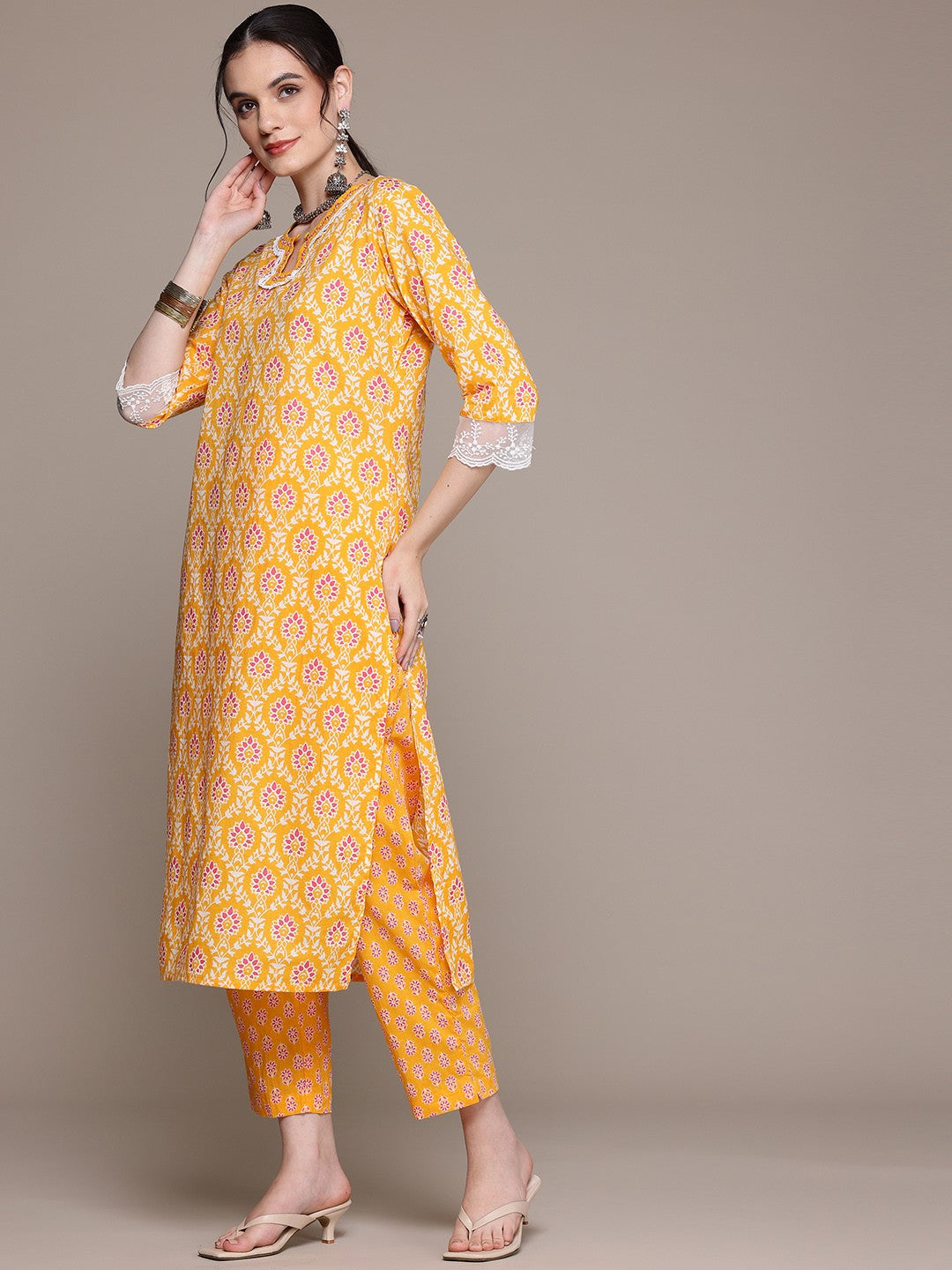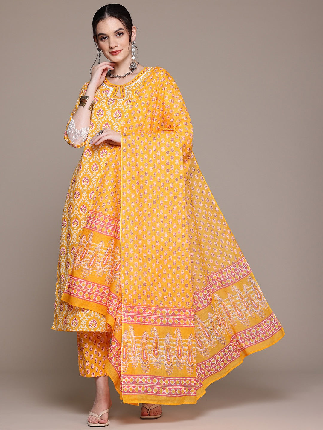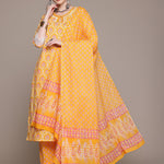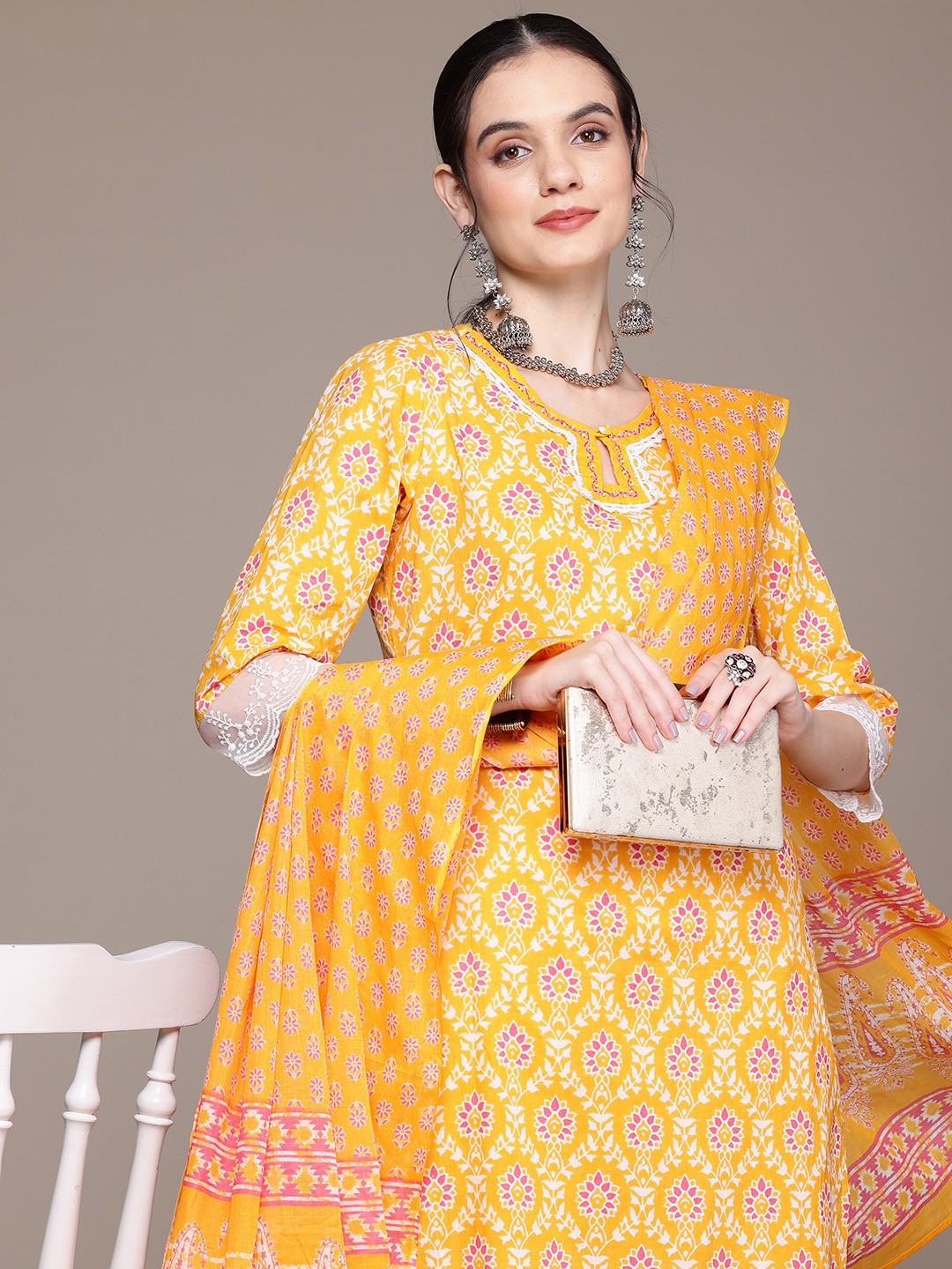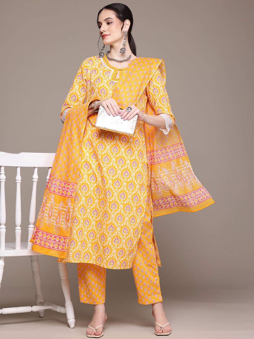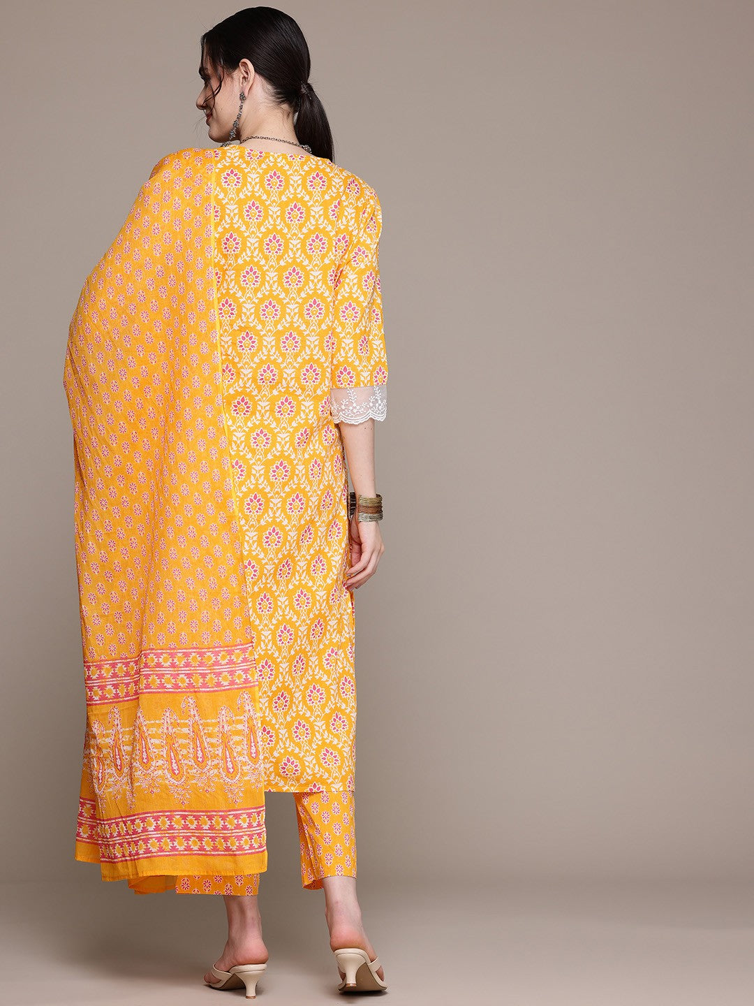 Straight Style Cotton Fabric Yellow Color Kurta With Bottom And Dupatta