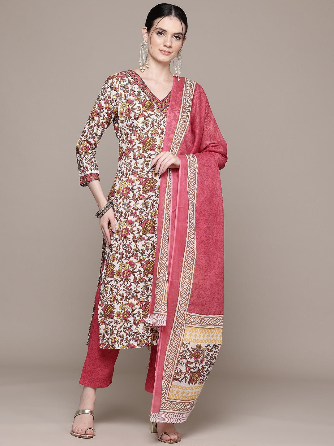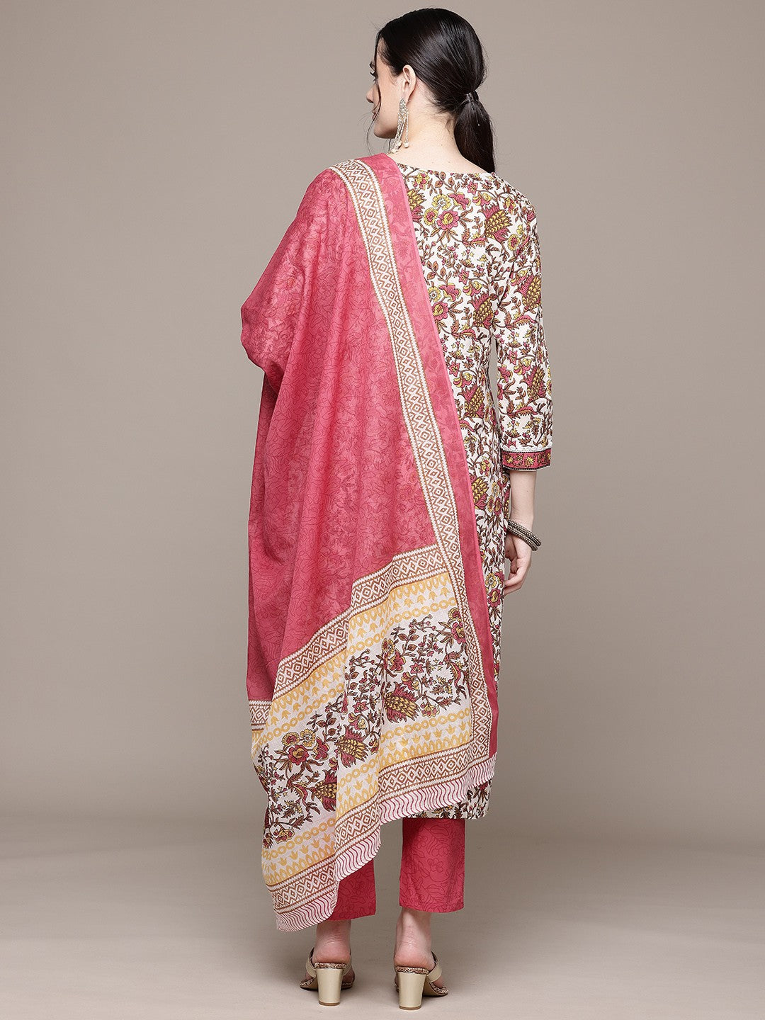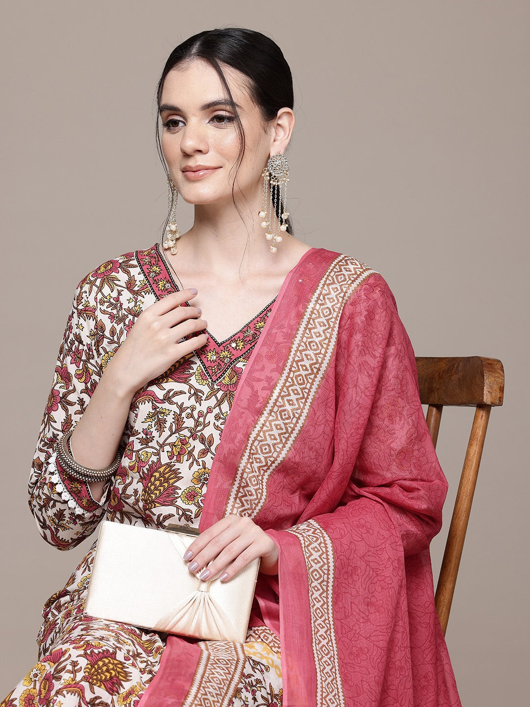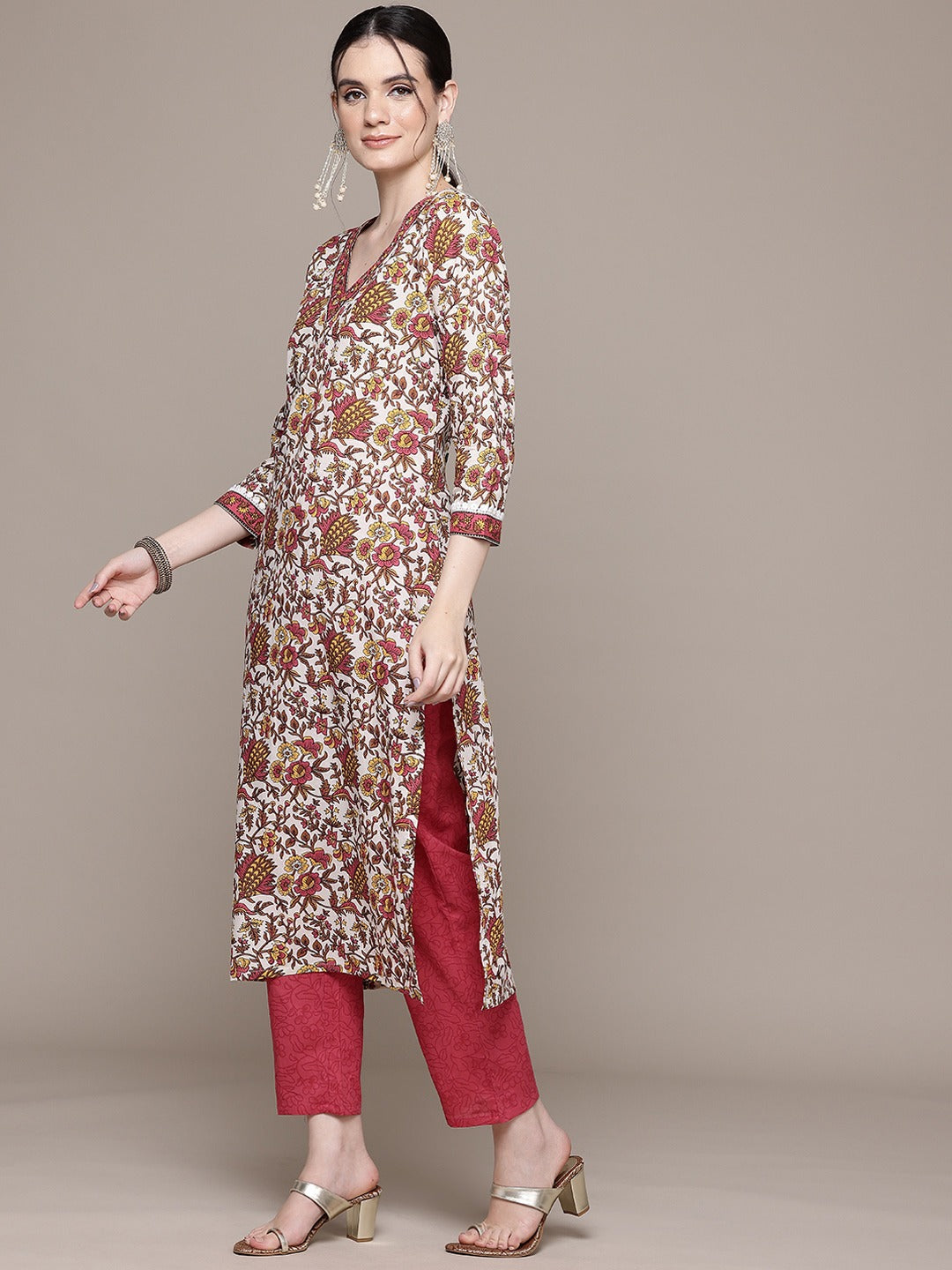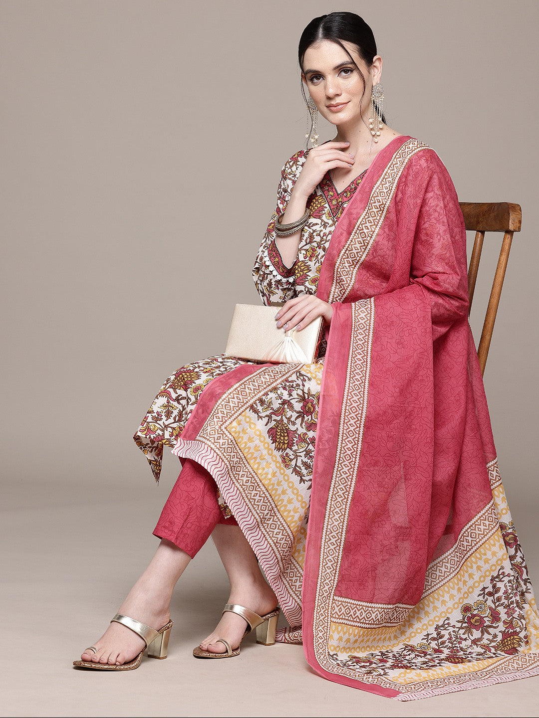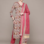 Straight Style Cotton Fabric Red Color Kurta With Bottom And Dupatta