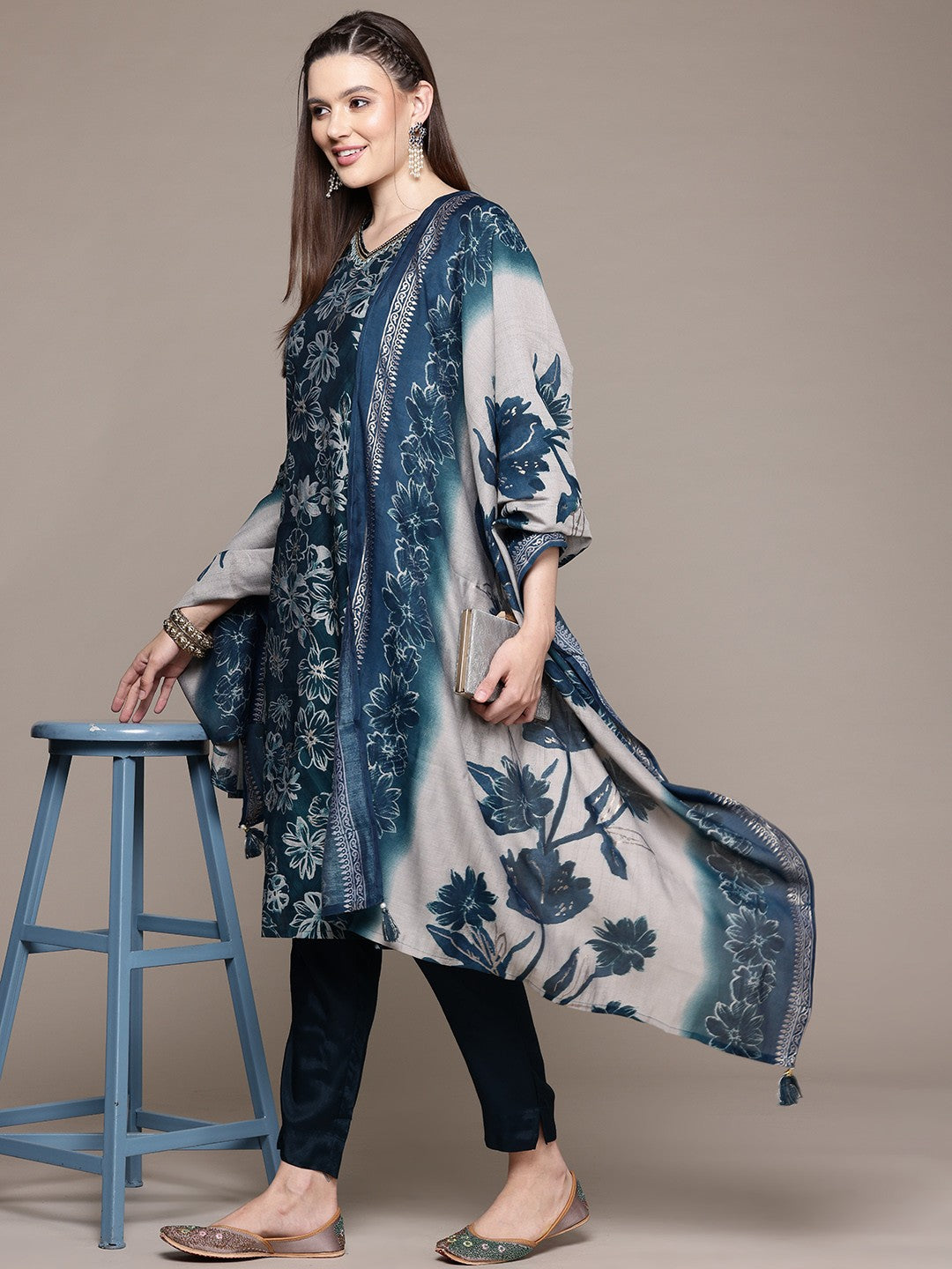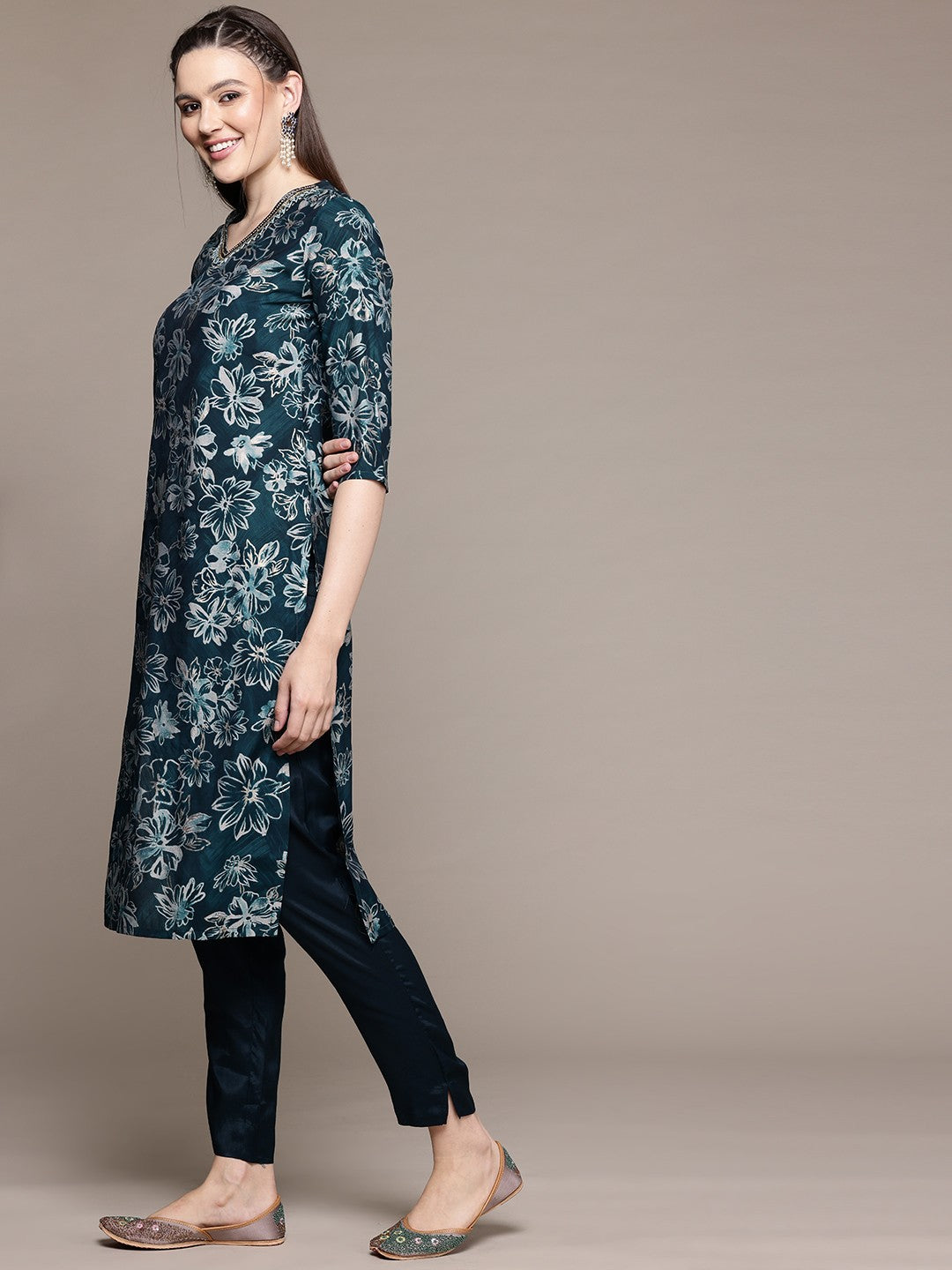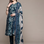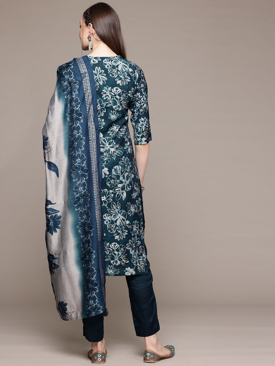 Straight Style Silk Fabric Teal Color Kurta With Bottom And Dupatta