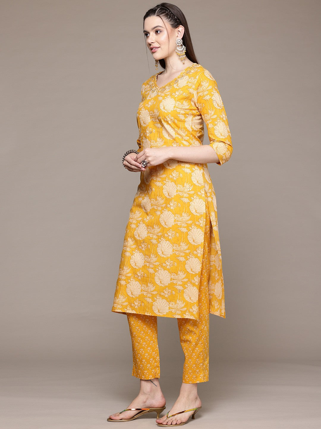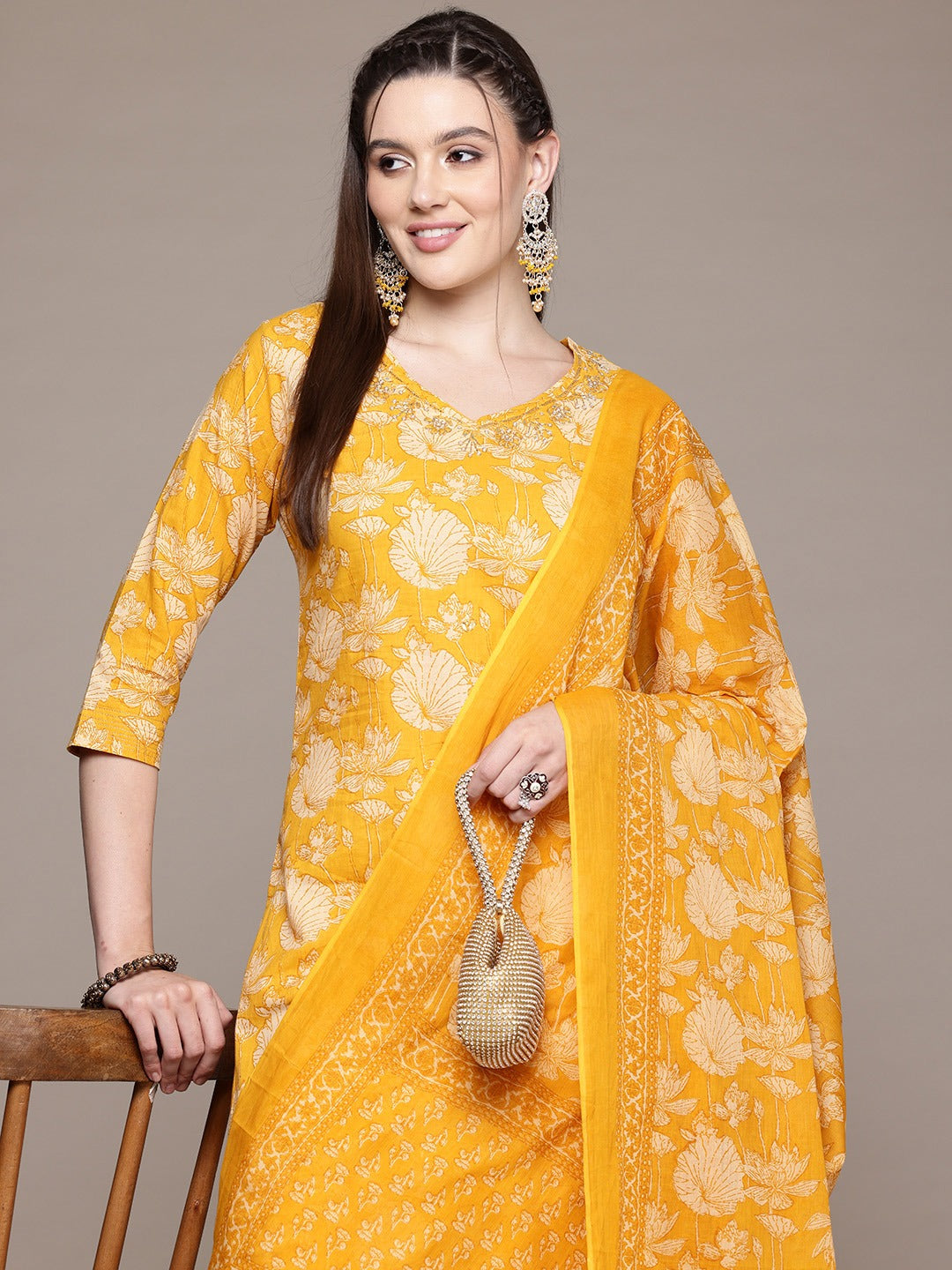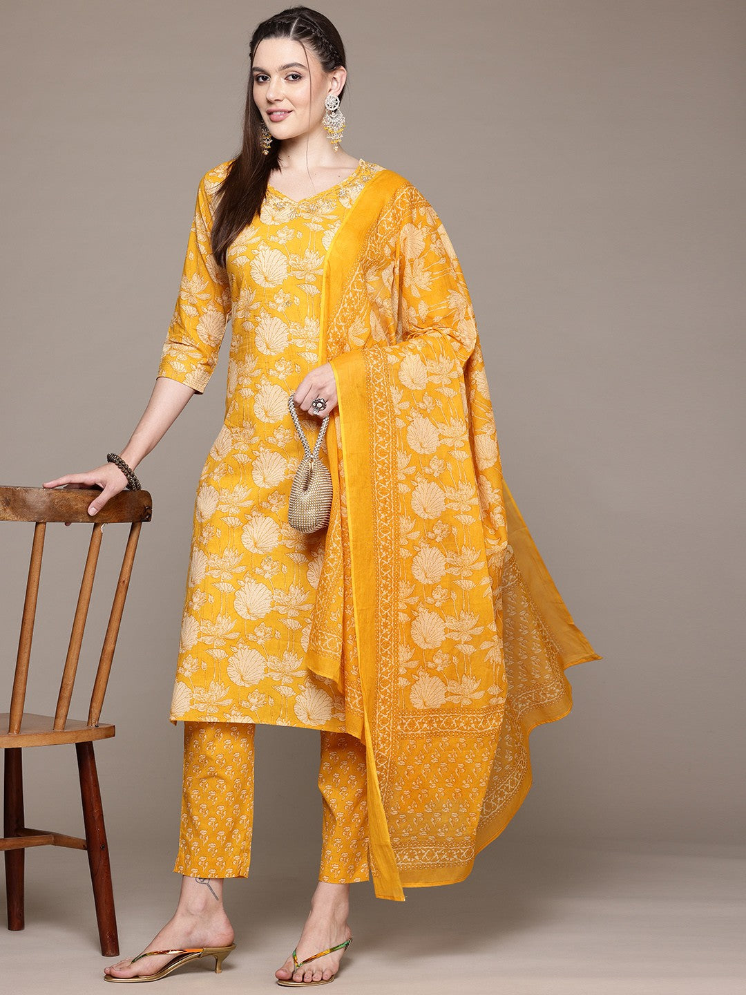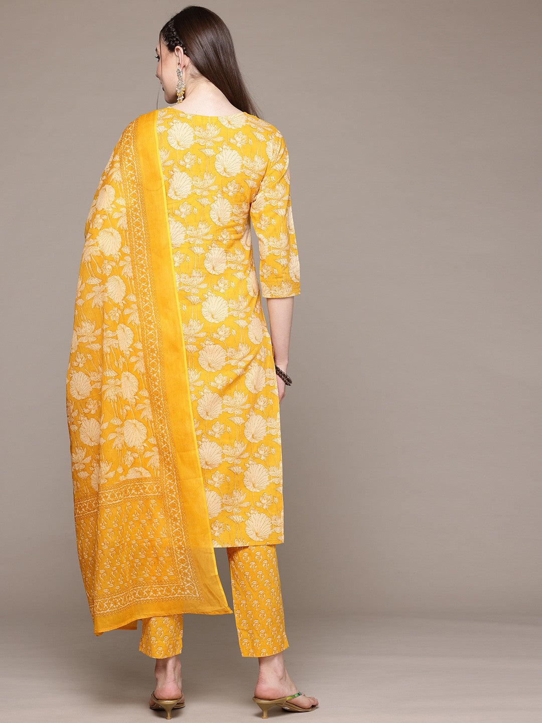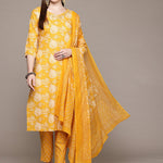 Straight Style Cotton Fabric Mustard Color Kurta With Bottom And Dupatta