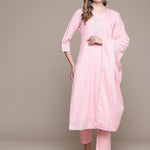 Straight Style Cotton Fabric Pink Color Kurta With Bottom And Dupatta