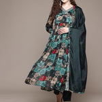 Flared Style Silk Fabric Green Color Kurta With Bottom And Dupatta