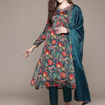 Flared Style Silk Fabric Teal Color Kurta With Bottom And Dupatta