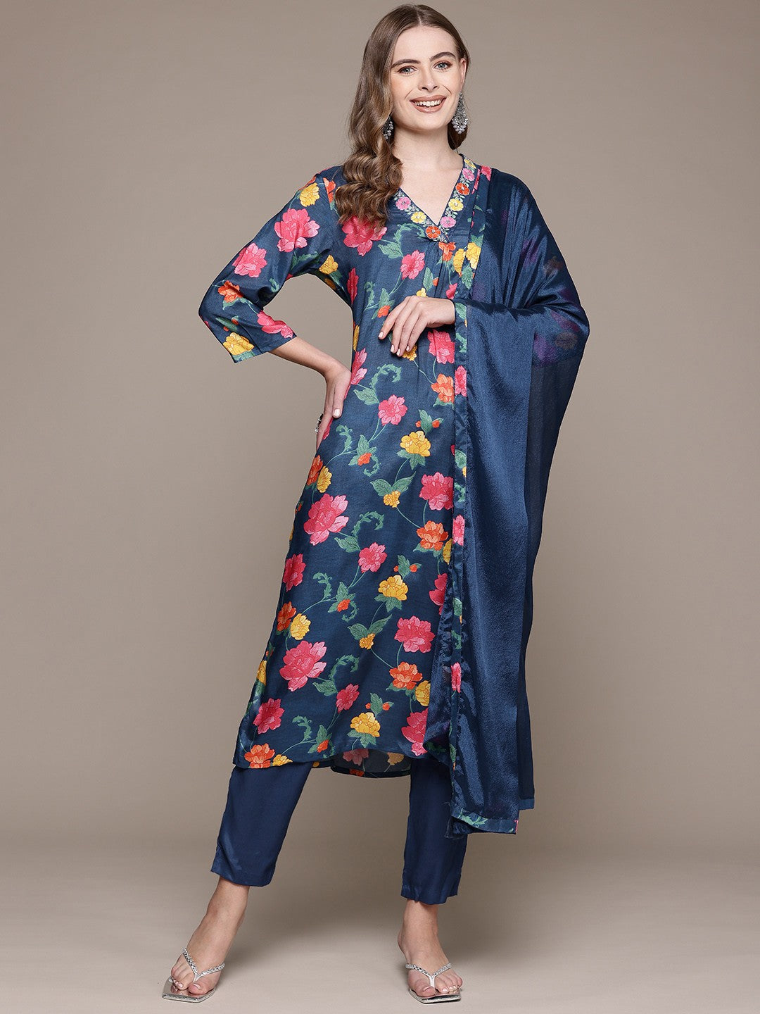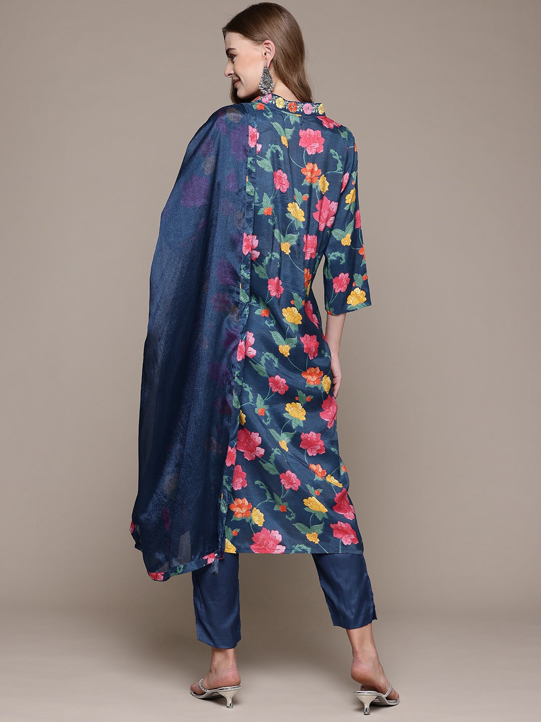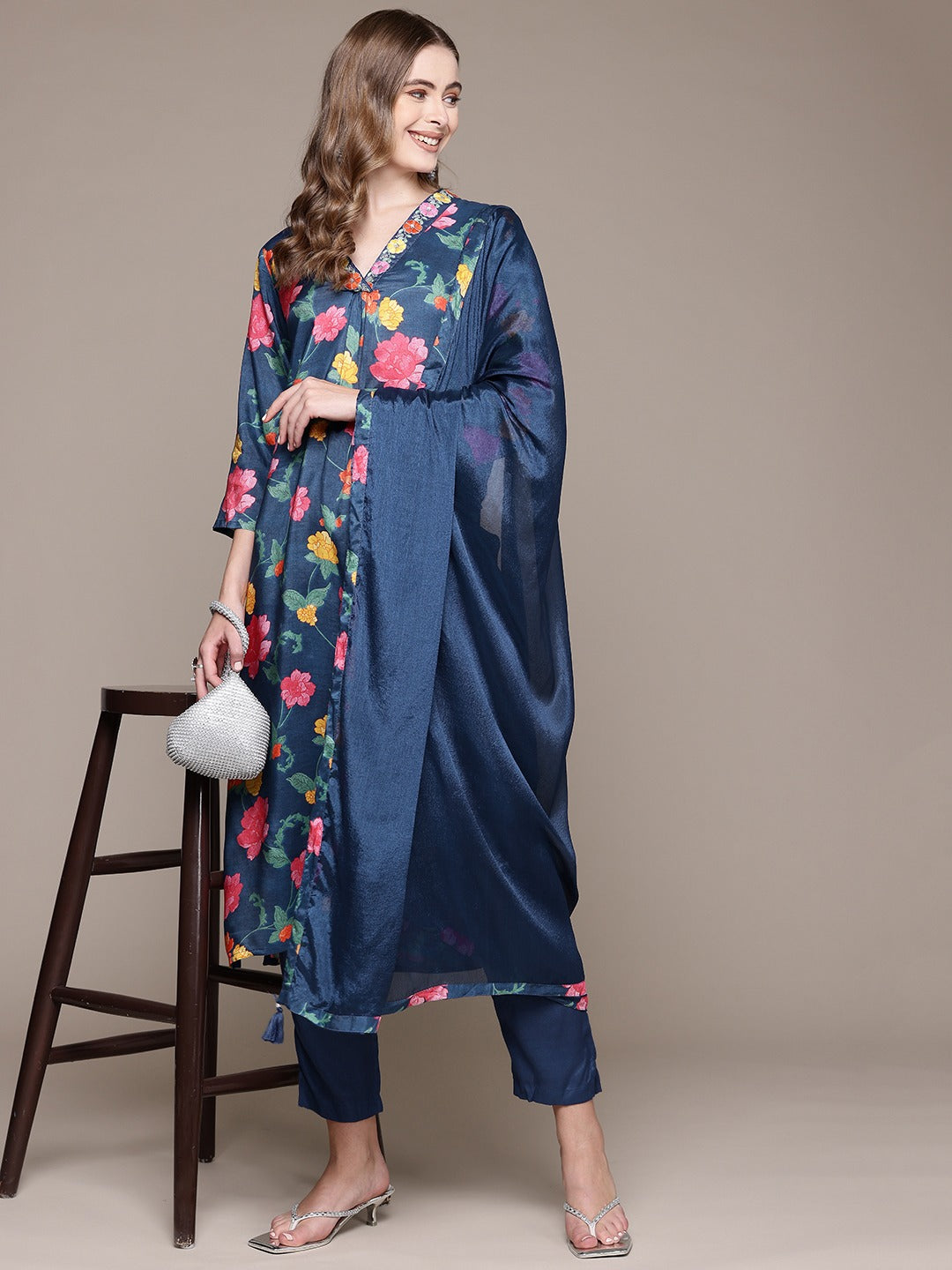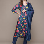 Straight Style Silk Fabric Blue Color Kurta With Bottom And Dupatta