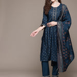 Straight Style Silk Fabric Navy Blue Color Kurta With Bottom And Dupatta