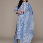 Straight Style Cotton Fabric Blue Color Kurta With Bottom And Dupatta
