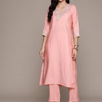 Straight Style Silk Fabric Peach Color Kurta And Bottom