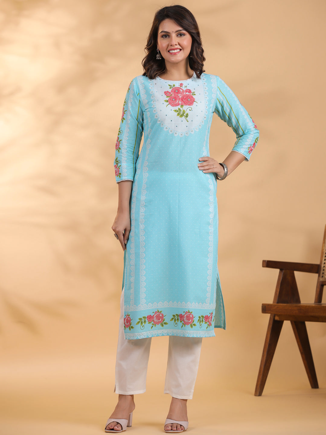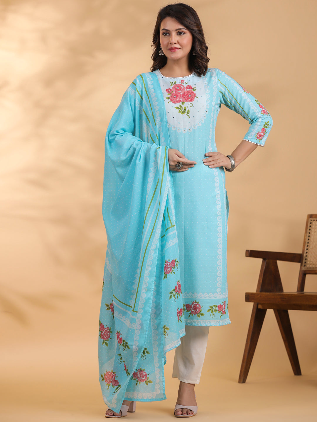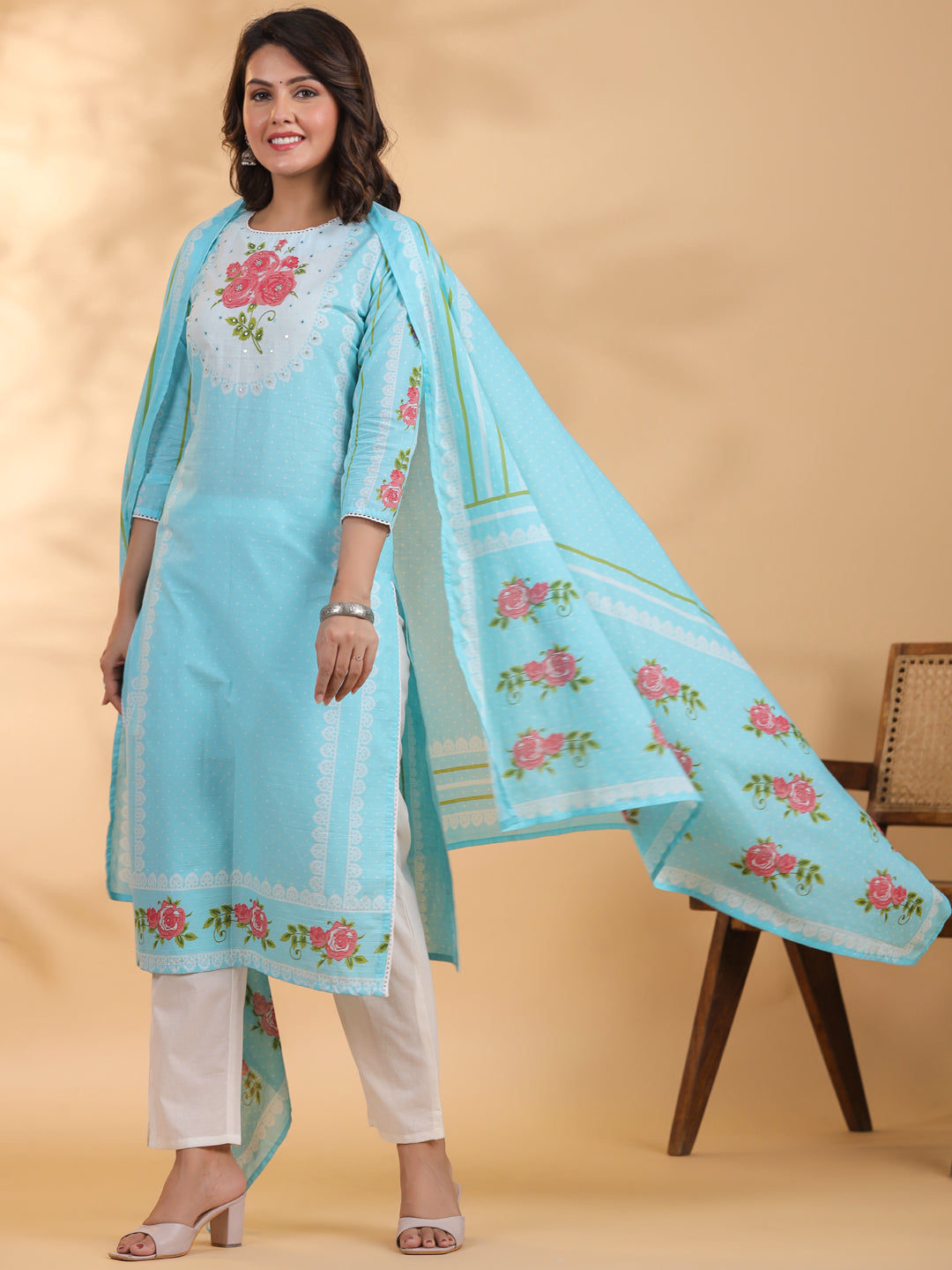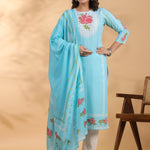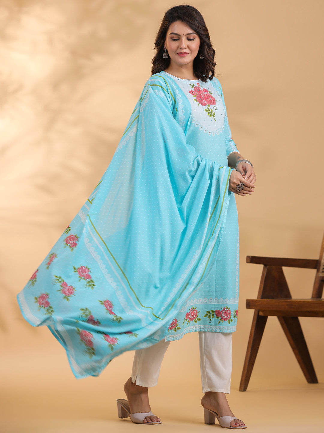 Straight style Cotton fabric Blue color kurta and Bottom with Dupatta