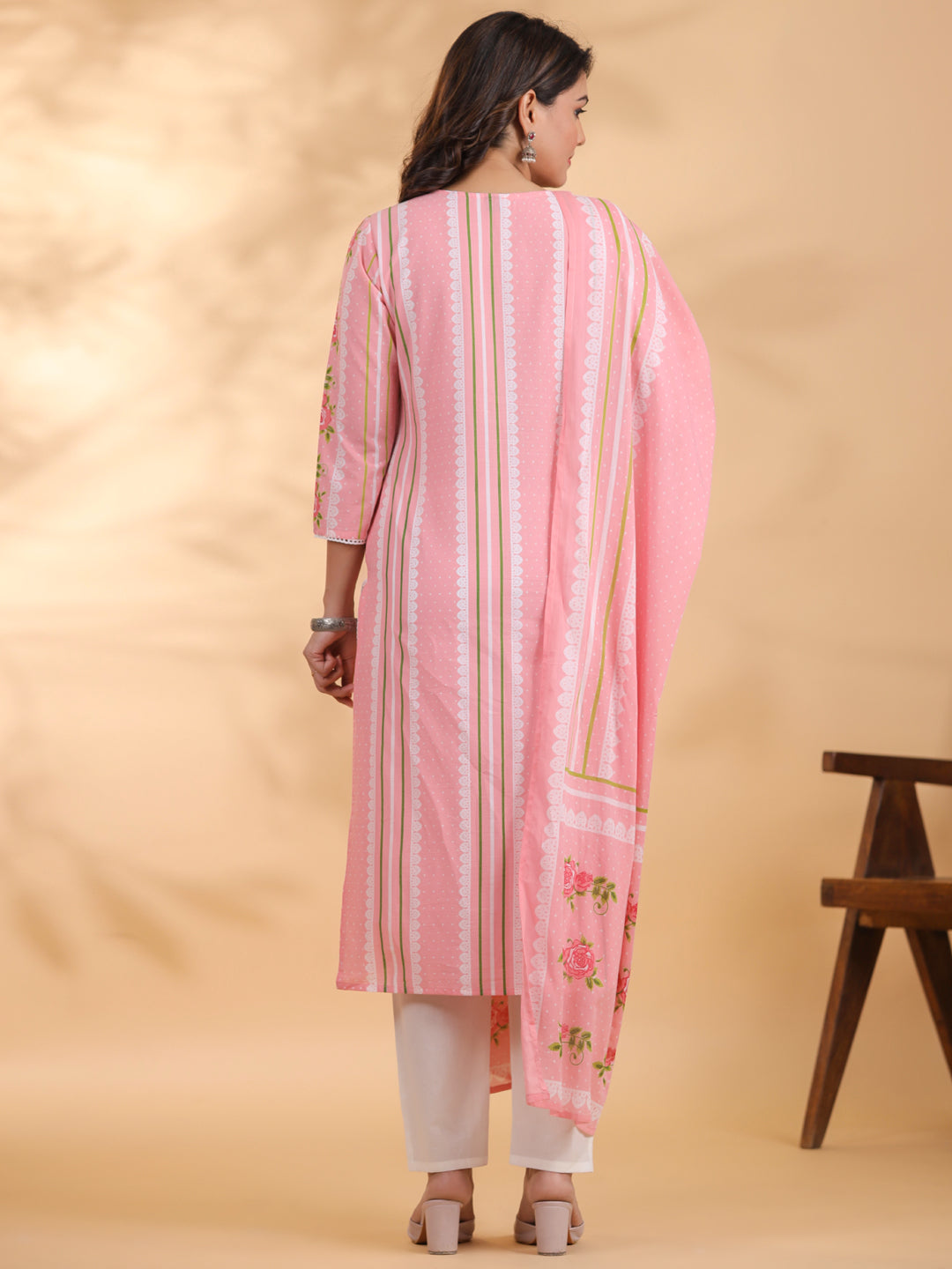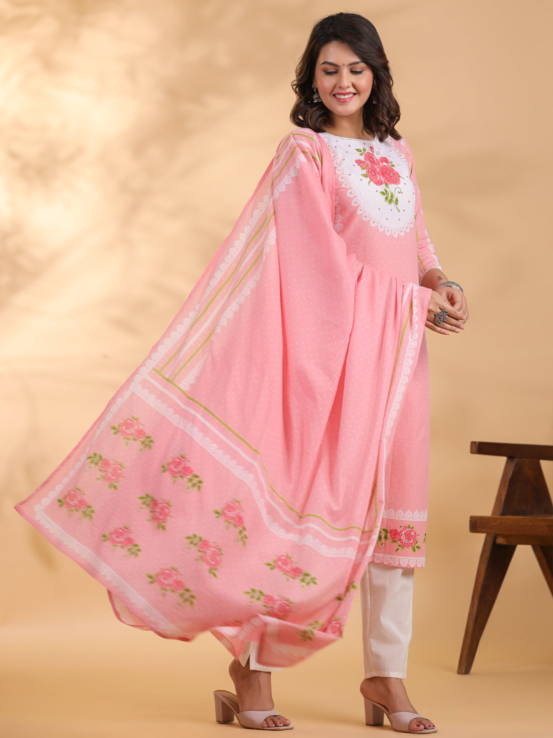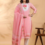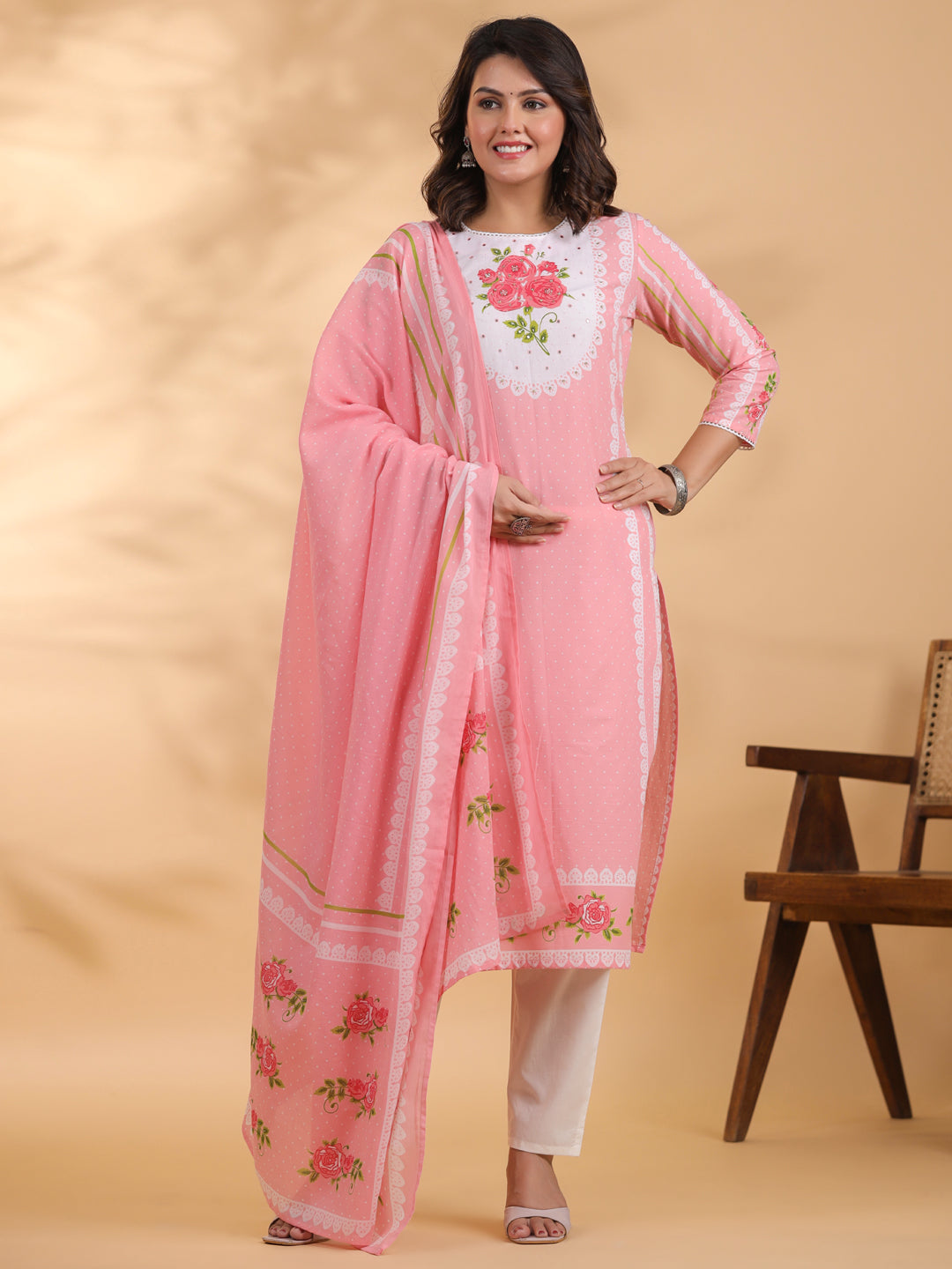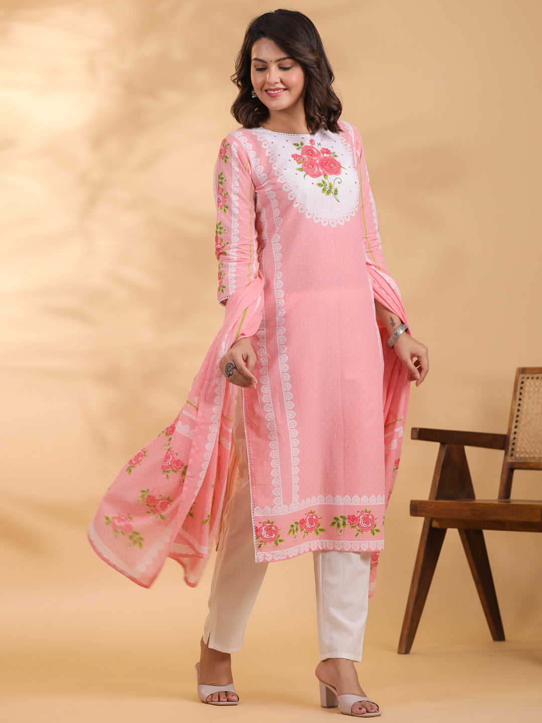 Straight style Cotton fabric Pink color kurta and Bottom with Dupatta