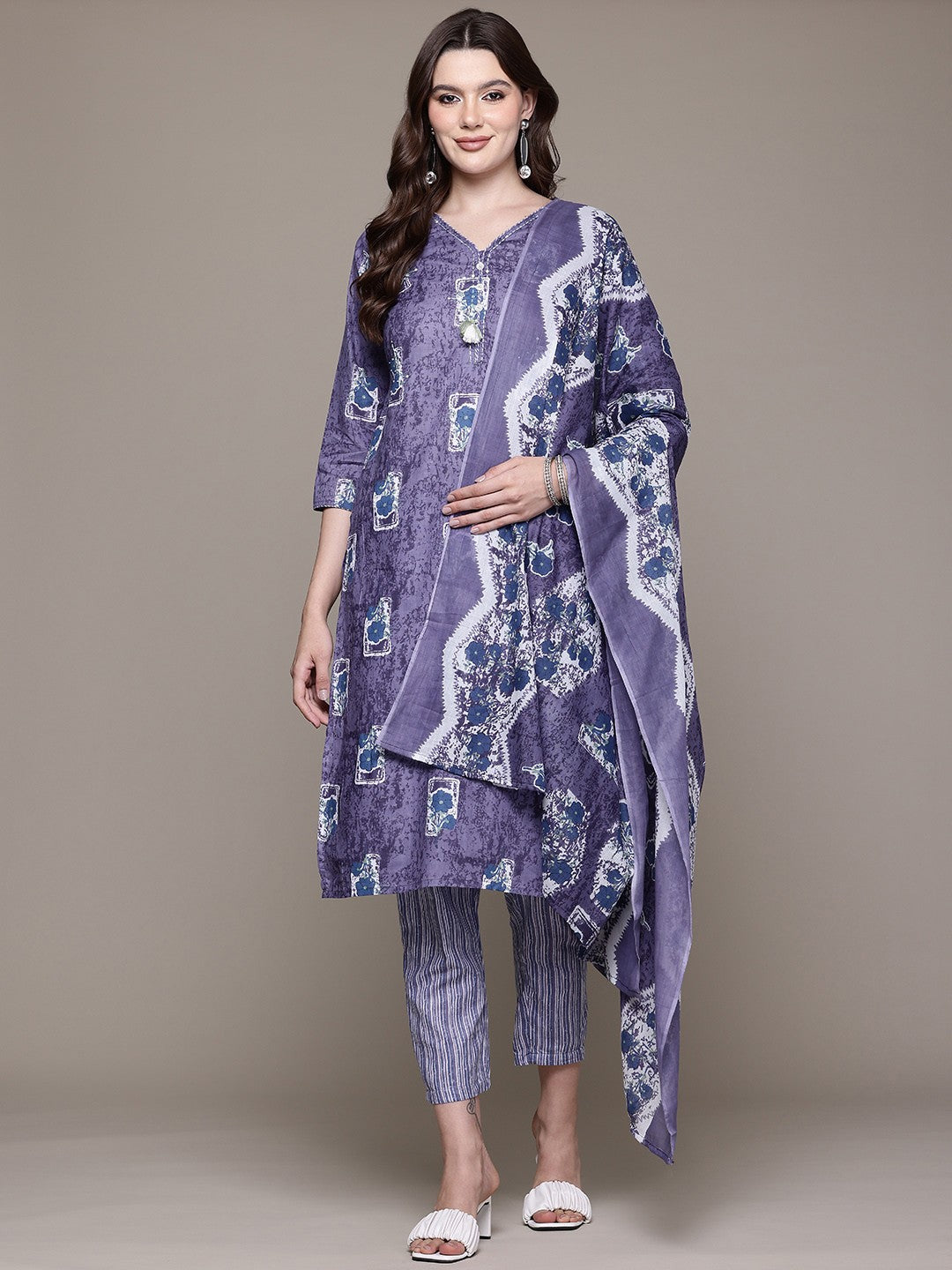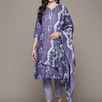 Straight style Cotton fabric Navy Blue color kurta with Bottom and Dupatta