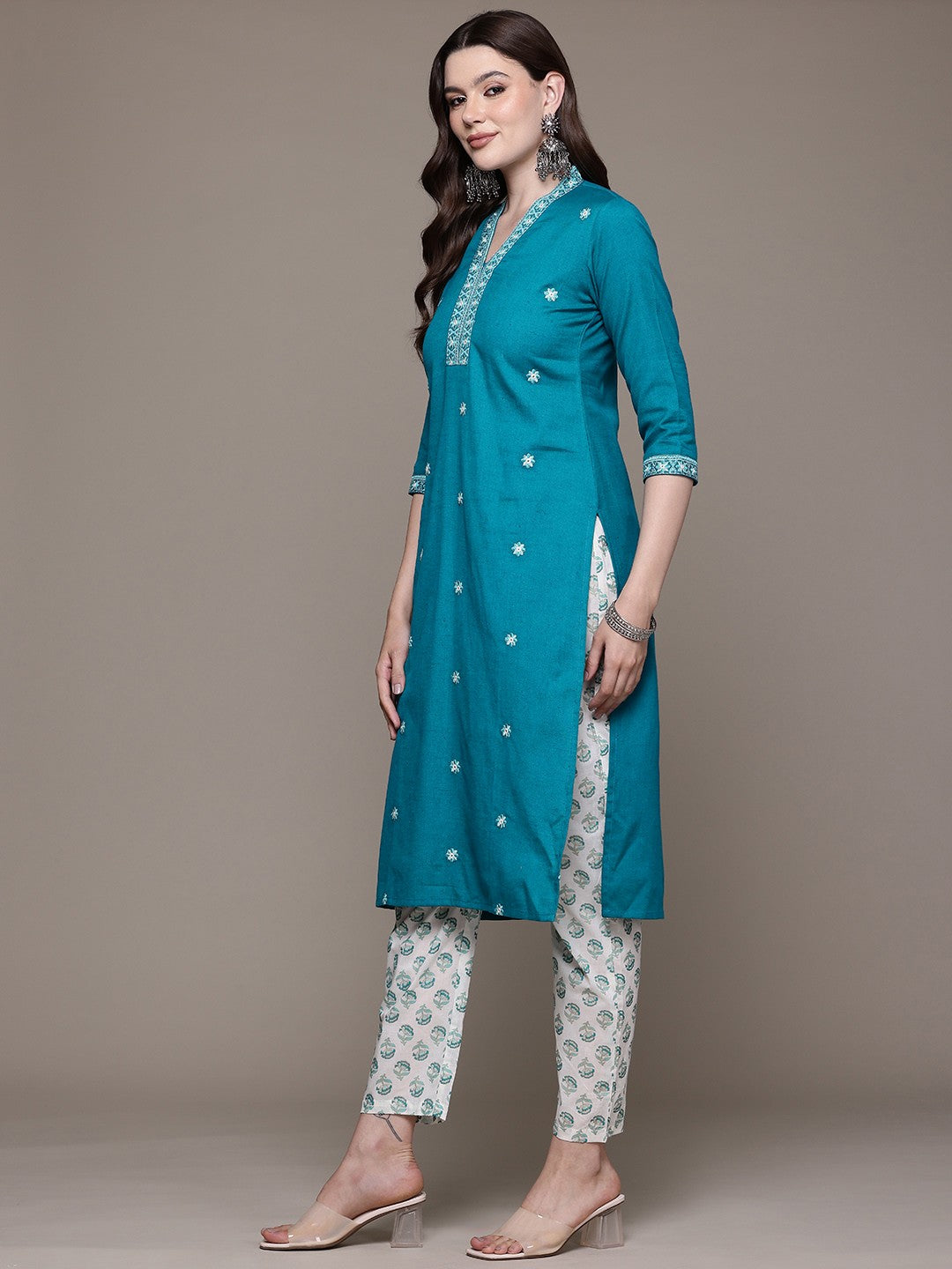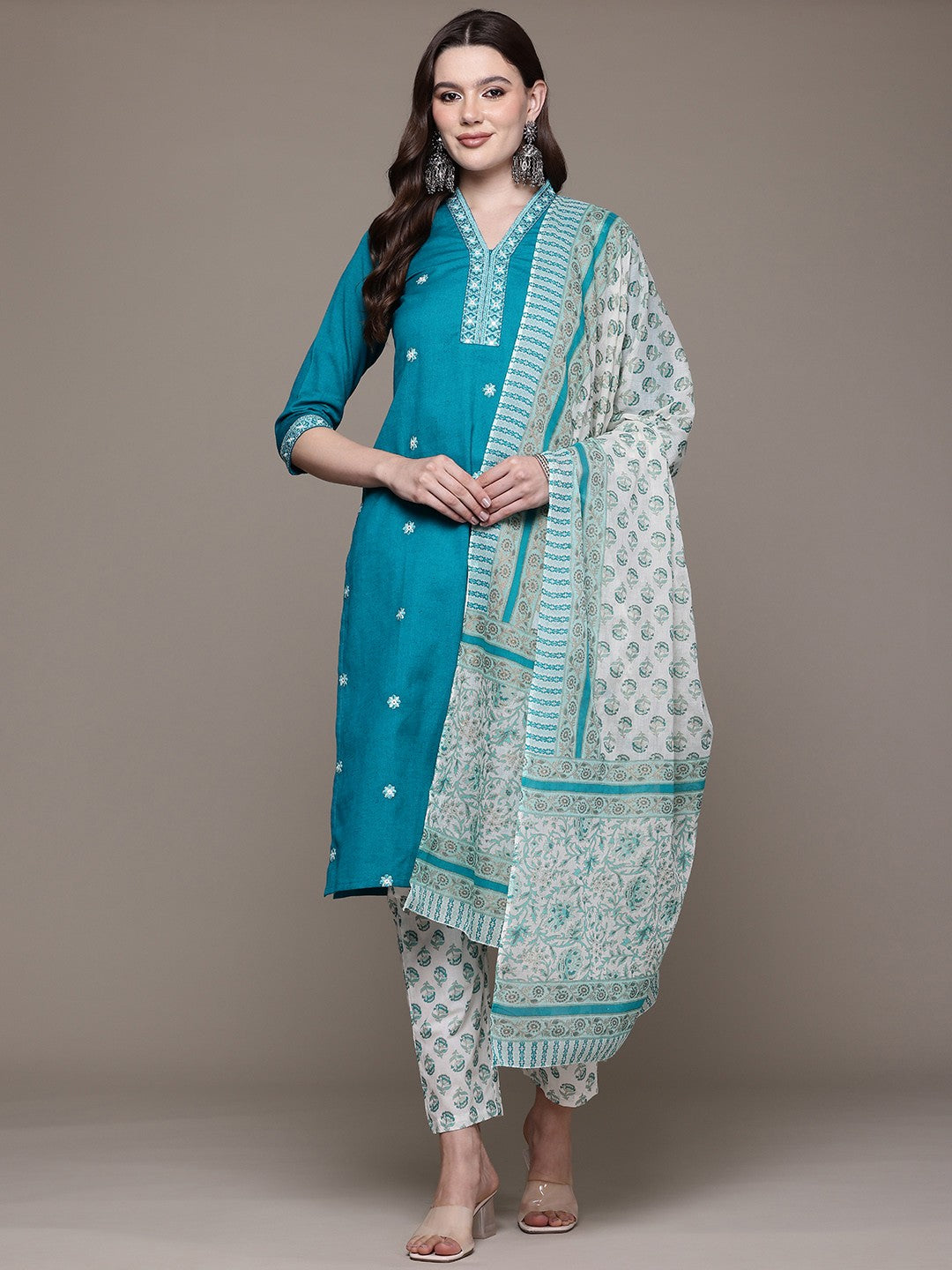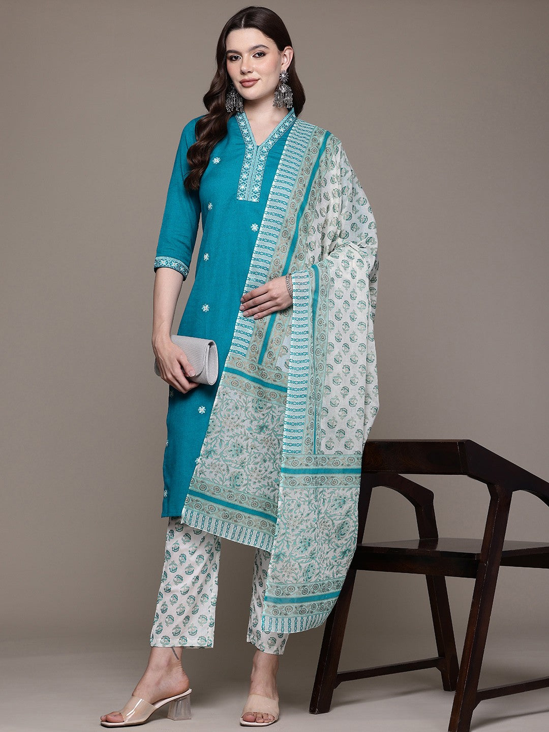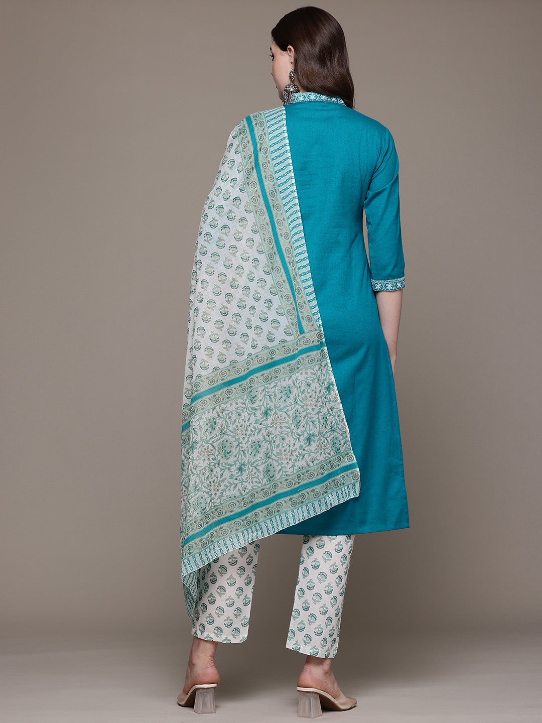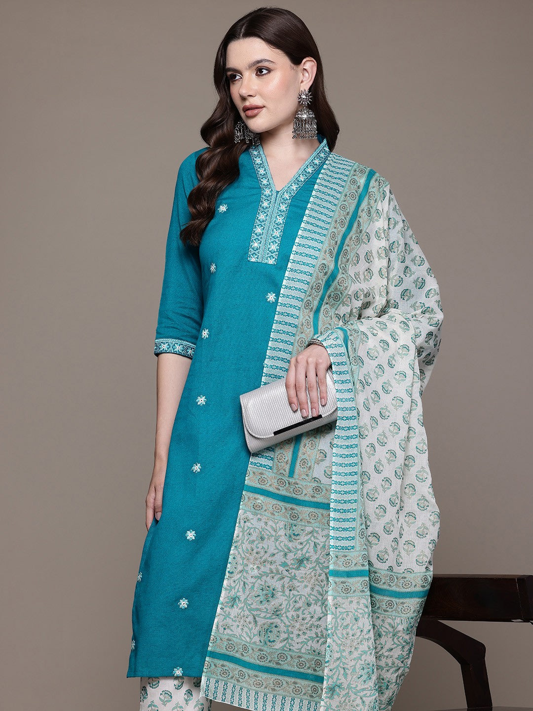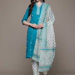 Straight style Cotton fabric Teal color kurta with Bottom and Dupatta