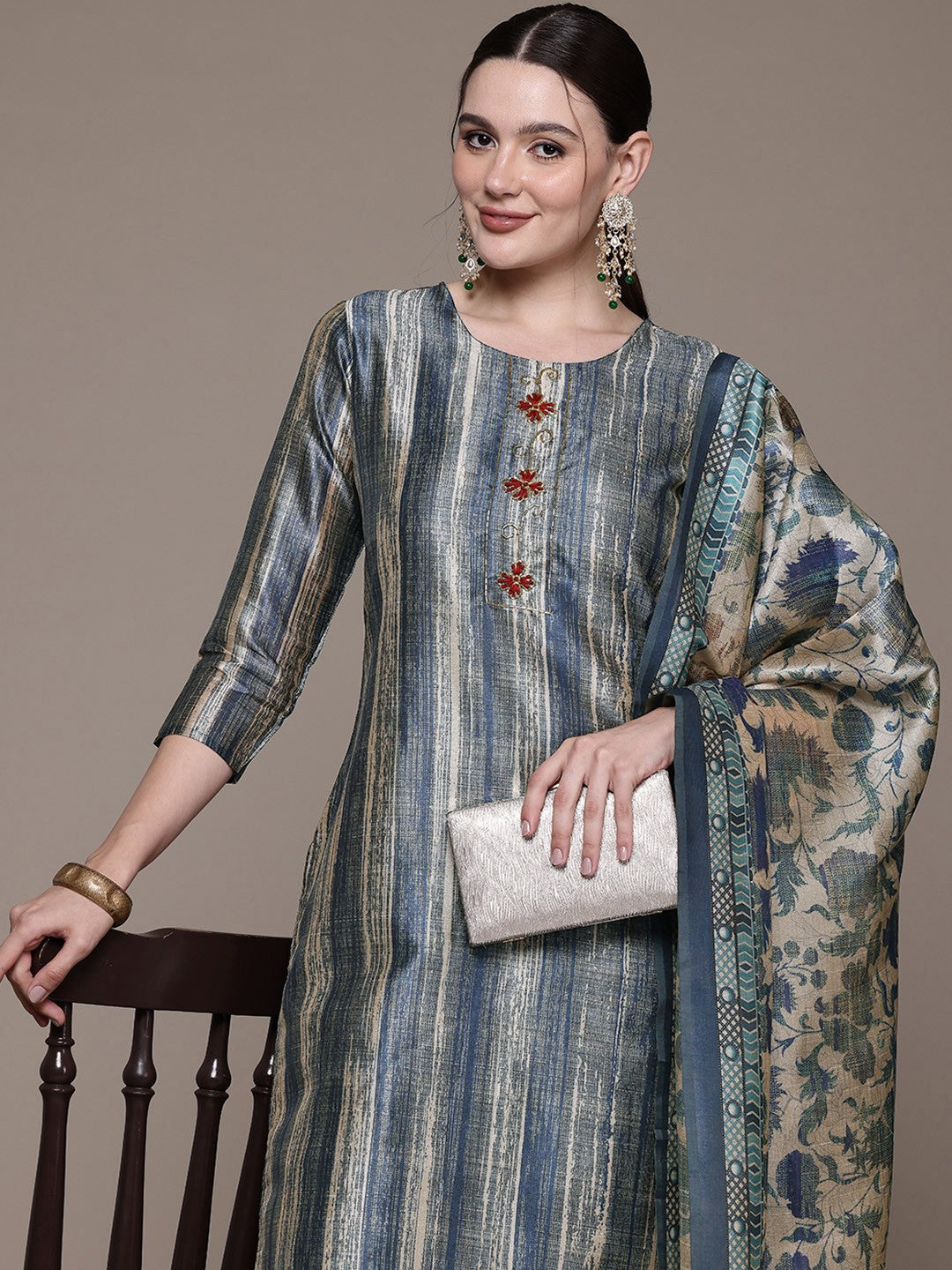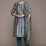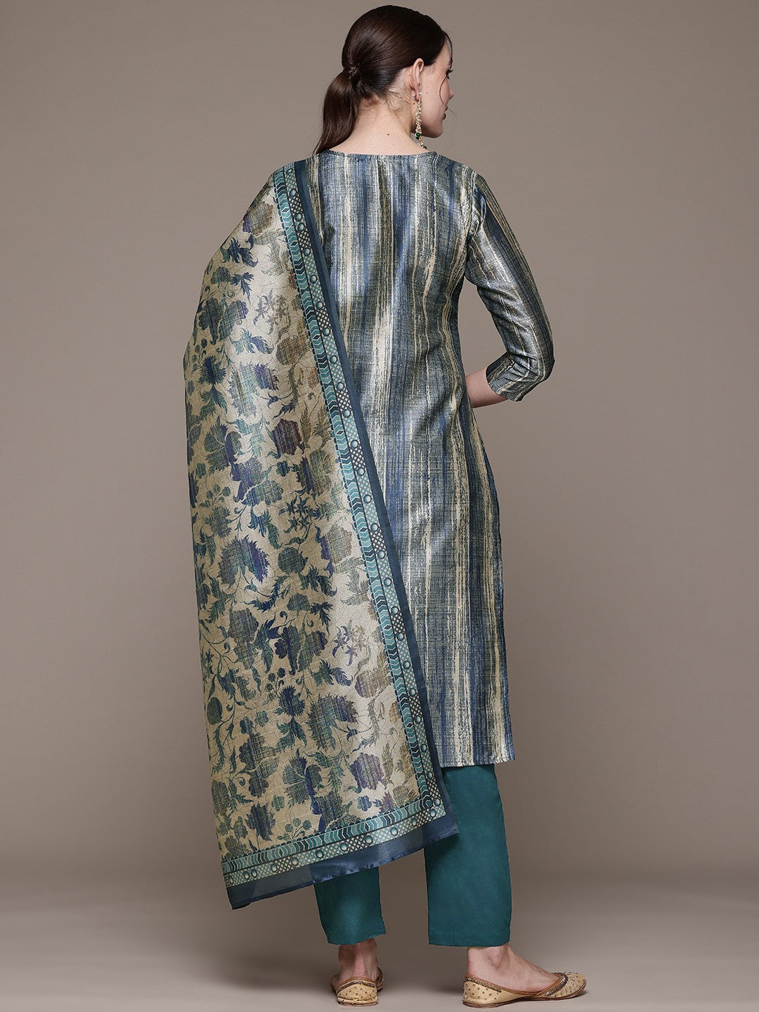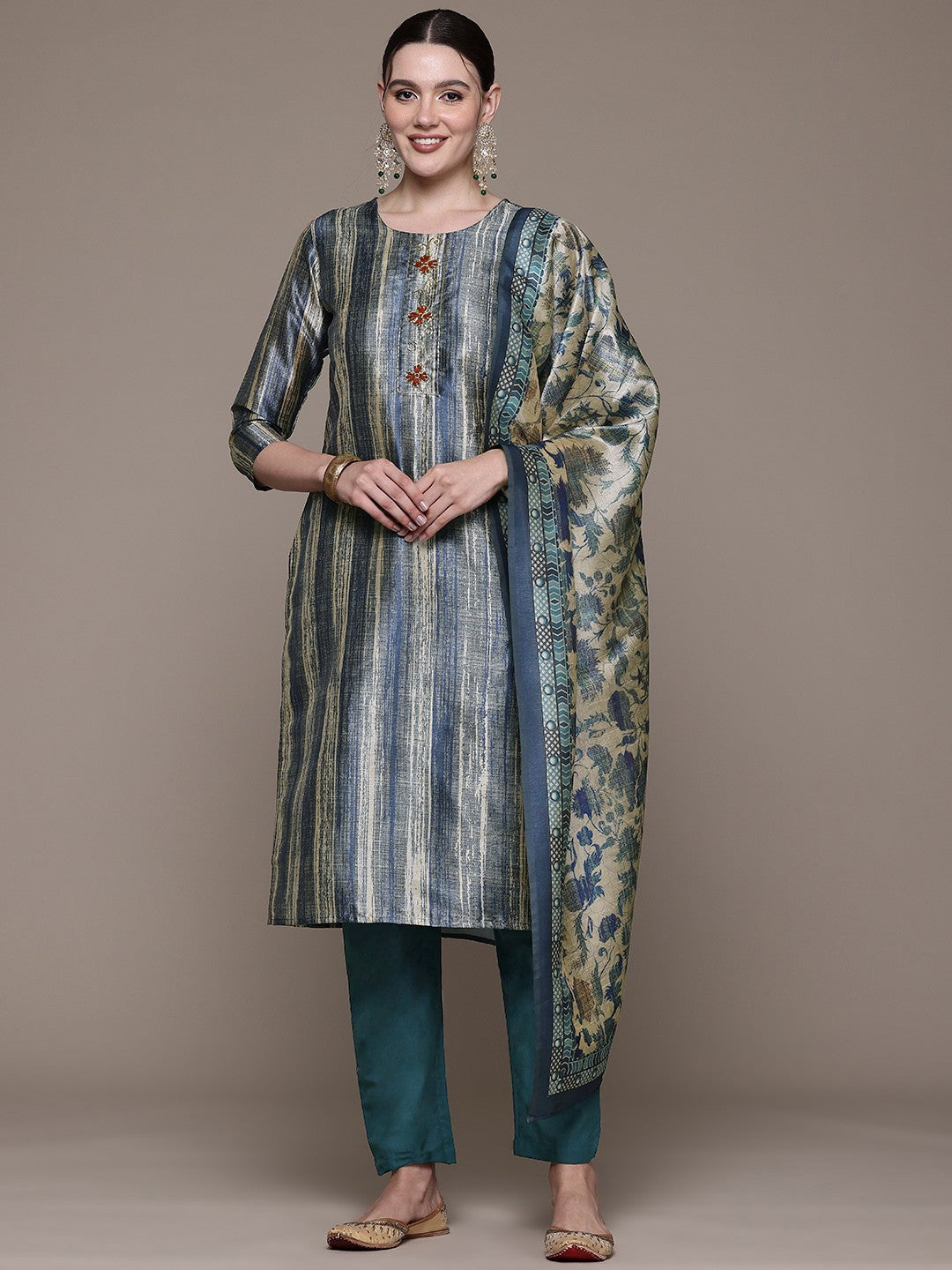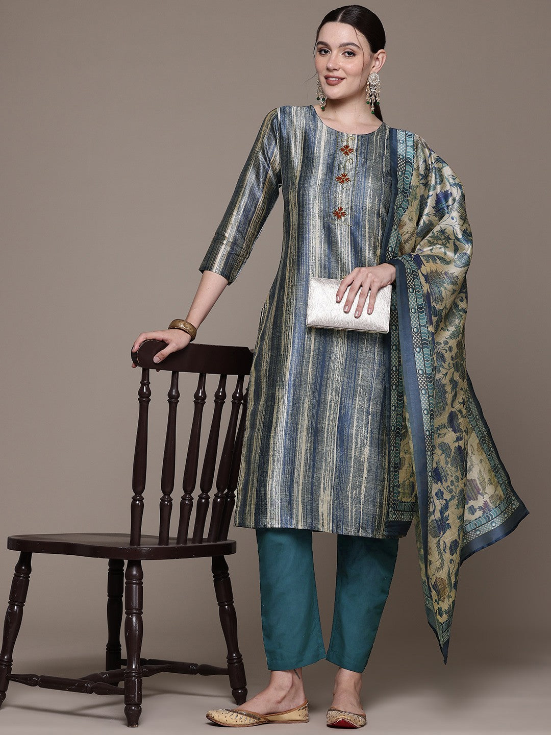 Straight style Silk fabric Teal color kurta with Bottom and Dupatta