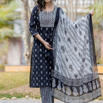 Straight Style Cotton Fabric Black Color Embroidered Printed Kurti With Palazzo And Dupatta