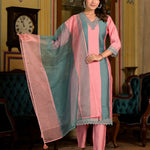 Straight Style Silk Fabric Teal And Mauve Color Colourblocked Kurti With Lace Work With Palazzo And Dupatta