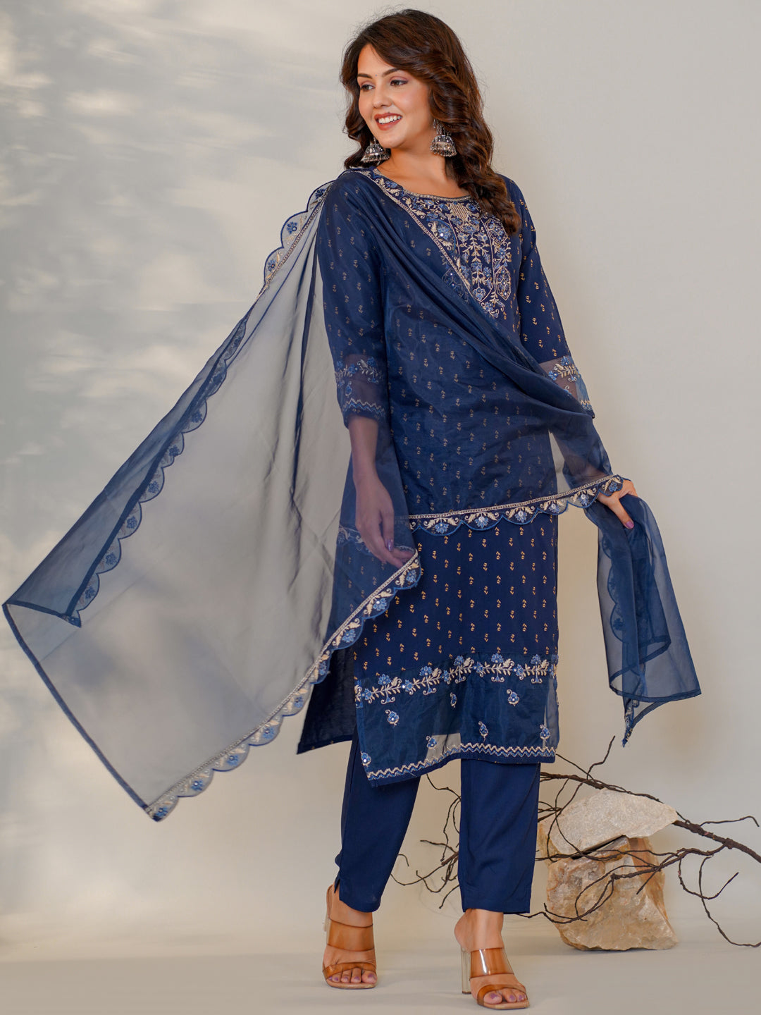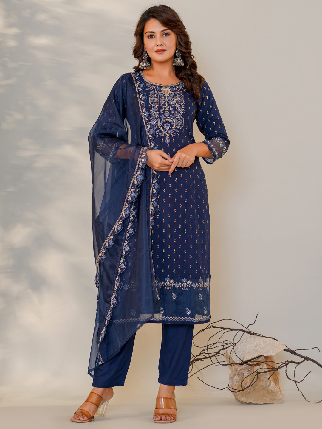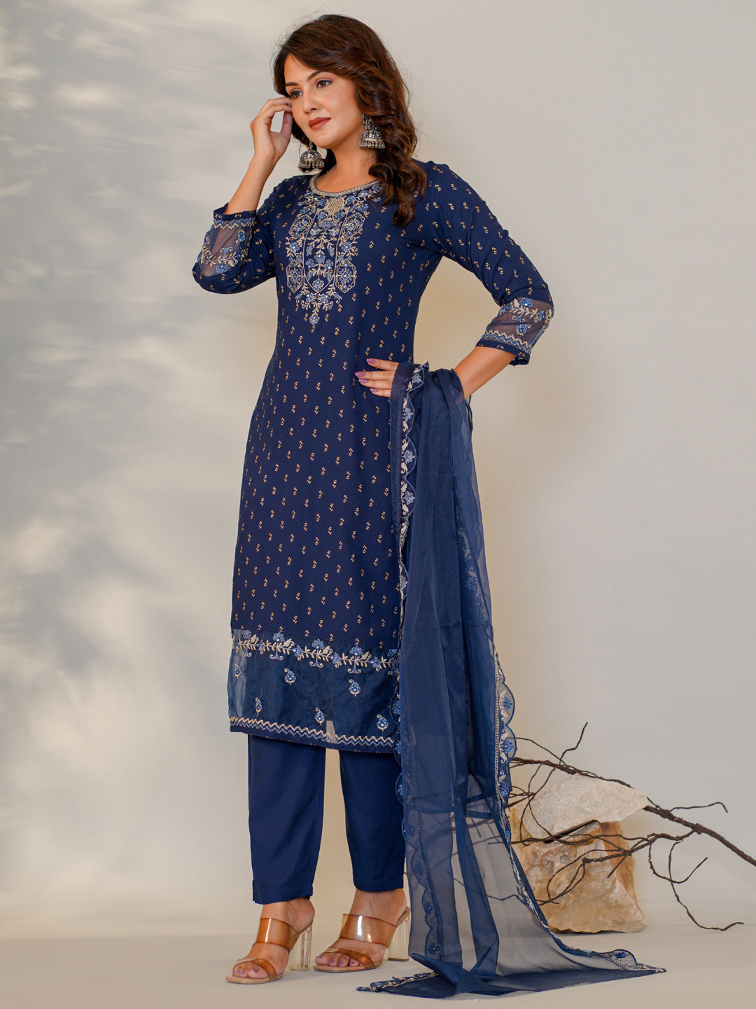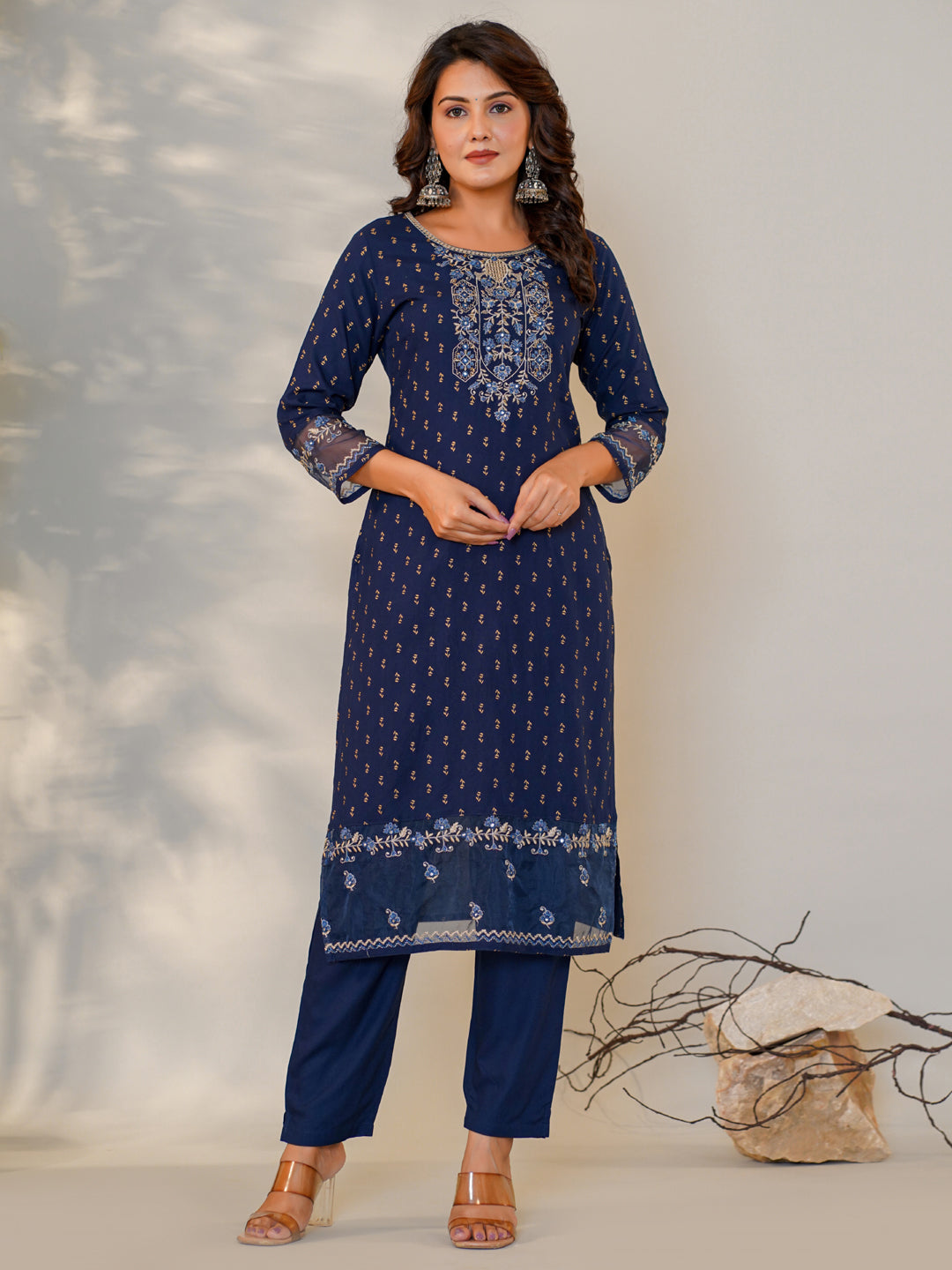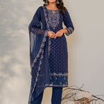 Straight Style Rayon Fabric Navy Blue Color Embroidered Kurti With Palazzo And Dupatta