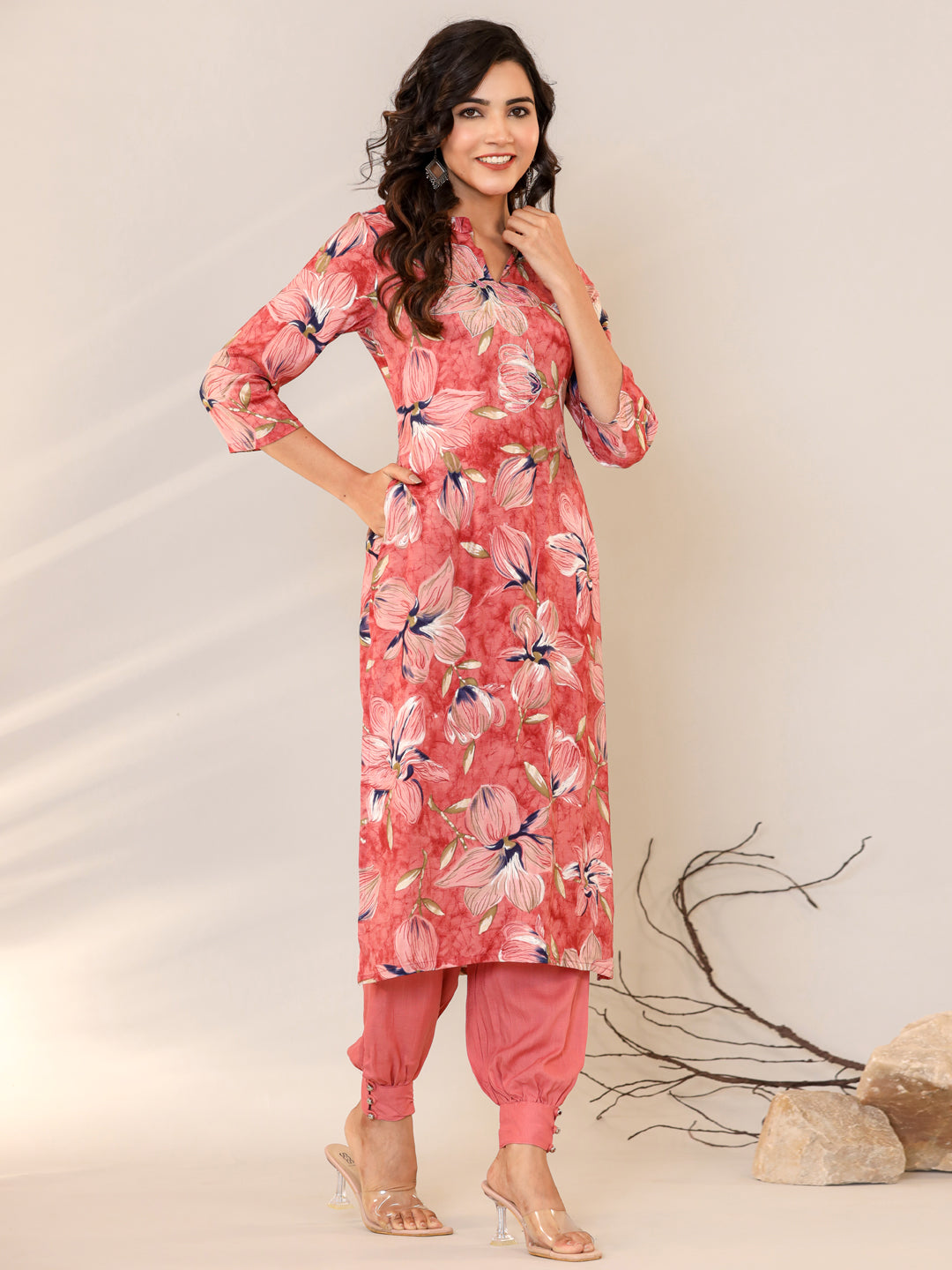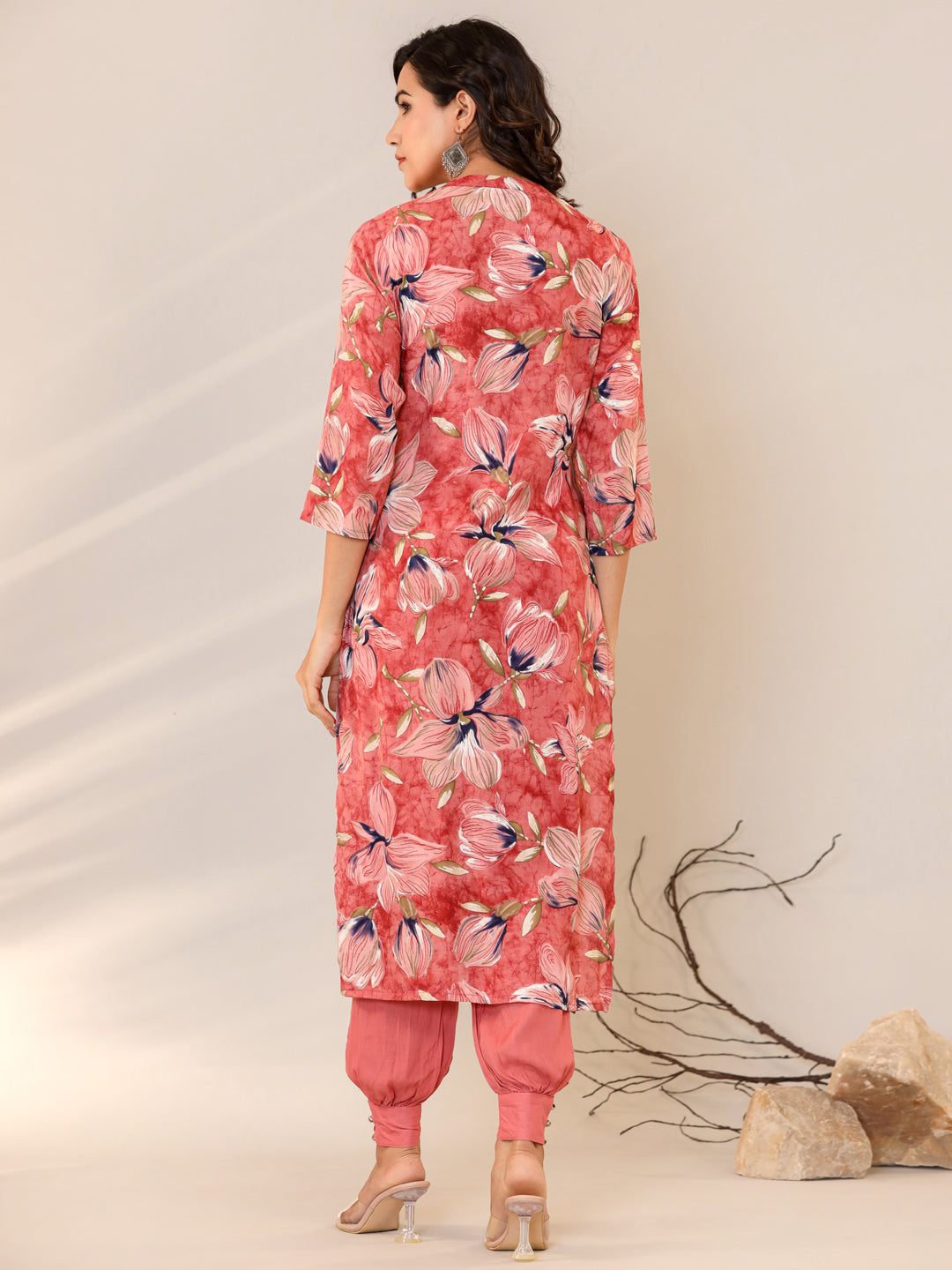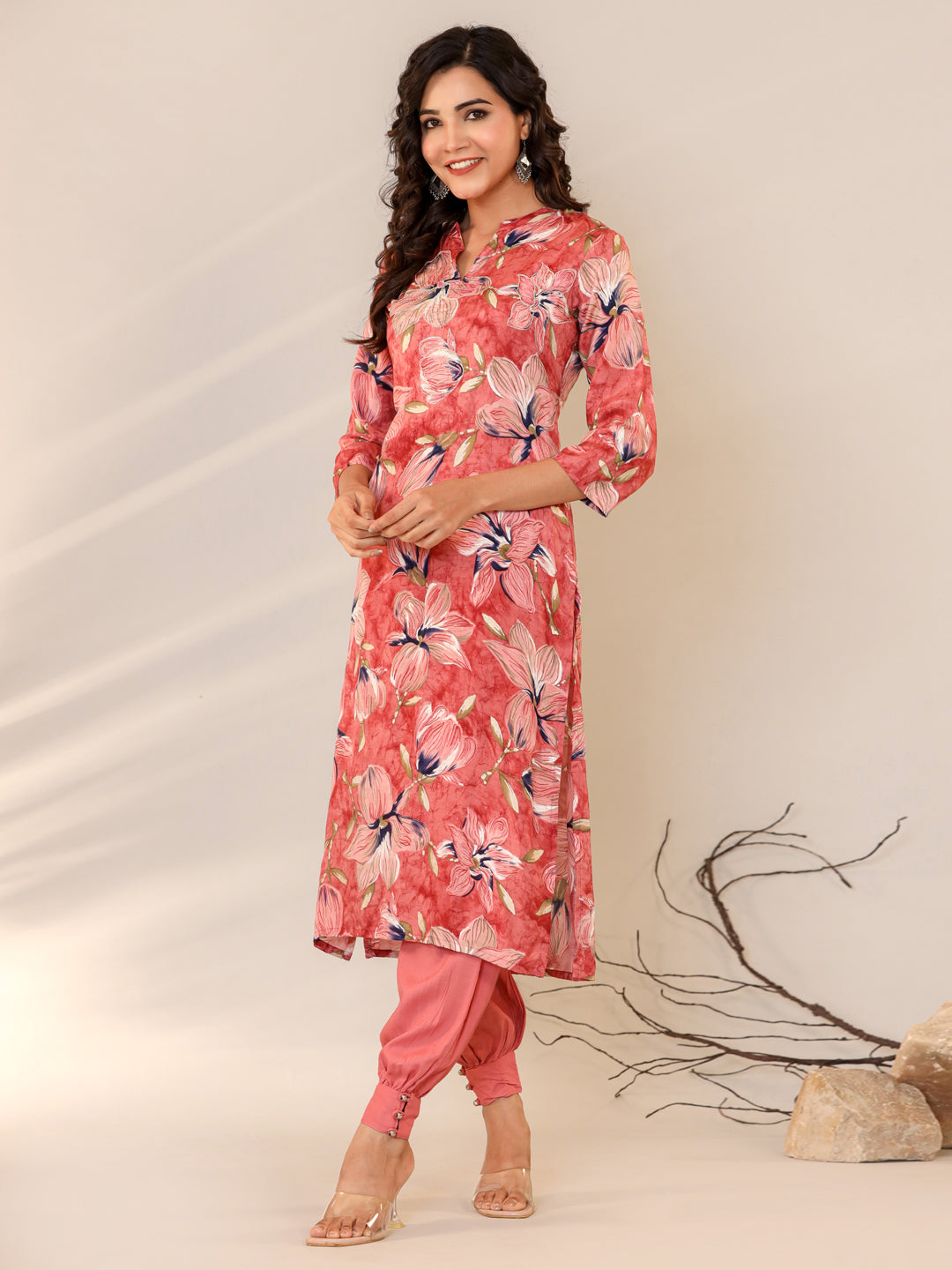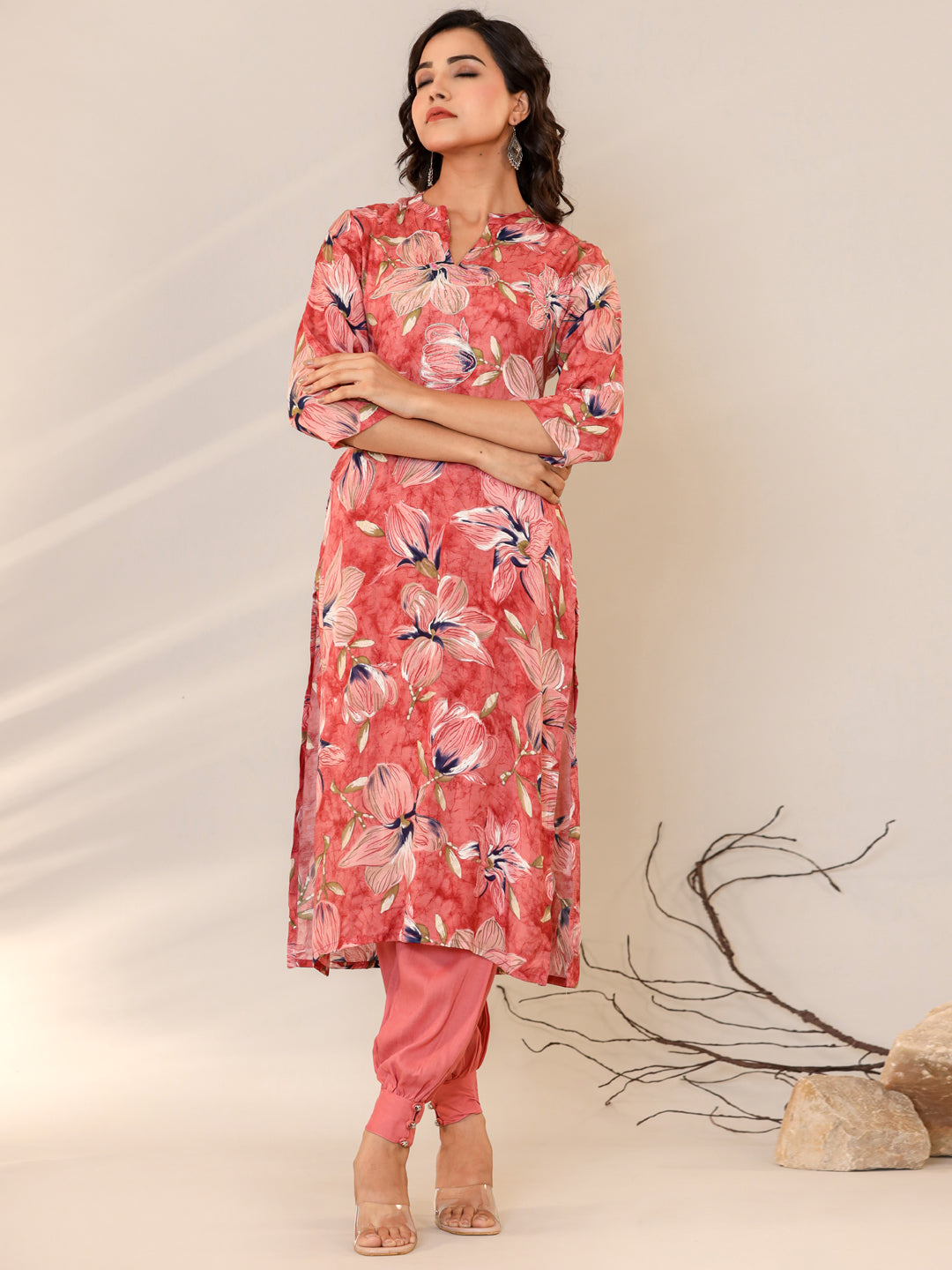 Straight Style Silk Fabric Mauve Color Floral Printed Kurti And Bottom With Beads Work