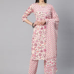 Straight Style Cotton Fabric Cream Color Floral Printed Kurti With Palazzo And Dupatta