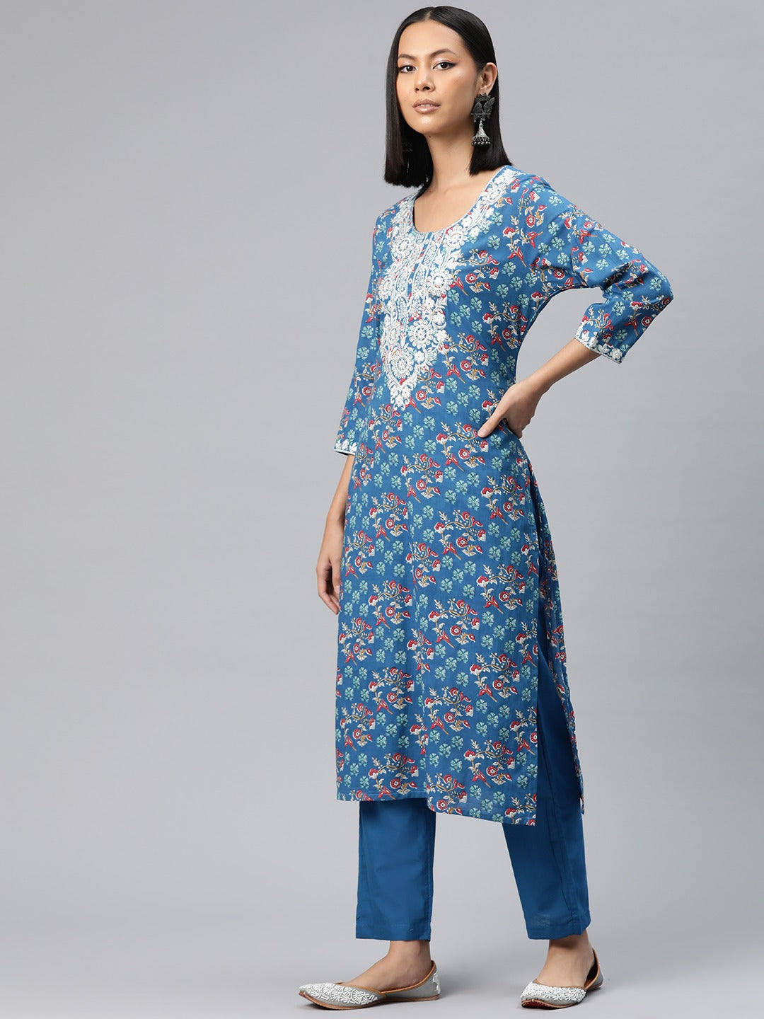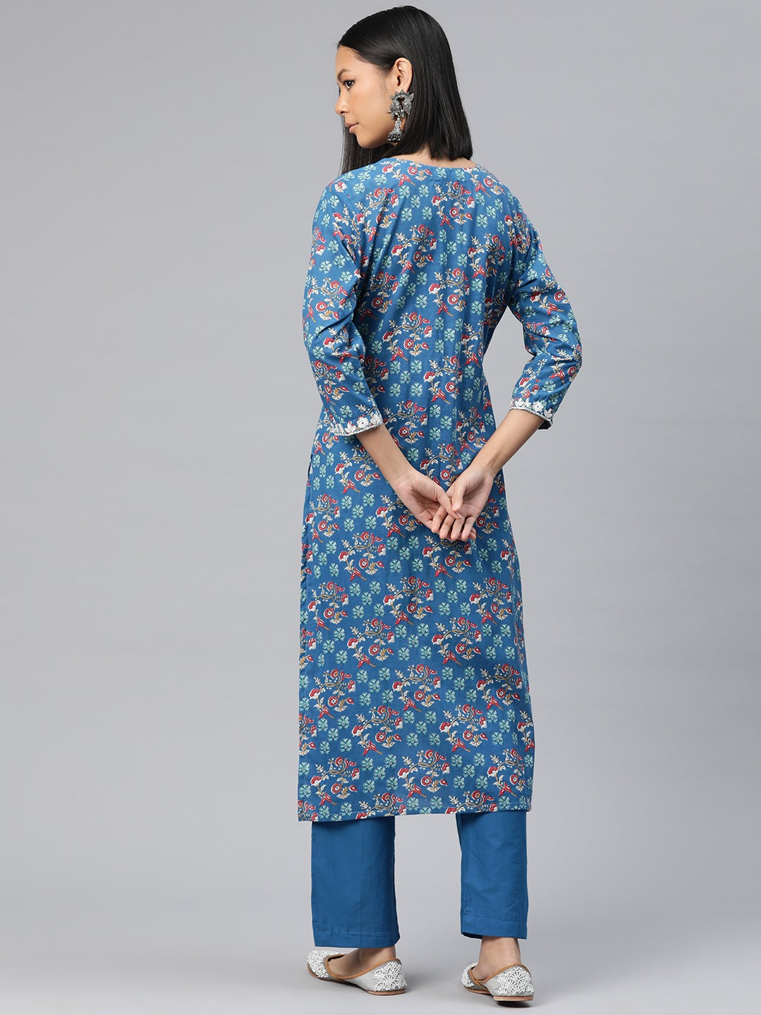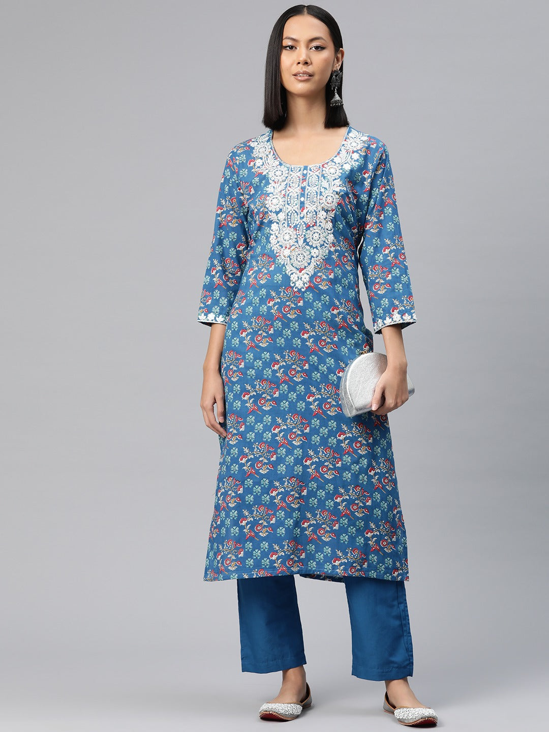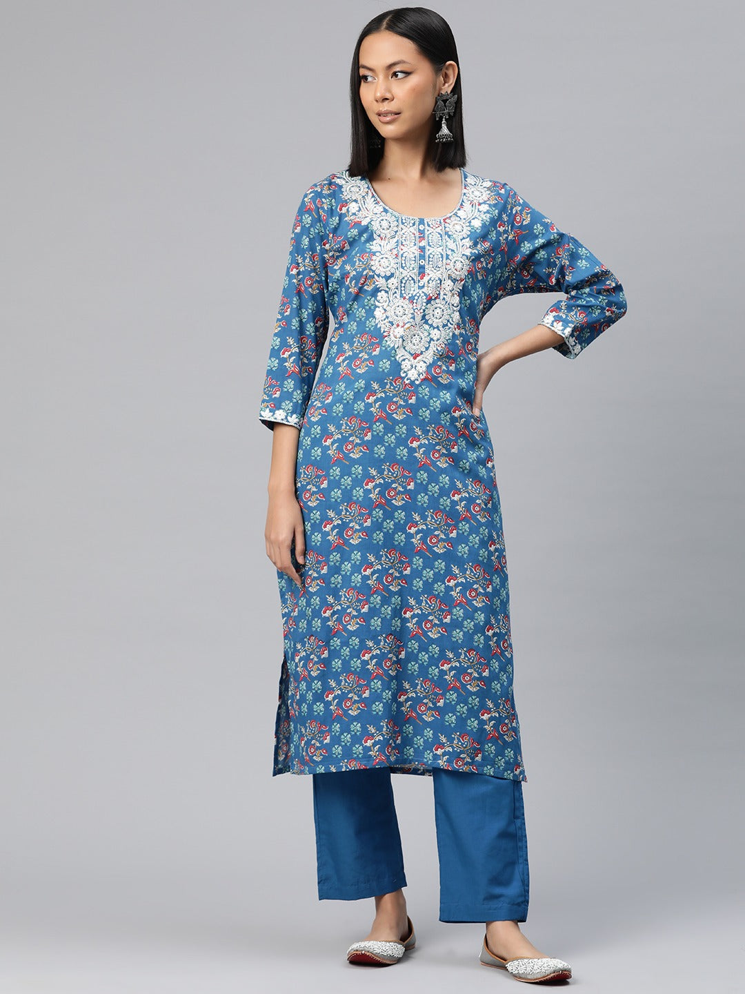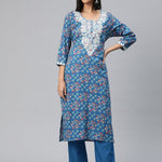 Straight Style Cotton Fabric Blue Color Printed Kurti With Palazzo