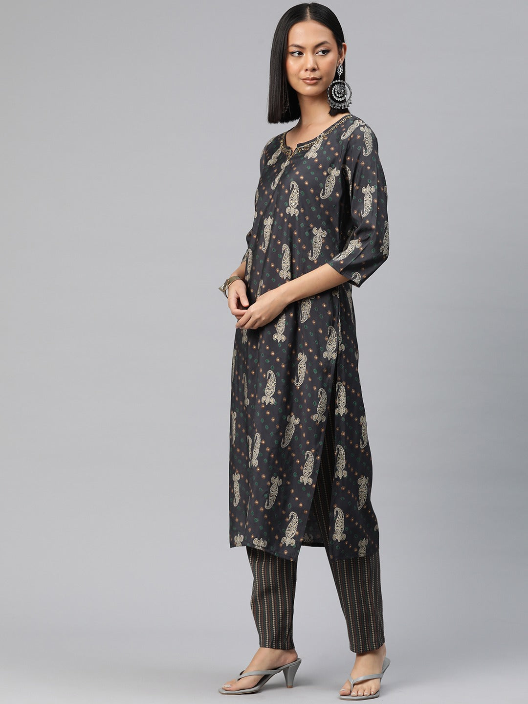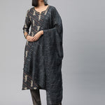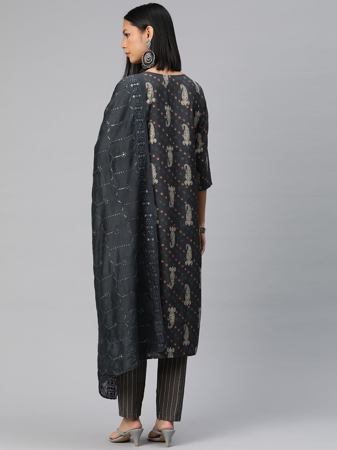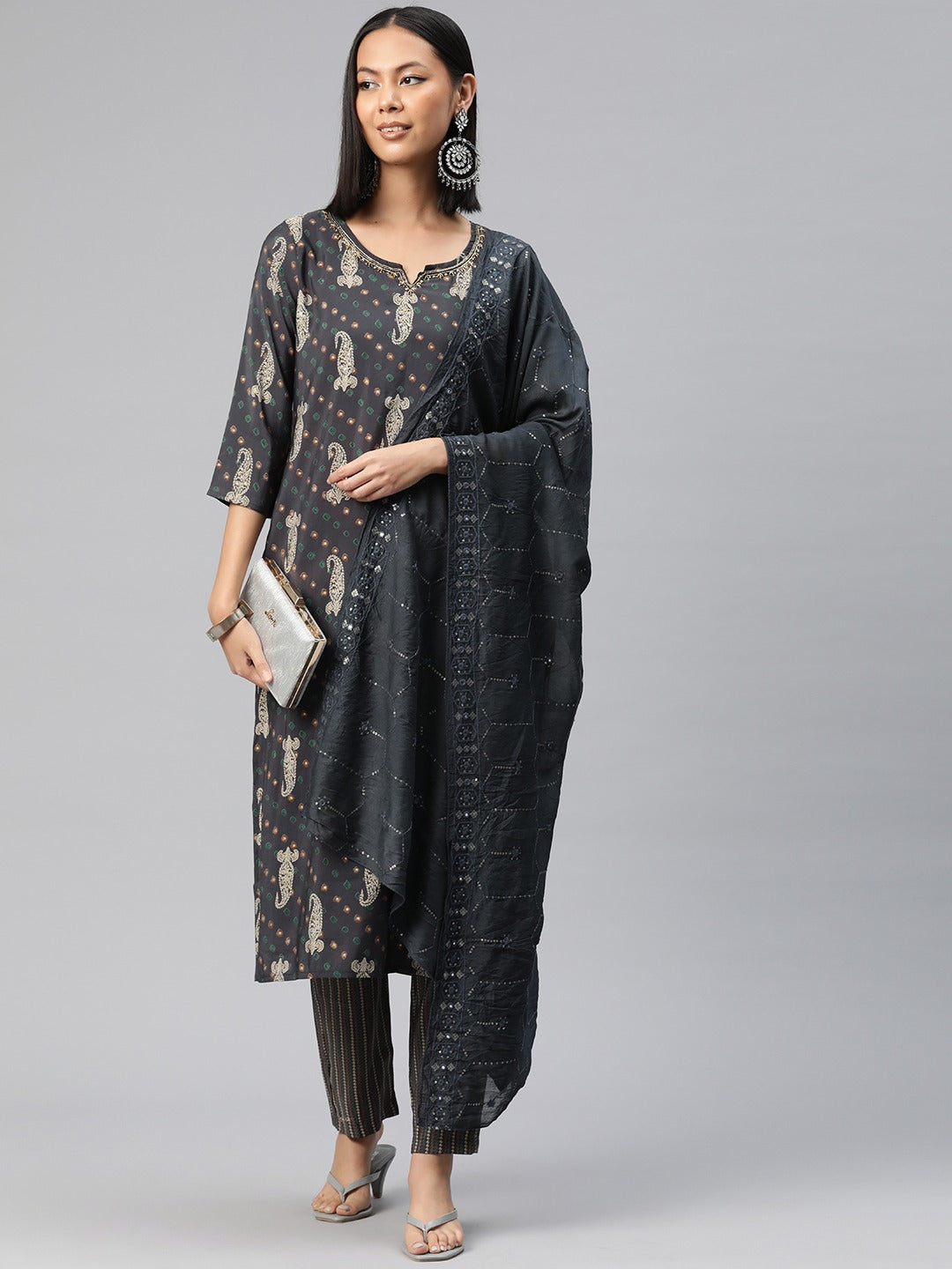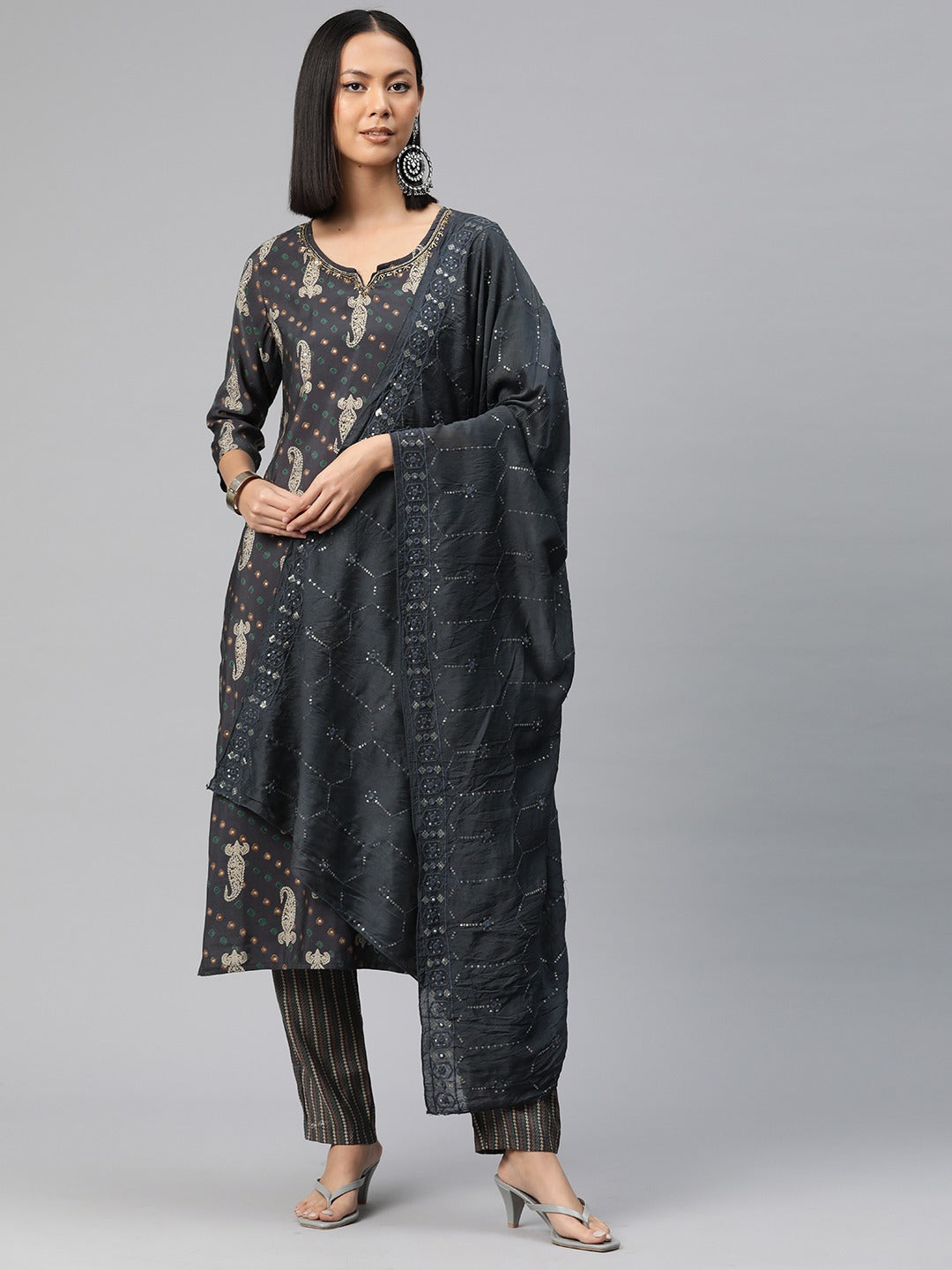 Straight Style Silk Fabric Grey Color Printed Kurti With Palazzo And Dupatta With Sequence Work