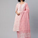 Straight Style Cotton Fabric Pink Color Floral Printed Kurti With Palazzo And Dupatta