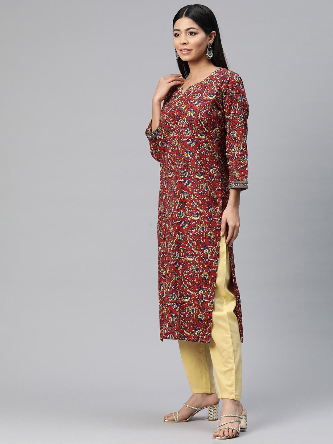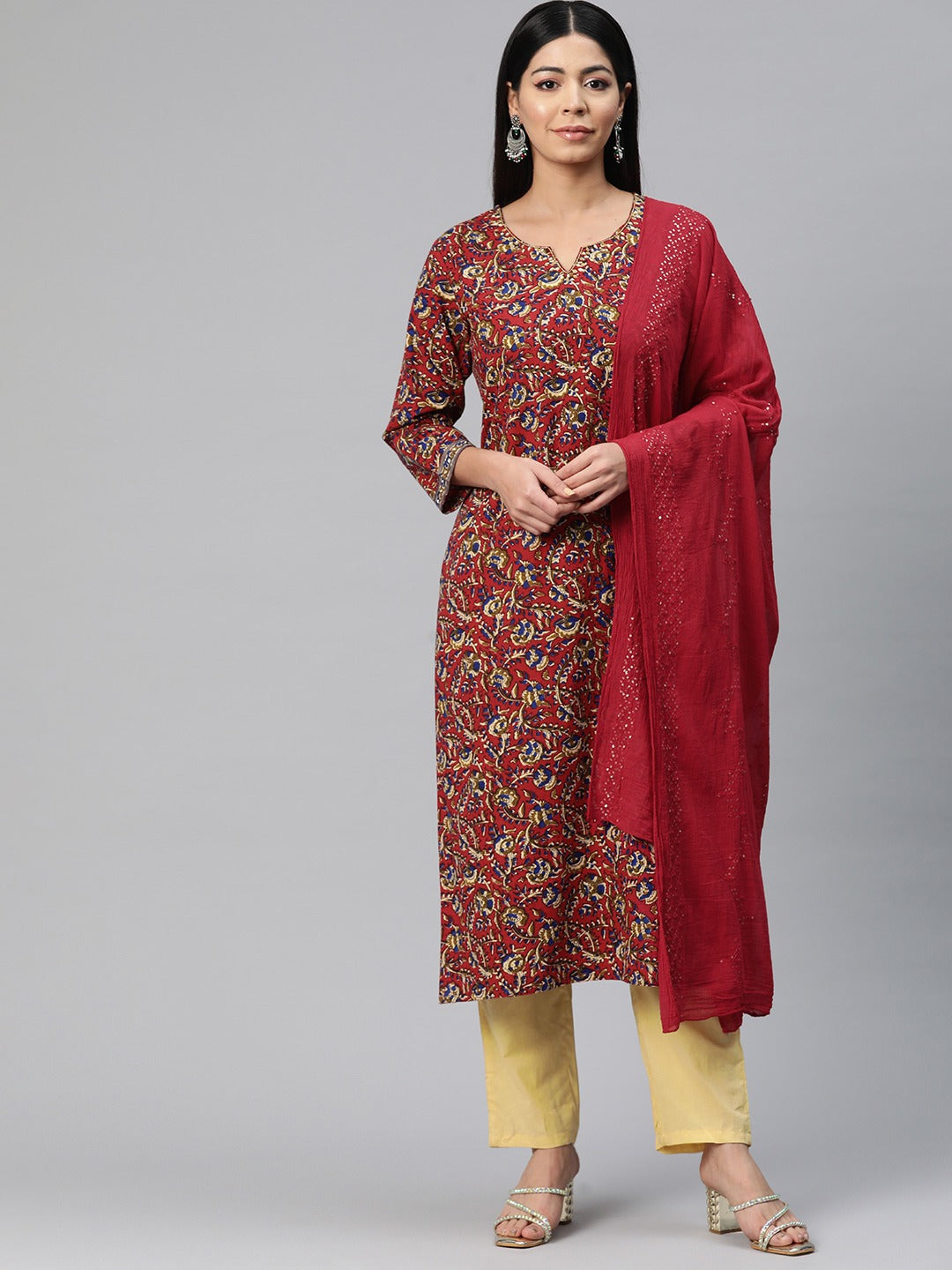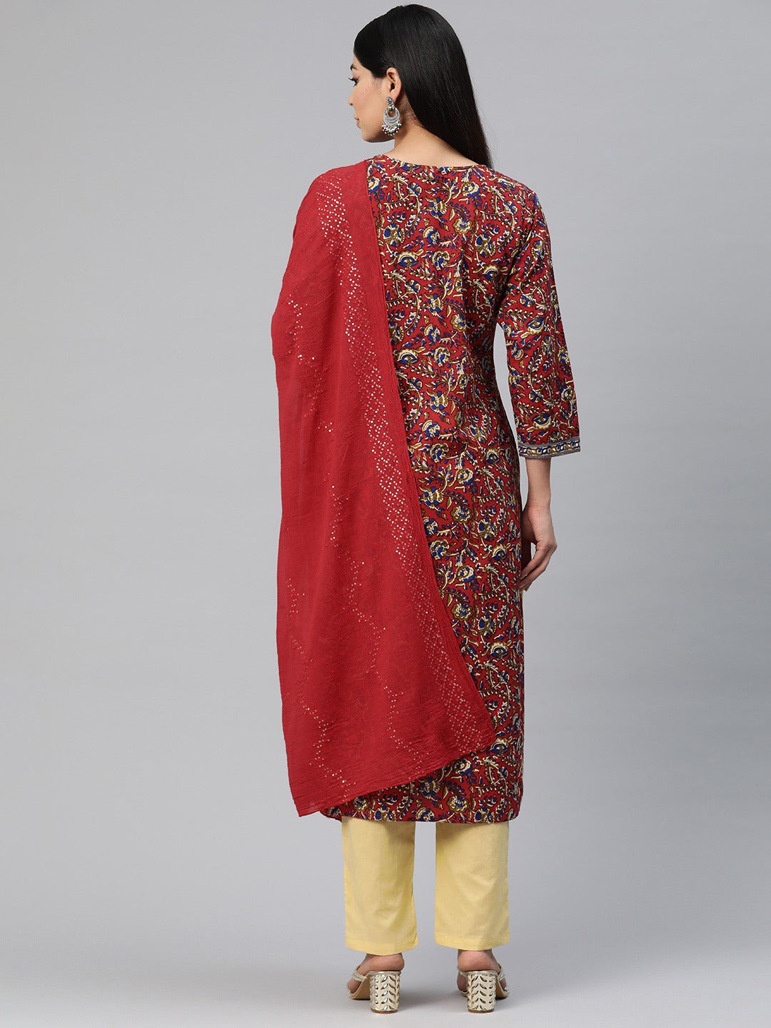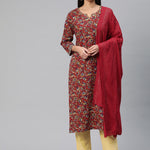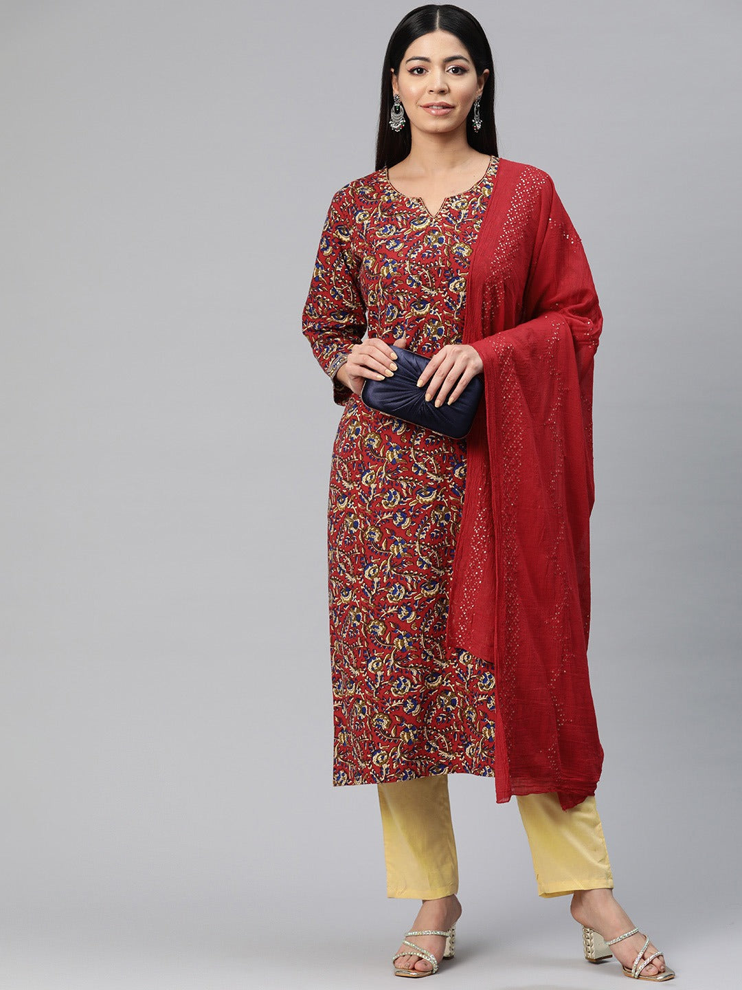 Straight Style Cotton Fabric Red Color Floral Printed Kurti With Palazzo And Dupatta With Sequence Work