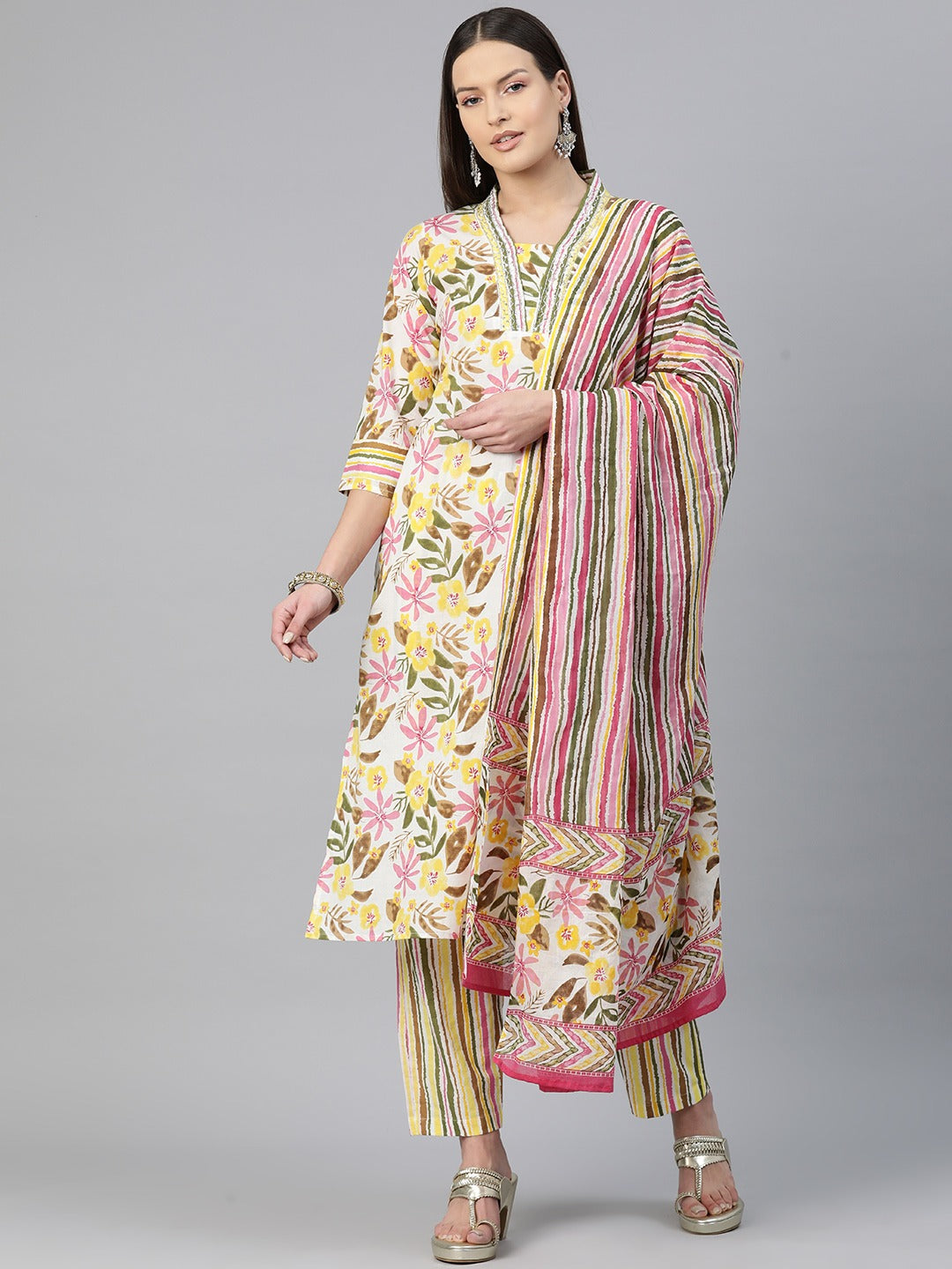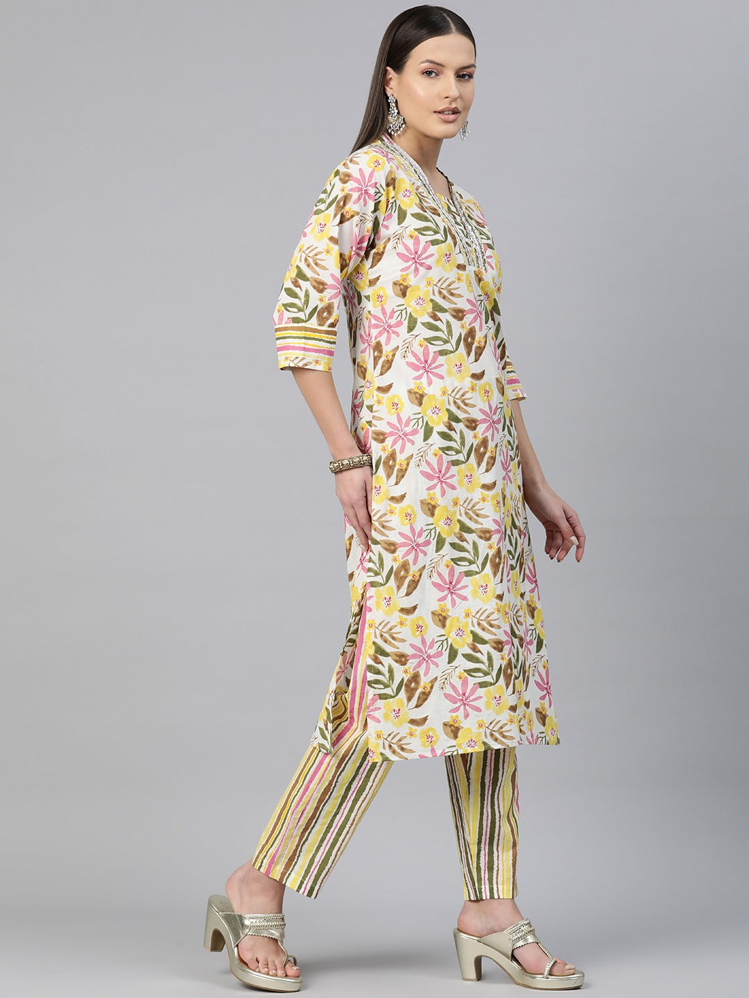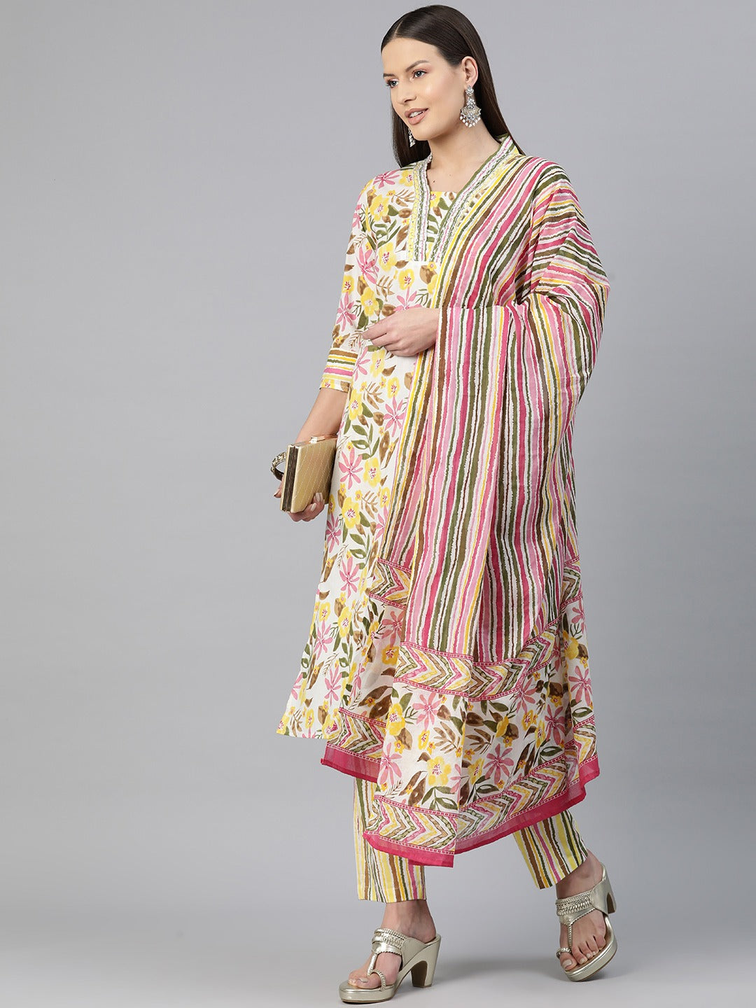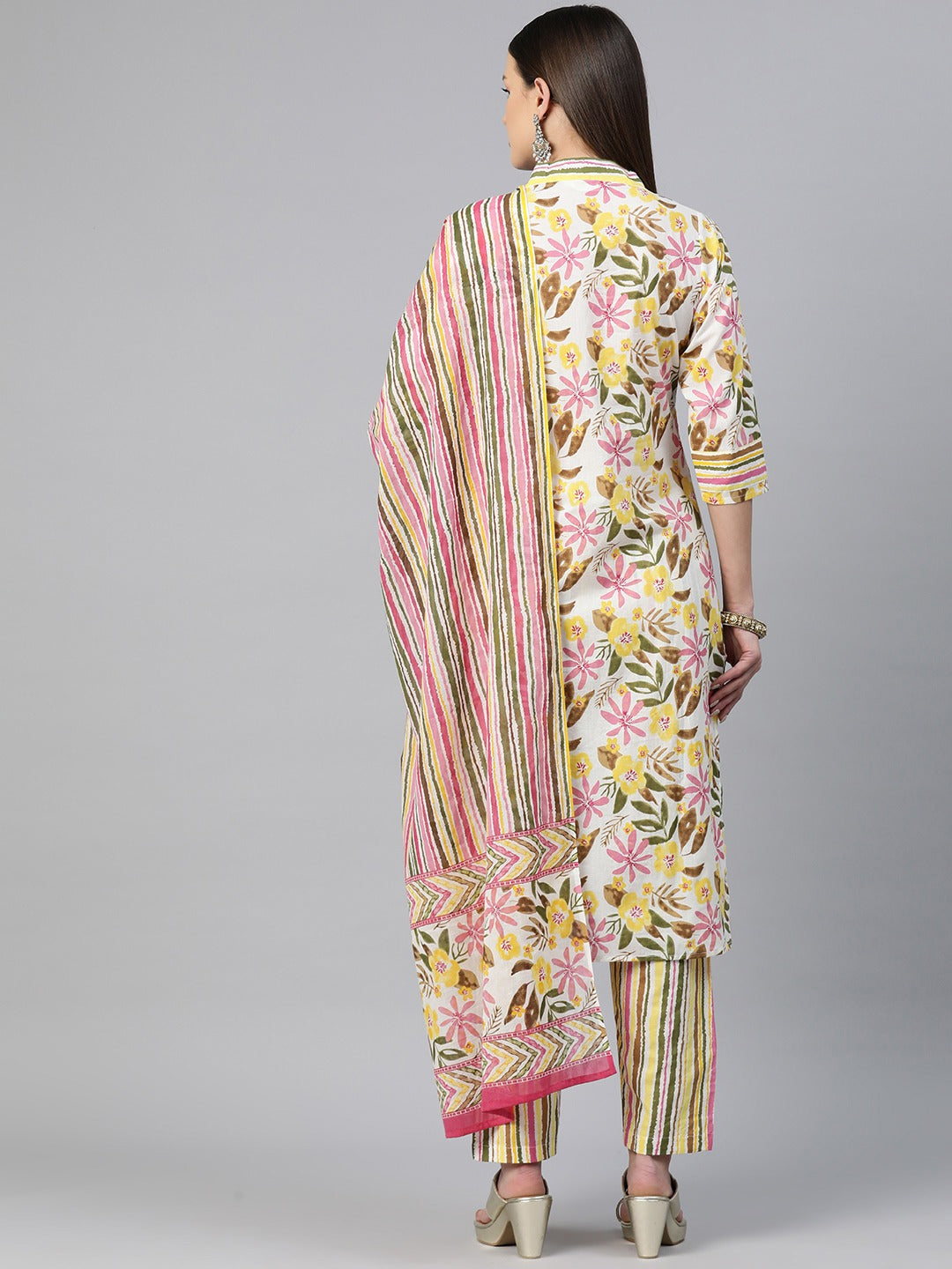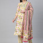 Straight Style Cotton Fabric Yellow Color Floral Printed Kurti With Salwar And Dupatta