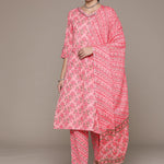 Straight Style Cotton Fabric Pink Color Floral Printed Zari Work Kurti With Palazzo And Dupatta