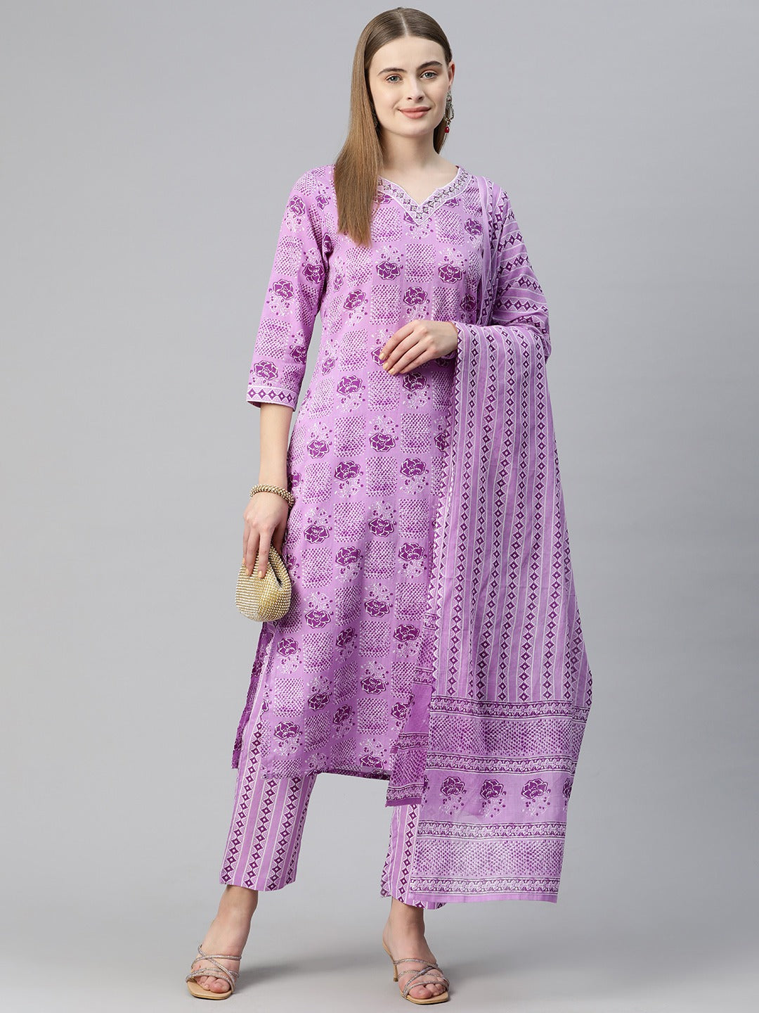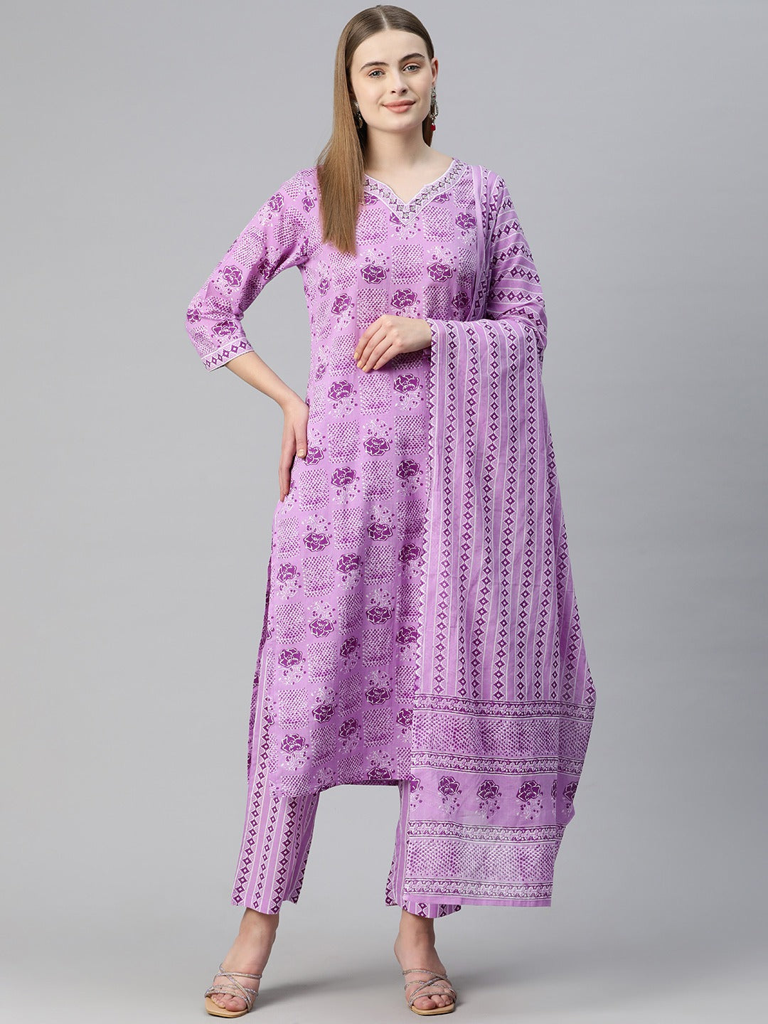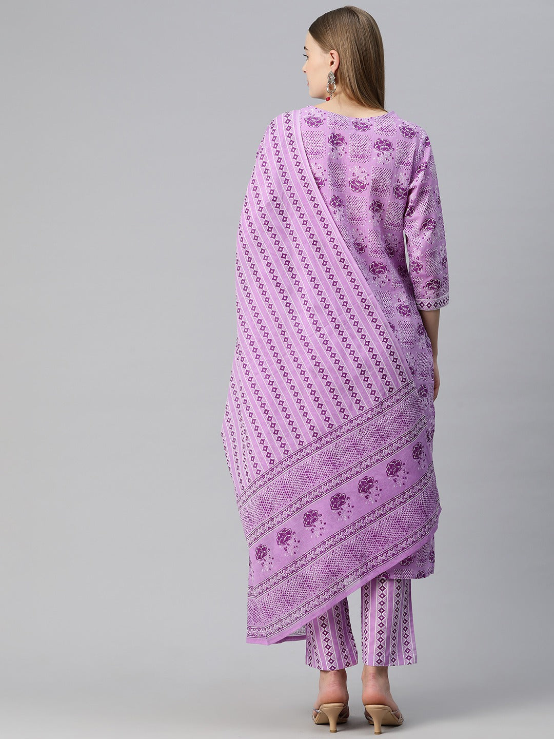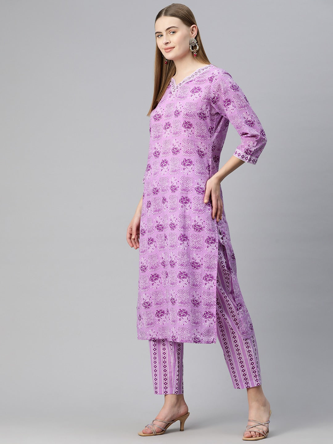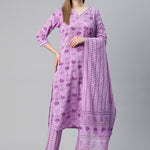 Straight Style Cotton Fabric Violet Color Floral Printed Kurti With Palazzo And Dupatta