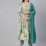 A Line Style Chanderi Silk Fabric Blue Color Floral Printed & Embroidered Kurti With Palazzo And Dupatta