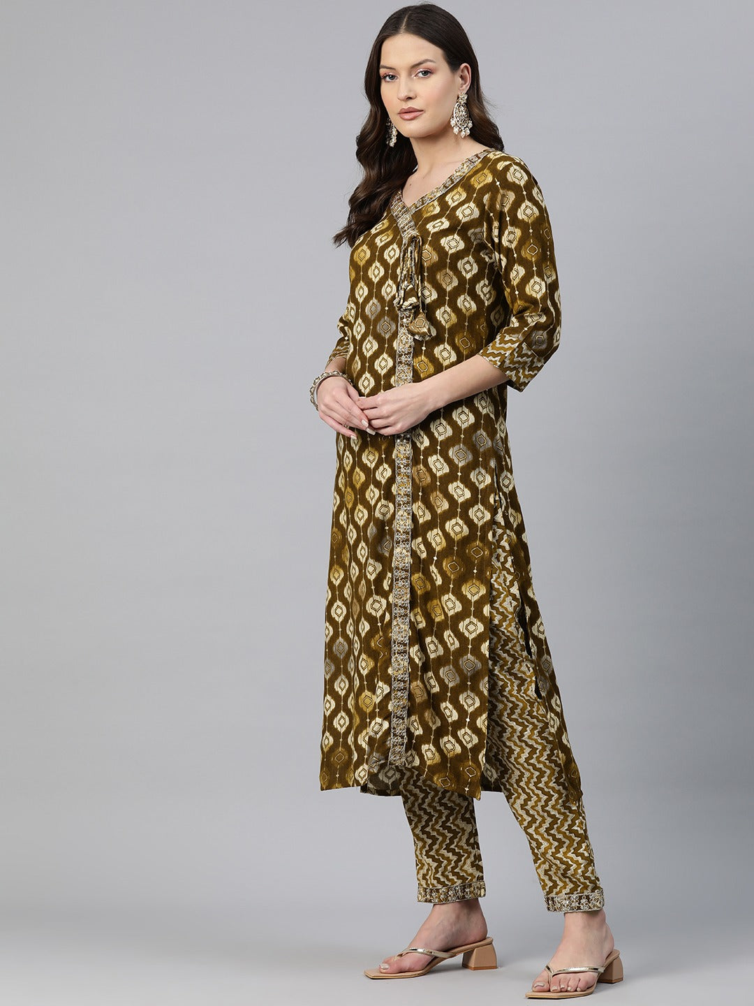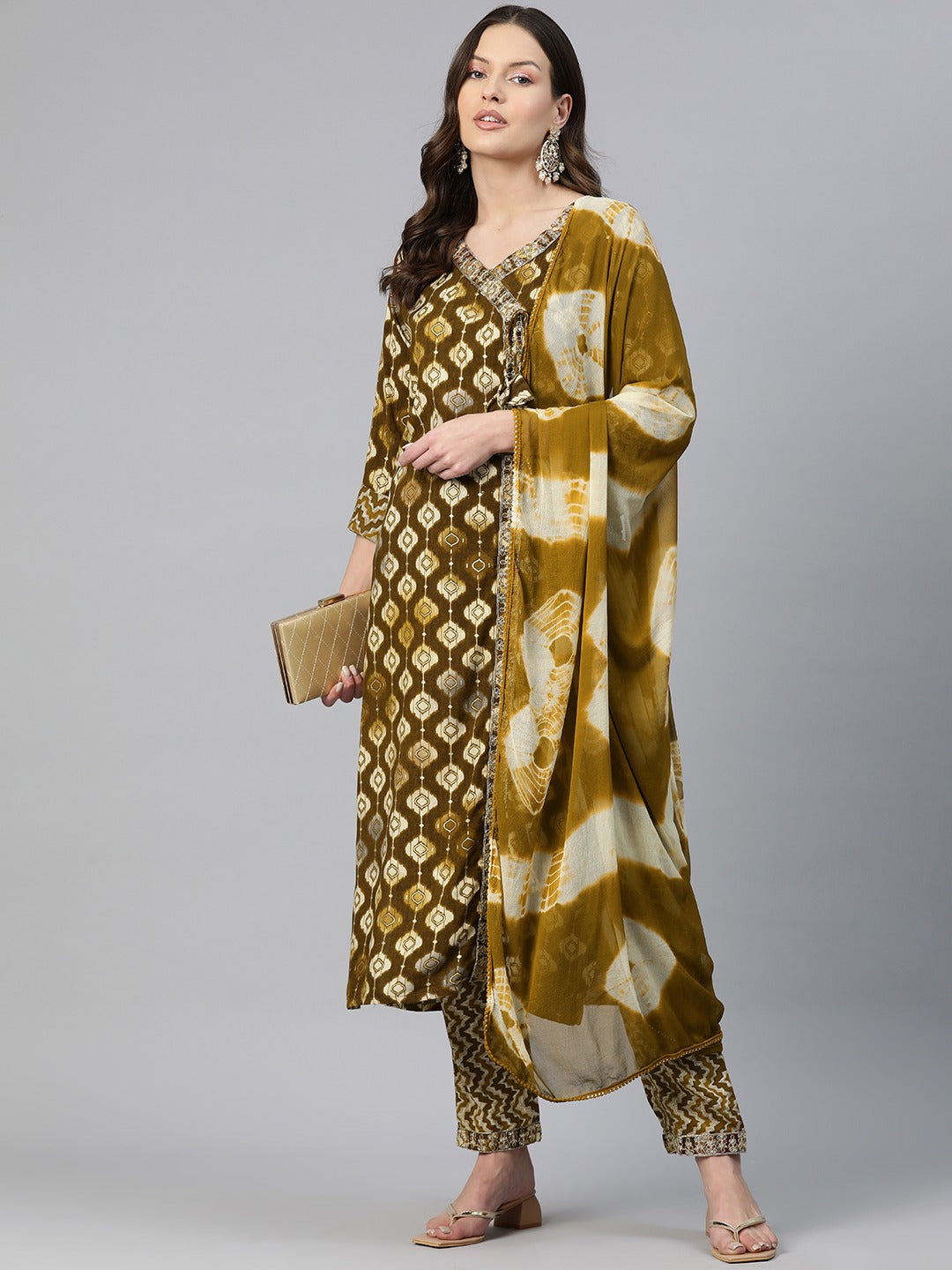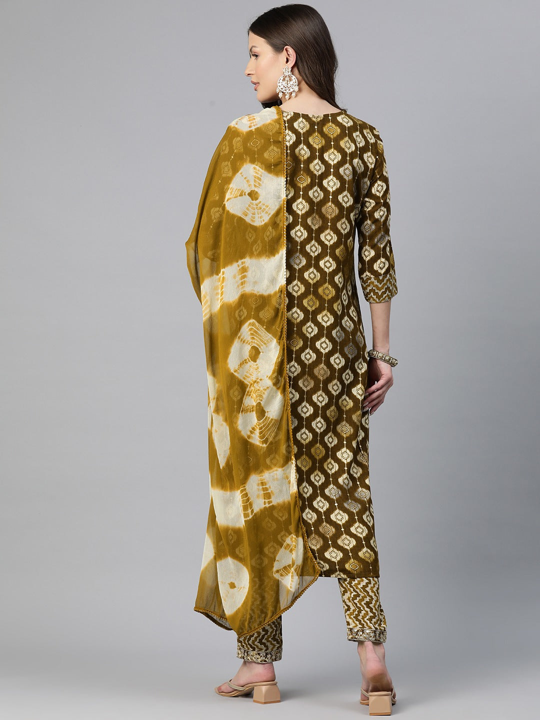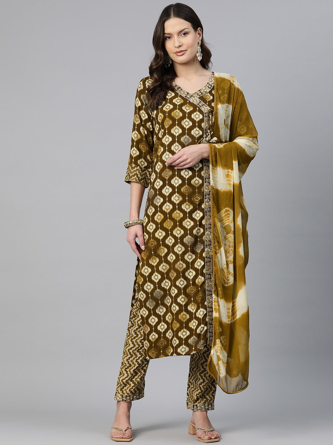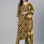 Straight Style Rayon Fabric Brown Color Zari & Printed Kurti With Palazzo And Dupatta