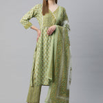 Straight Style Cotton Fabric Green Color Floral Printed Kurti With Palazzo And Dupatta