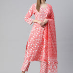 Straight Style Cotton Fabric Peach Color Floral Printed Kurti With Palazzo And Dupatta