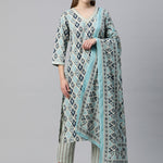 Straight Style Cotton Fabric Grey Color Printed Kurti With Palazzo And Dupatta
