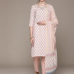 Straight Style Cotton Fabric White Color Floral Printed Gotta Patti Work Kurti With Palazzo And Dupatta