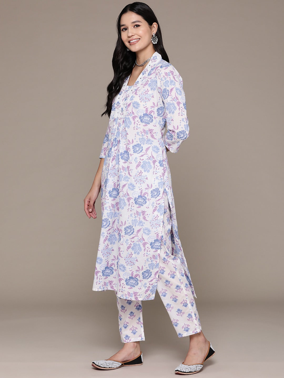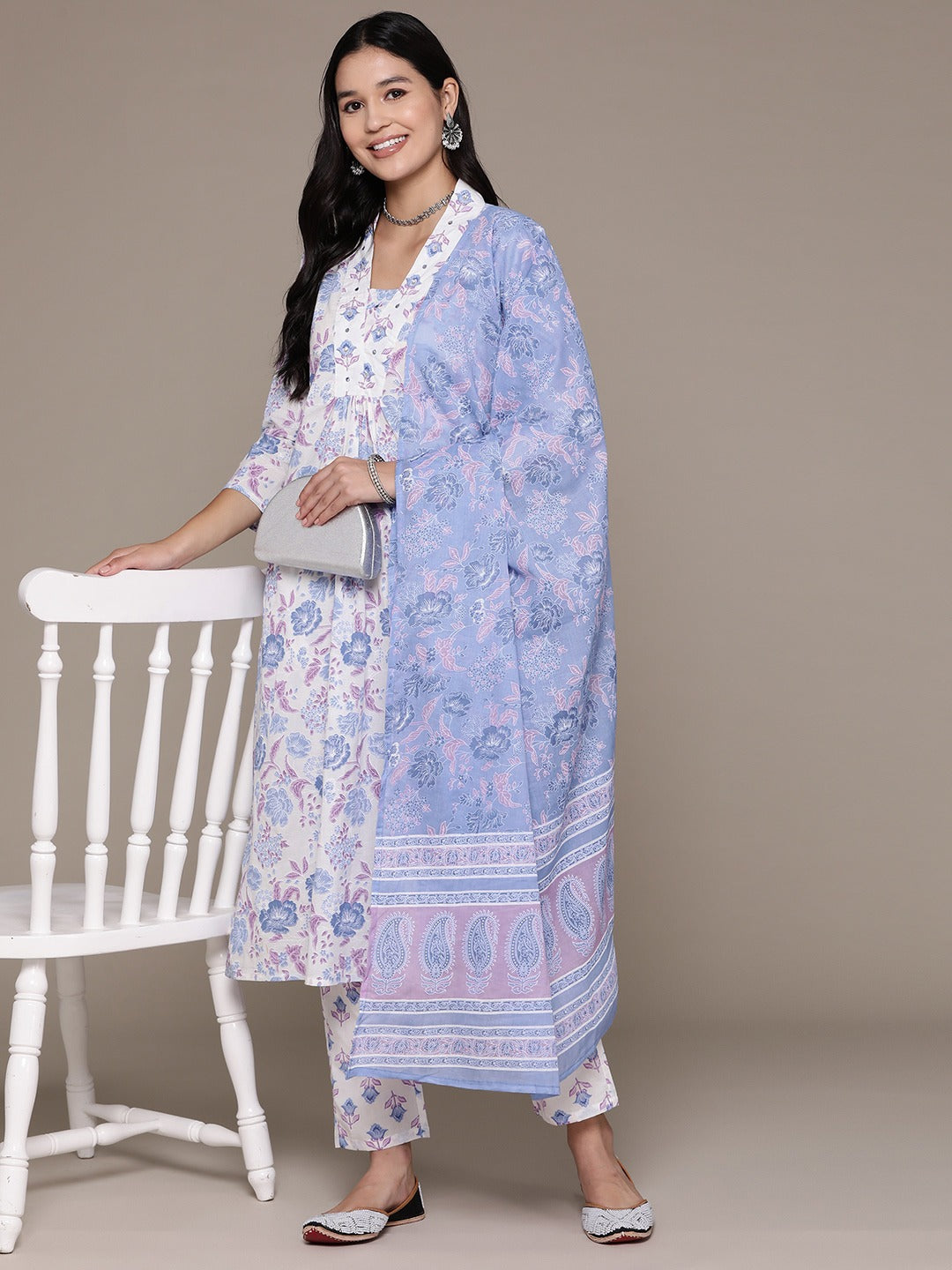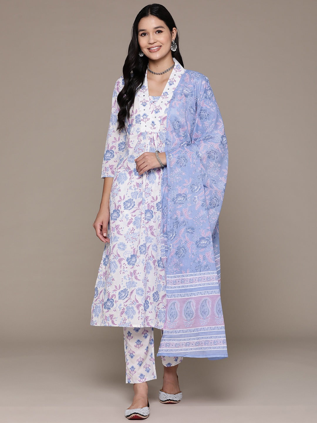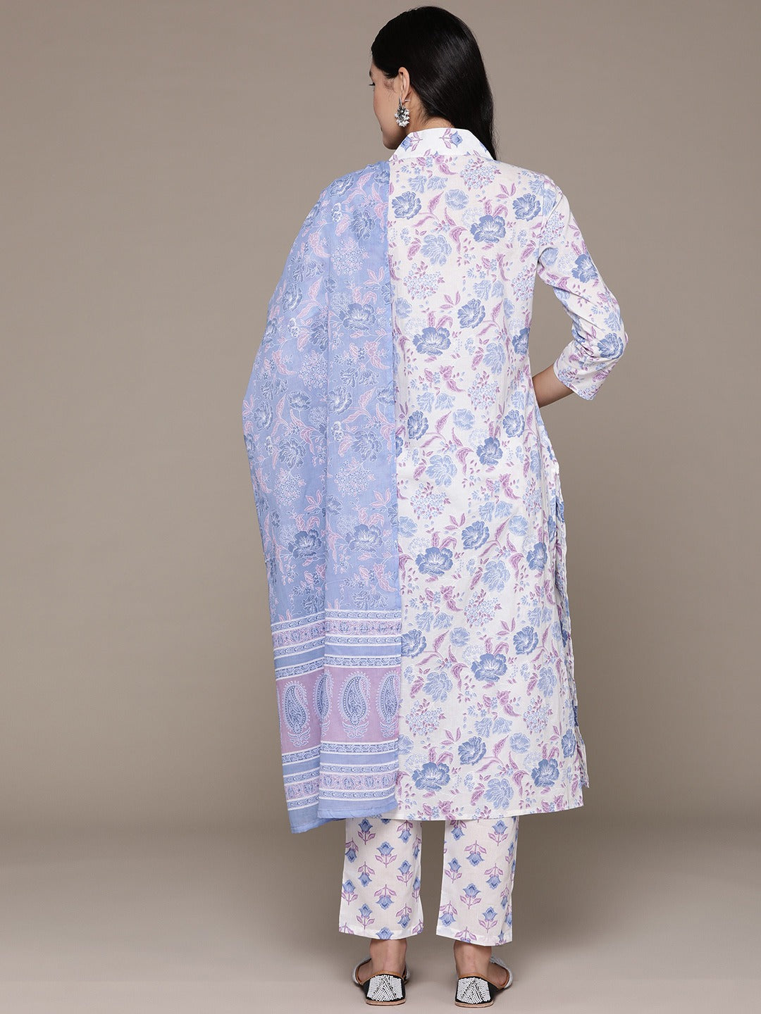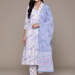Straight Style Cotton Fabric White Color Floral Printed Kurti With Palazzo And Dupatta