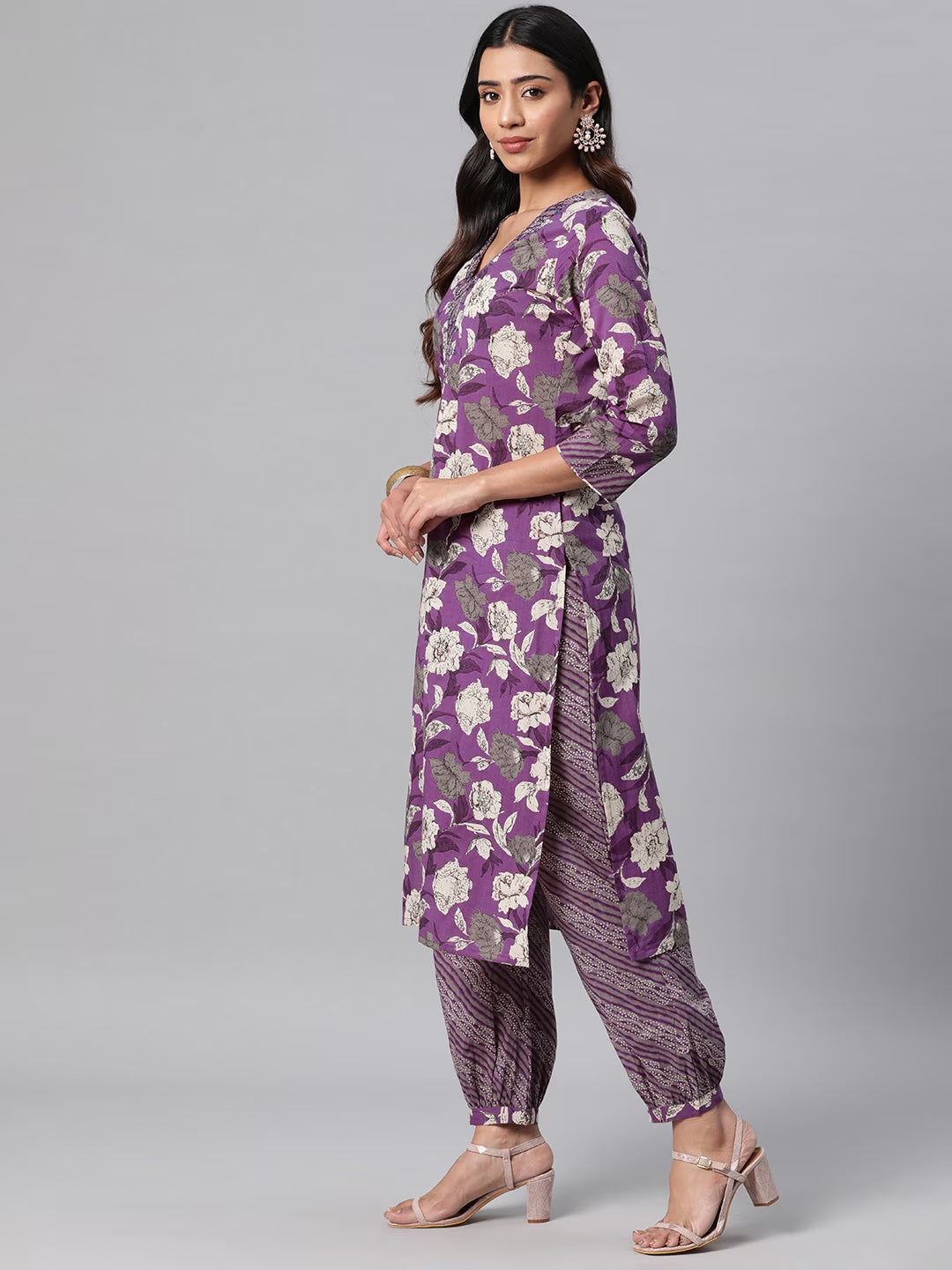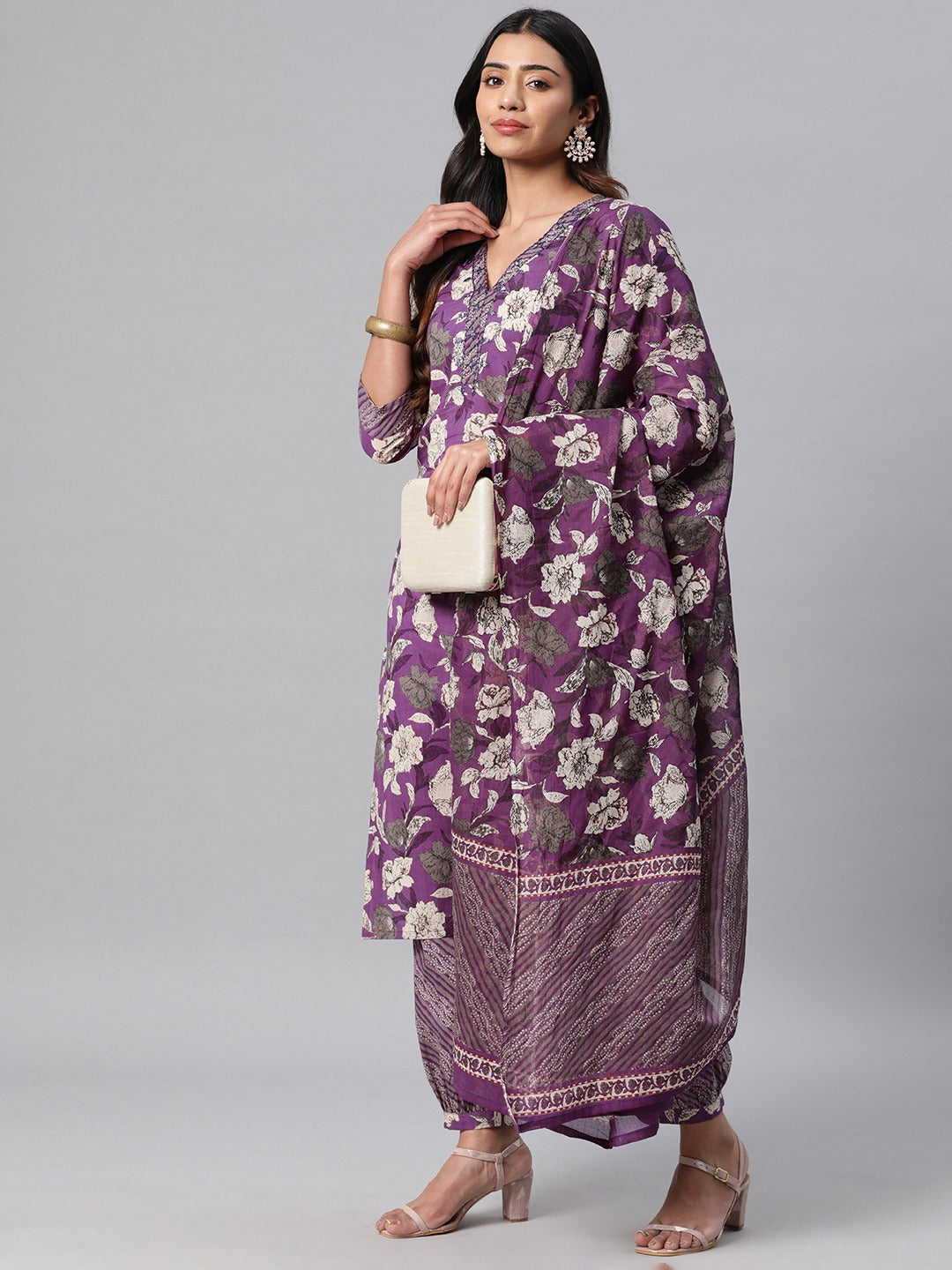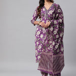 Cotton Printed Straight Kurta Salwar Dupatta Set (Purple)