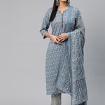 Straight Style Cotton Fabric Grey Color Printed Kurti With Palazzo And Dupatta With Printed Work