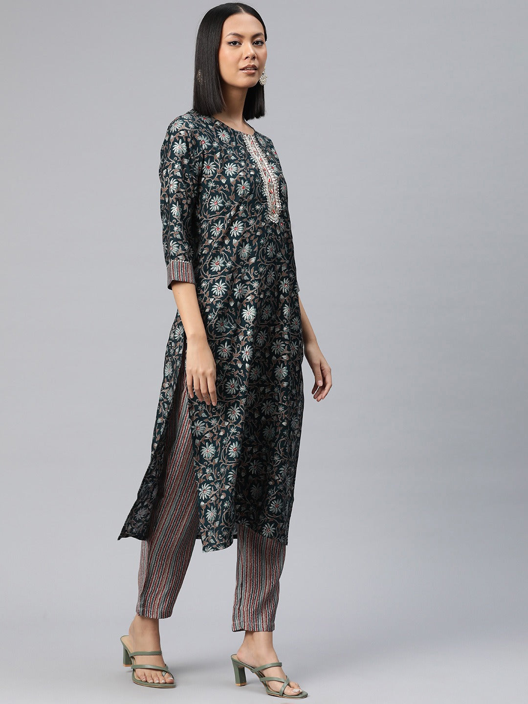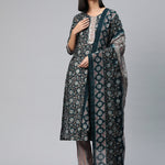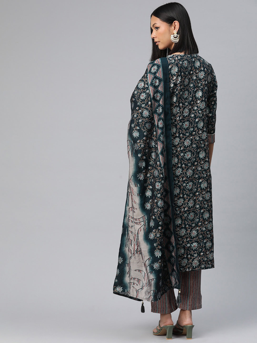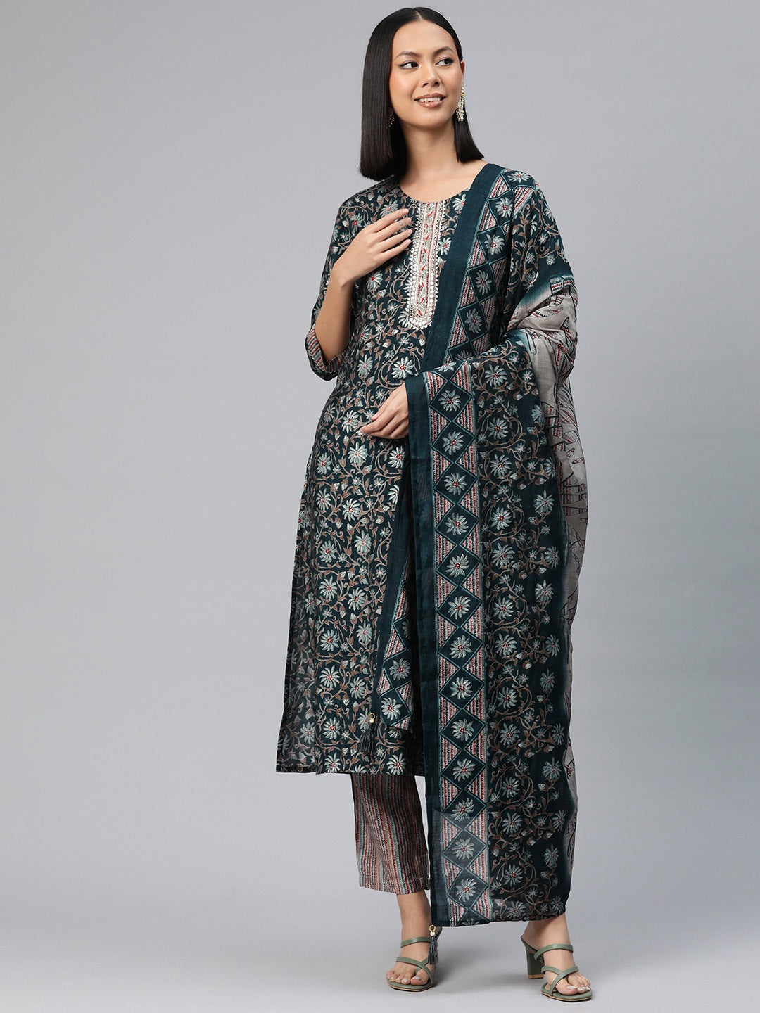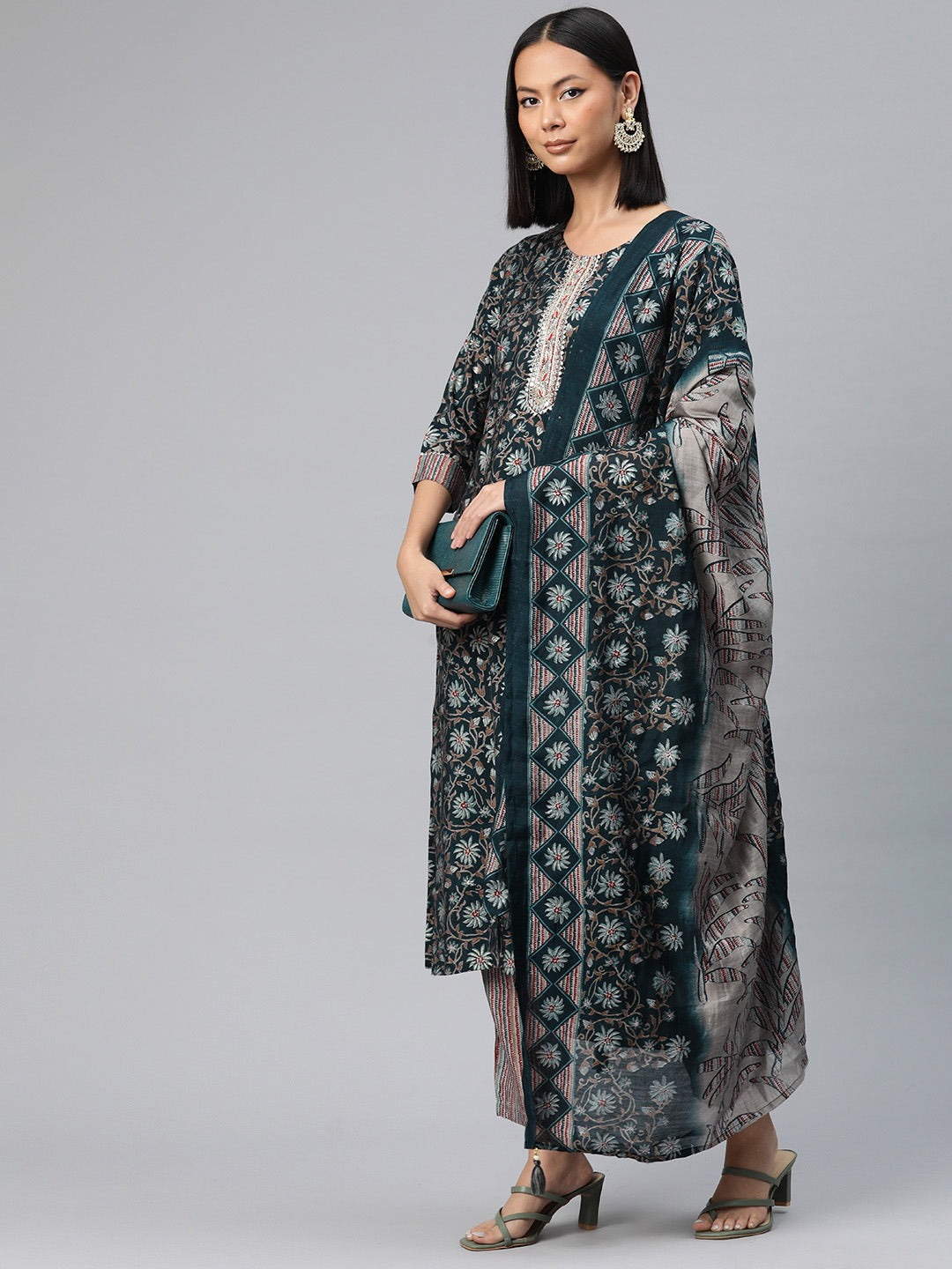 Straight Style Silk Fabric Green Color Printed Kurti With Palazzo And Dupatta With Printed Work