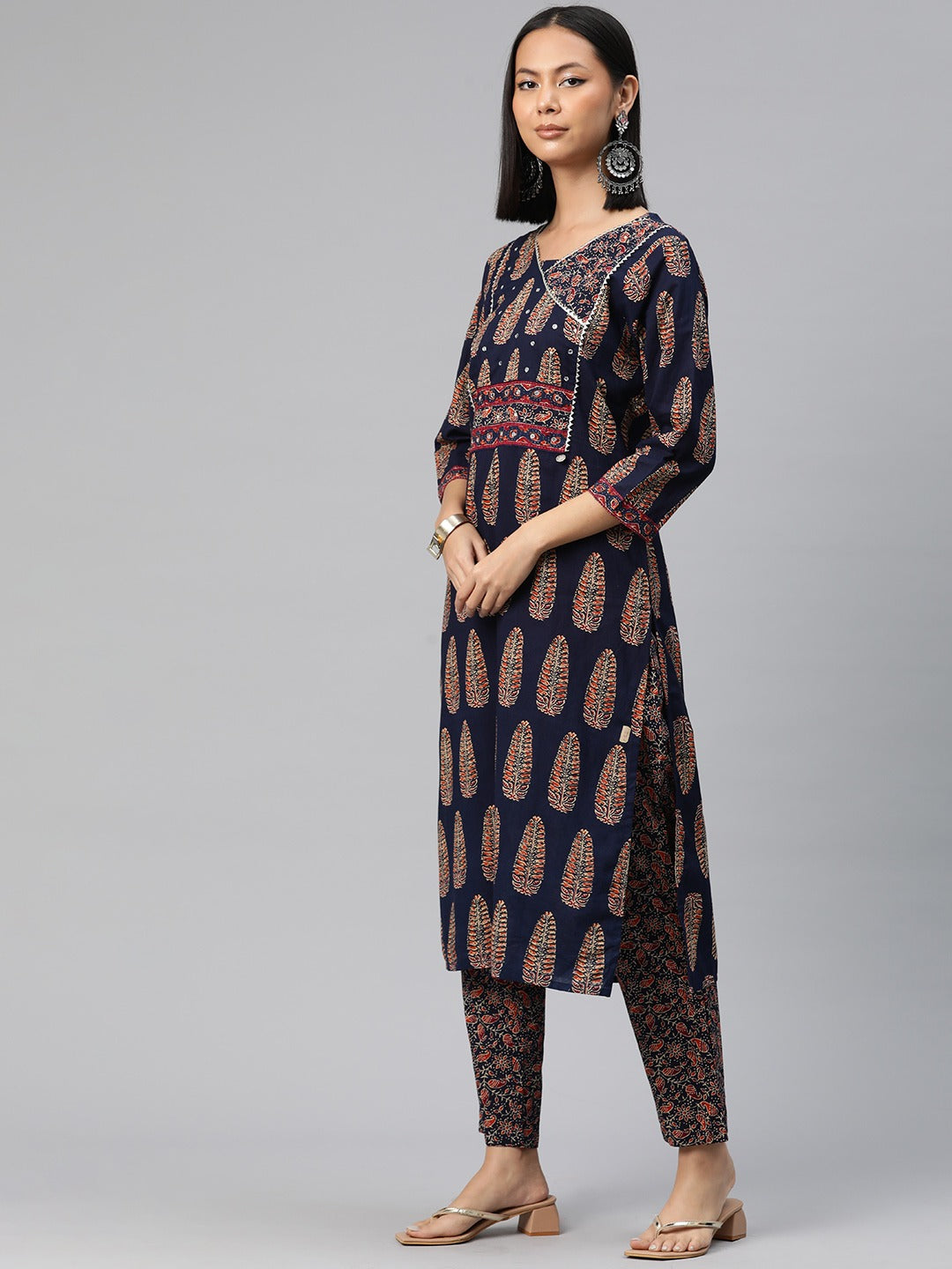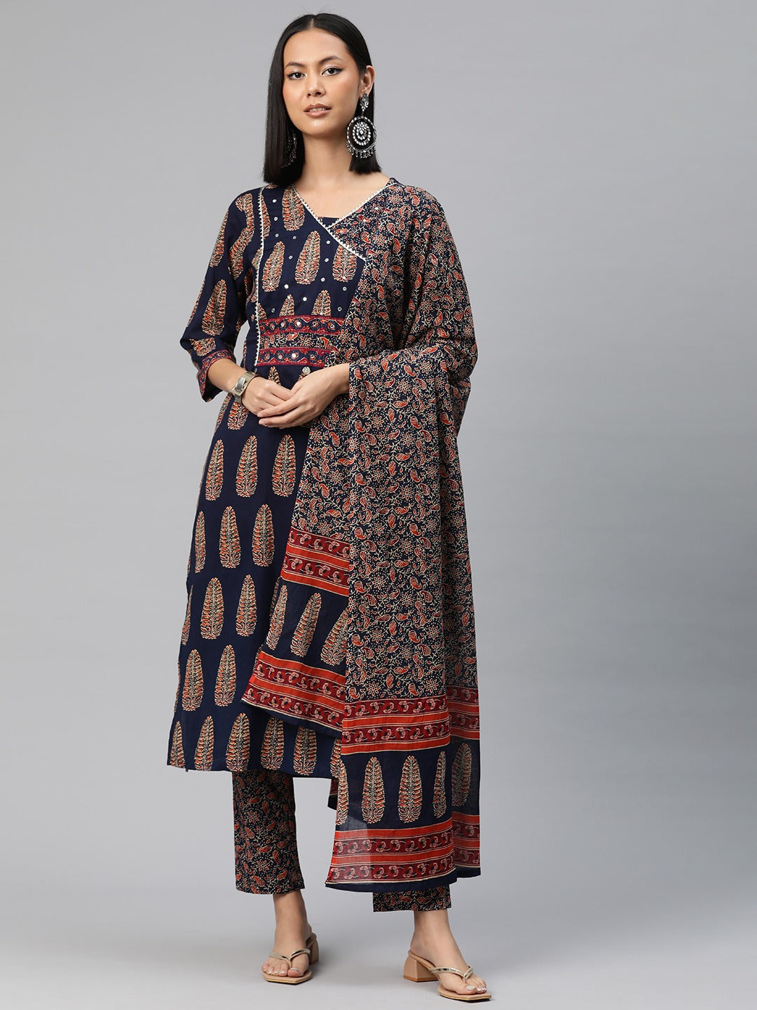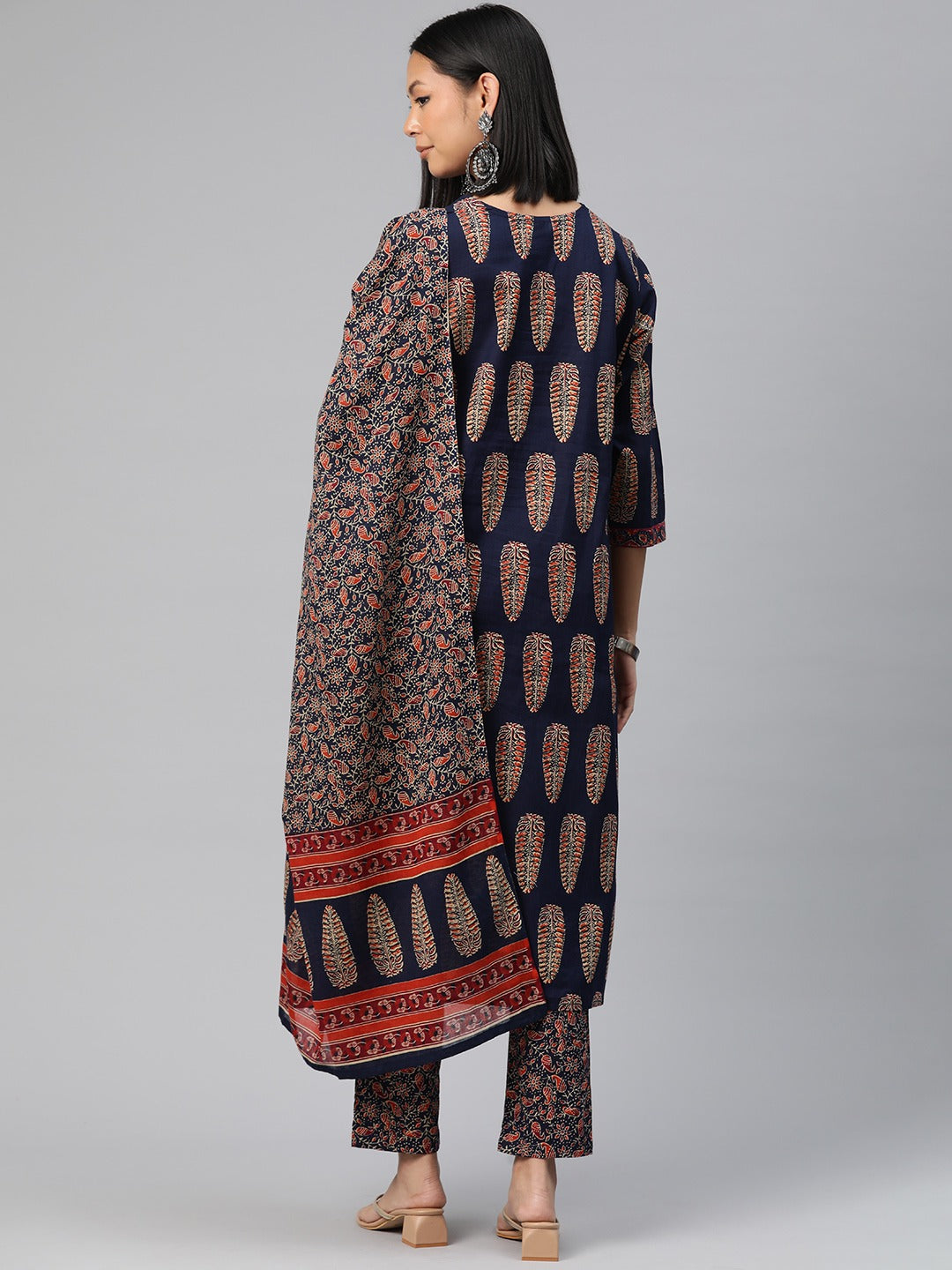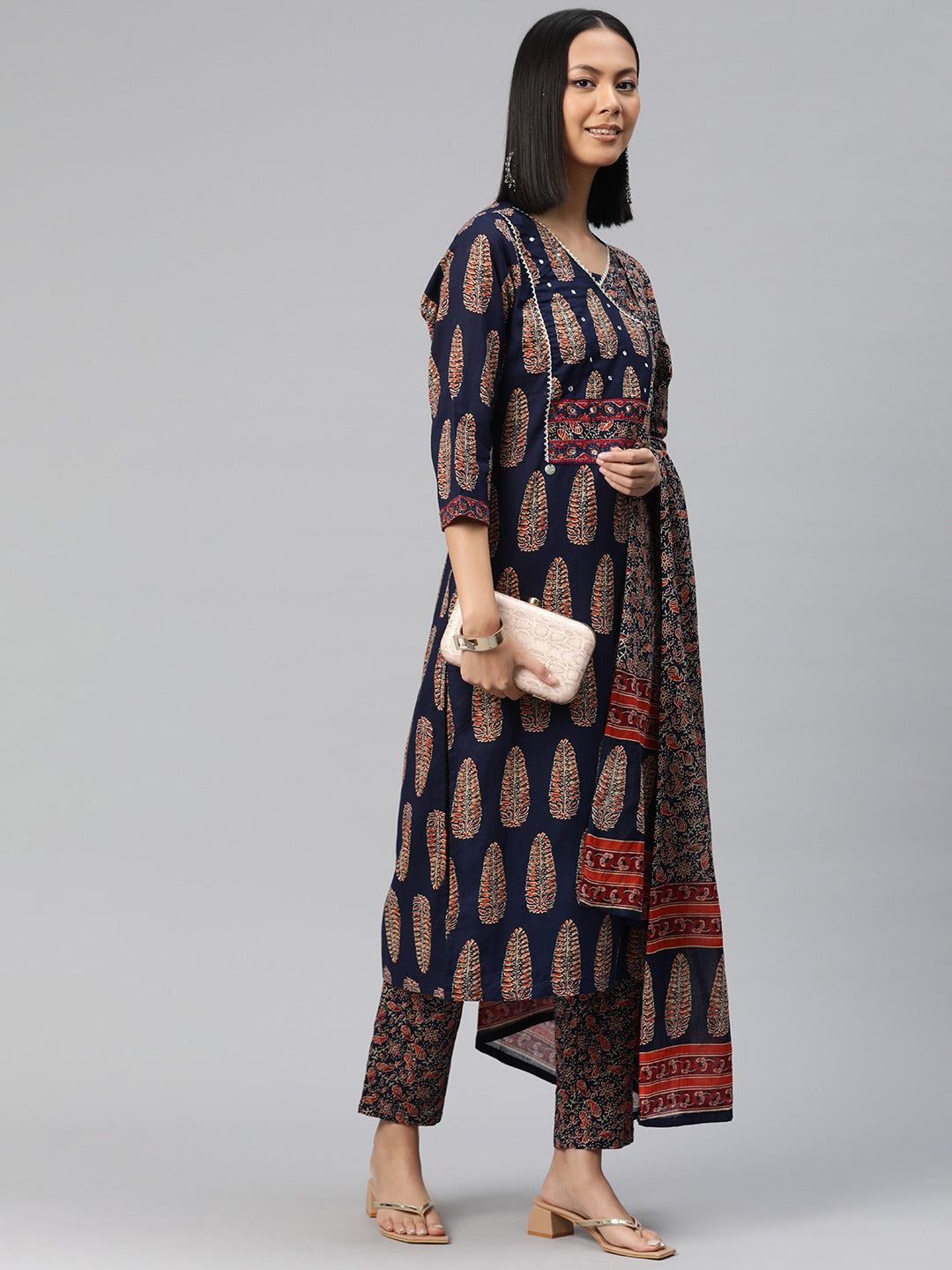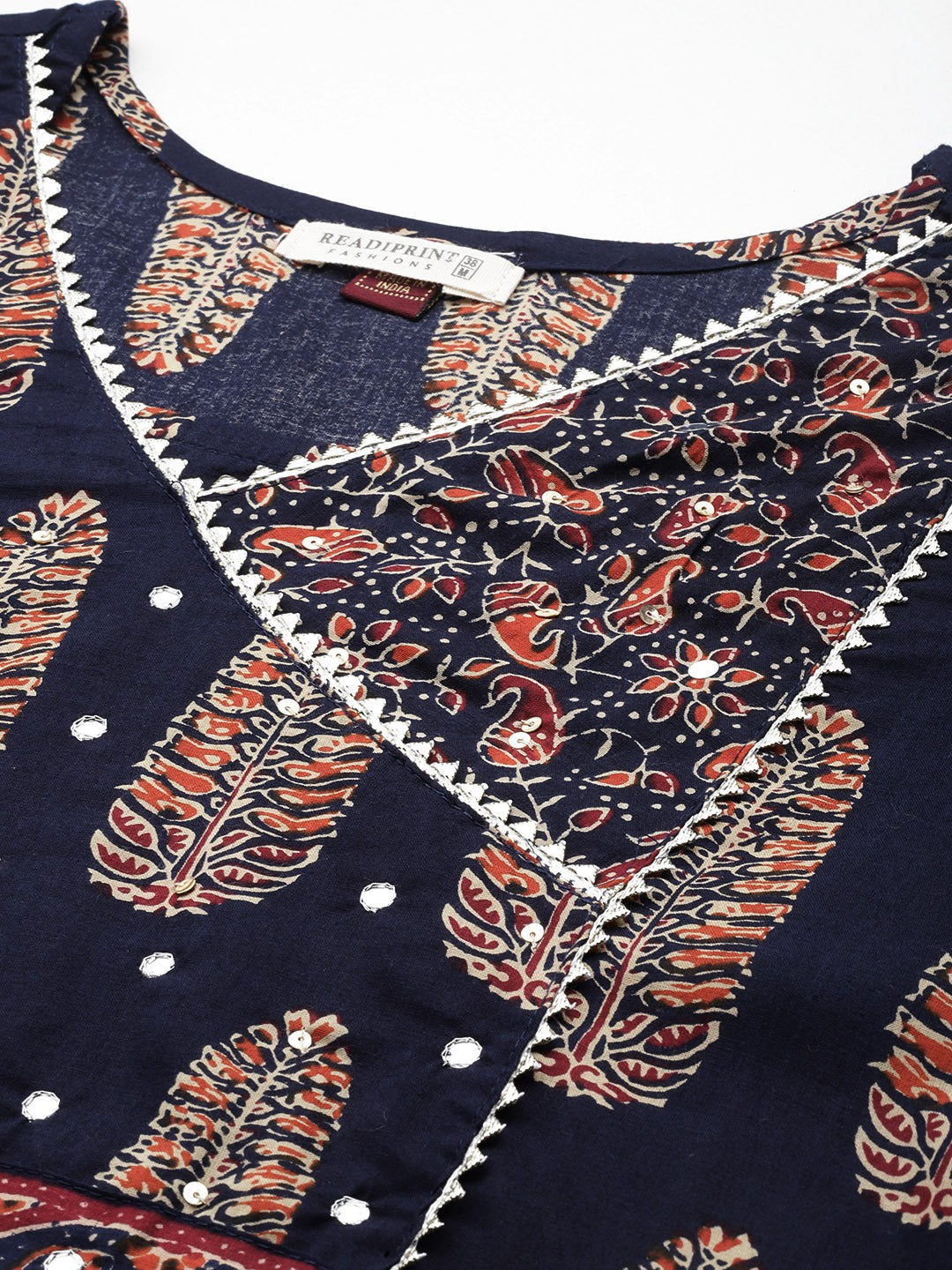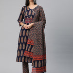 Straight Style Cotton Fabric Navy Blue Color Floral Printed Kurti With Palazzo And Dupatta With Mirror Work