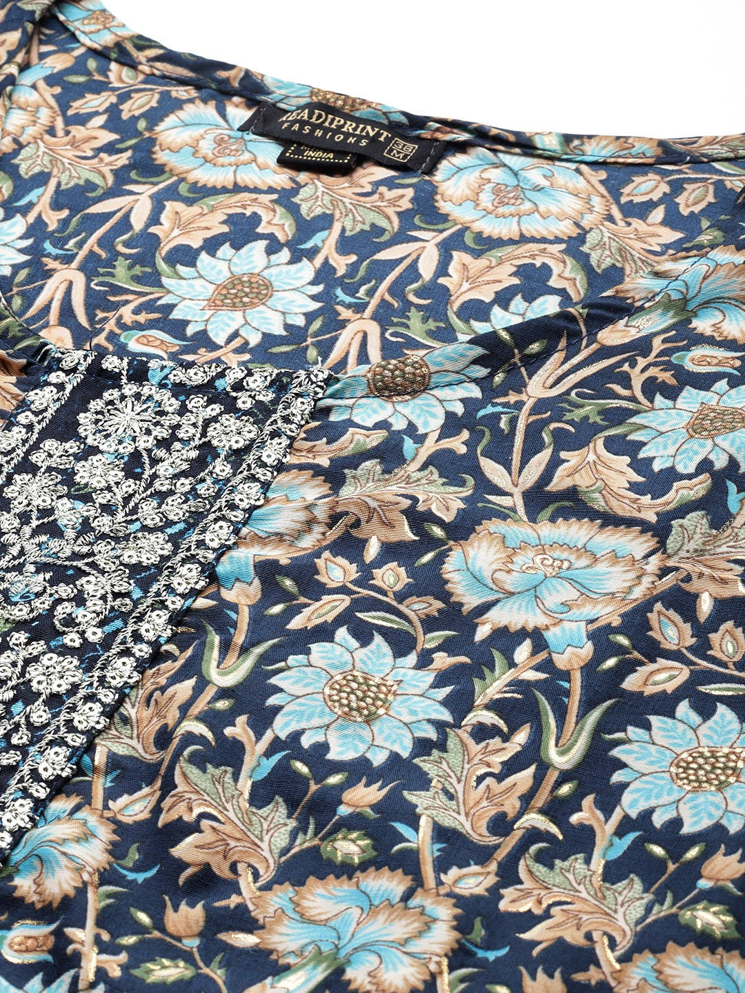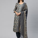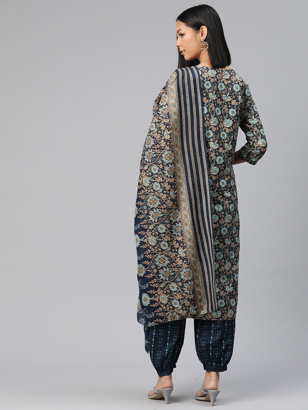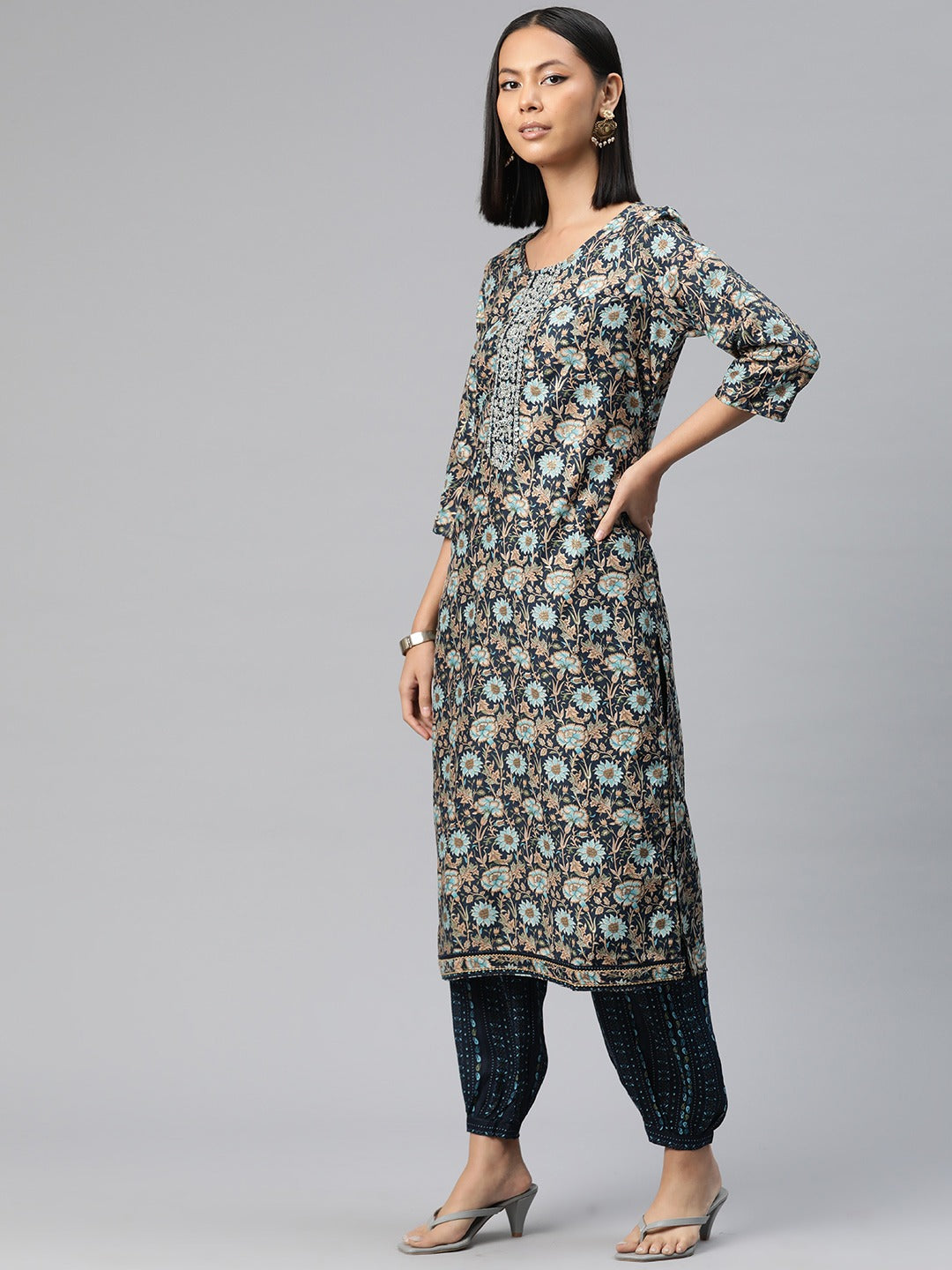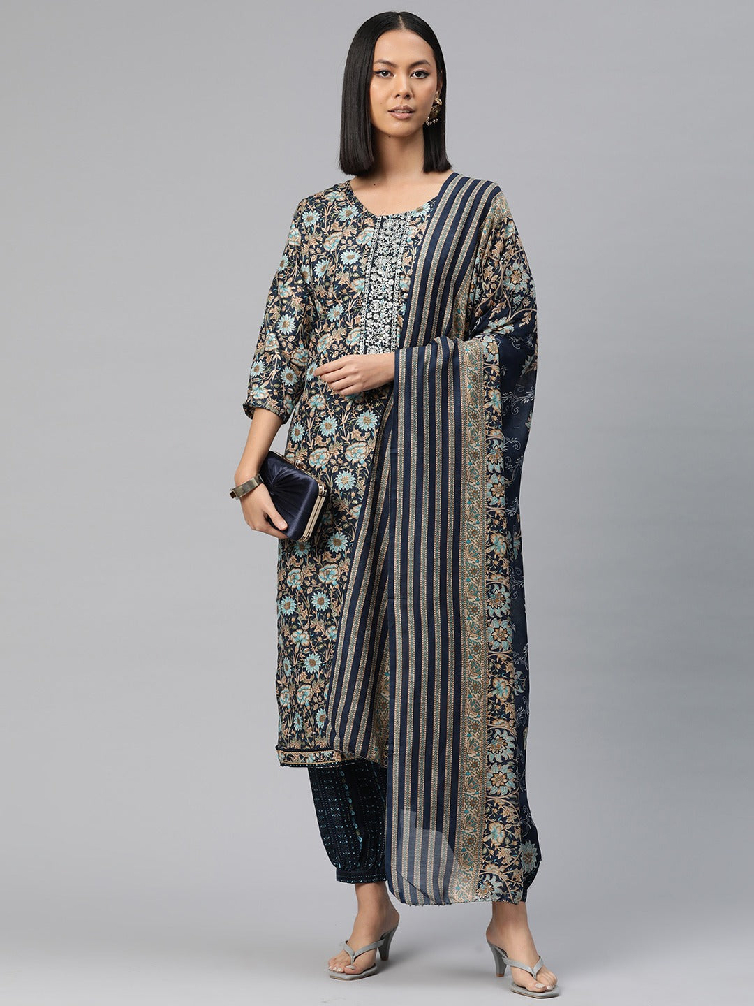 Straight Style Silk Fabric Navy Blue Color Printed Kurti With Palazzo And Dupatta With Printed Work