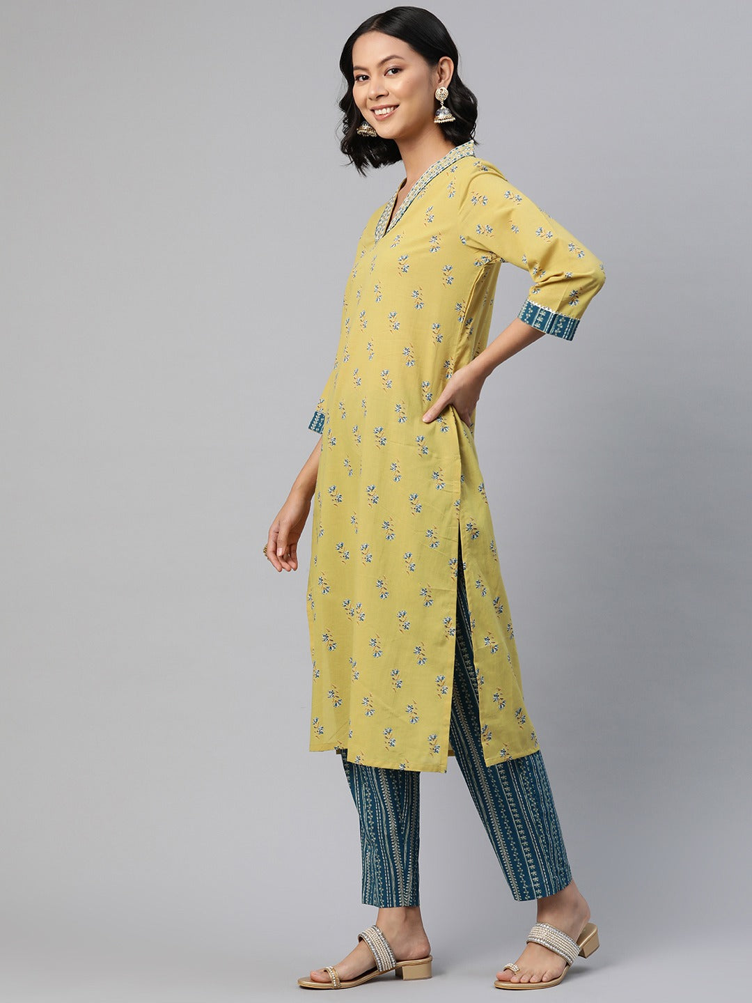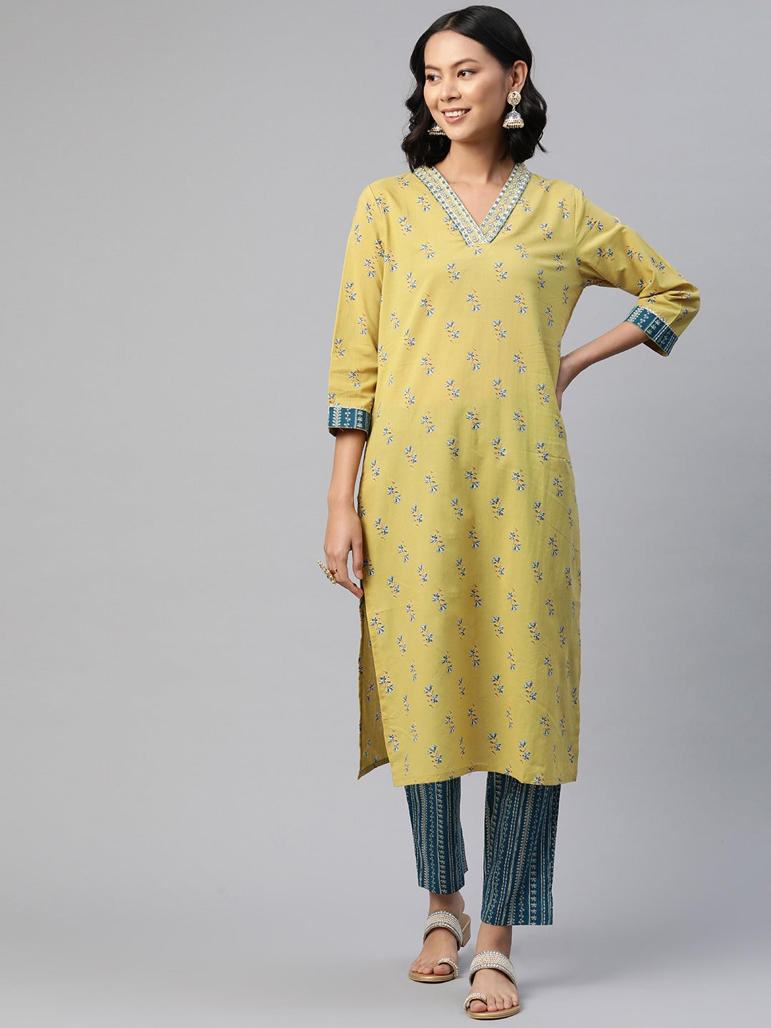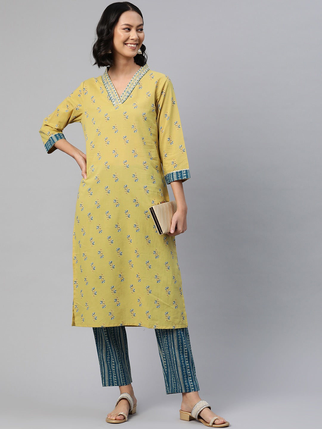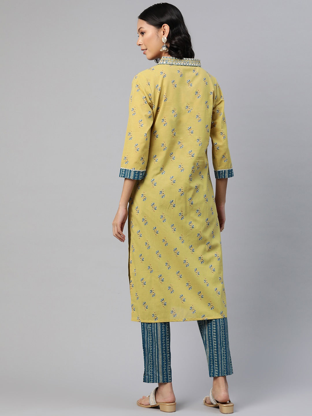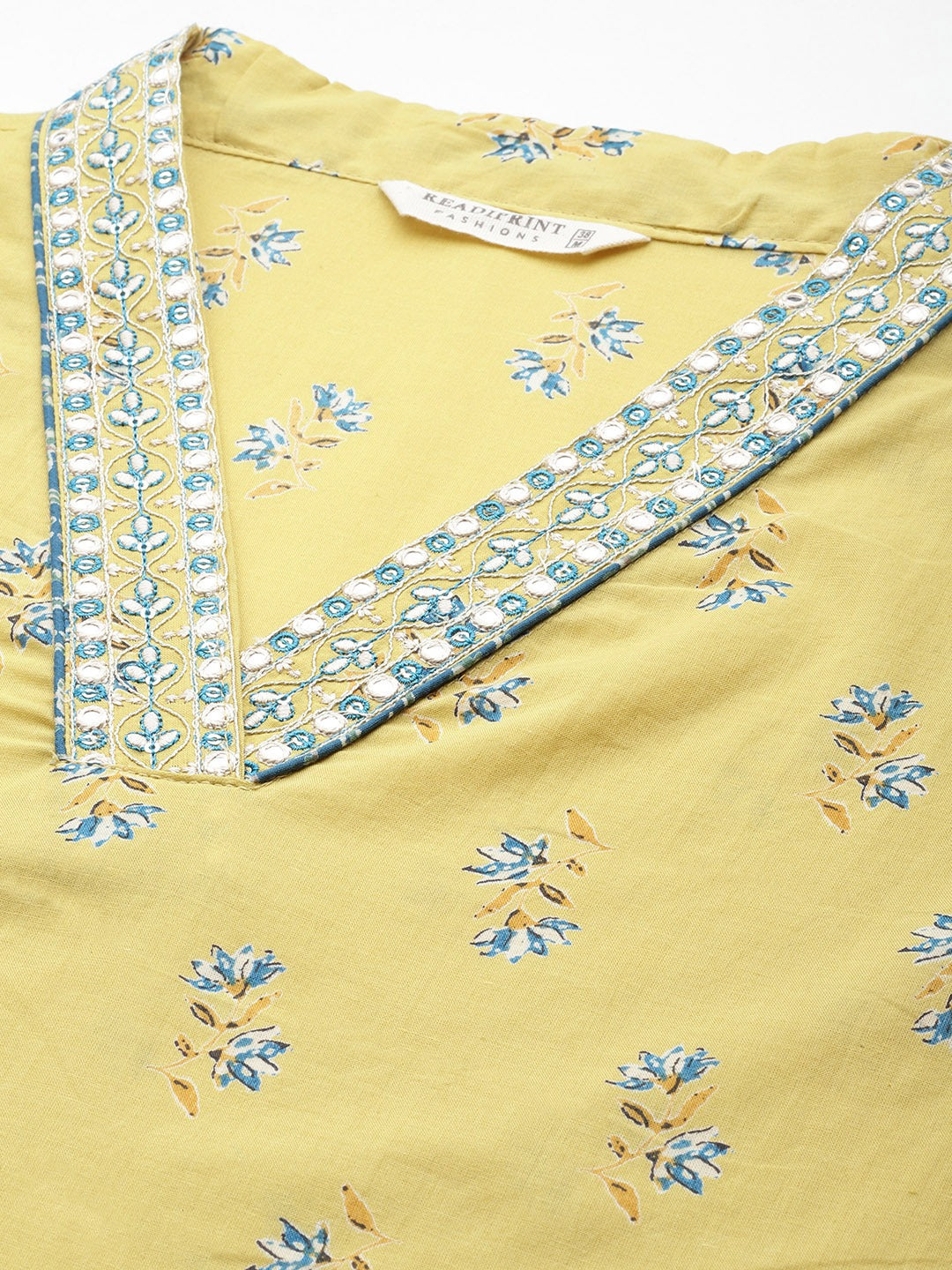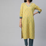 Straight Style Cotton Fabric Yellow Color Floral Printed Kurti With Palazzo