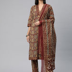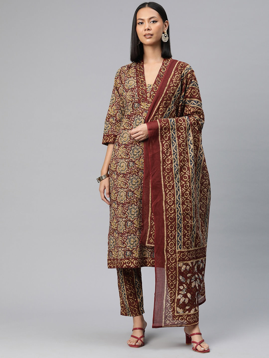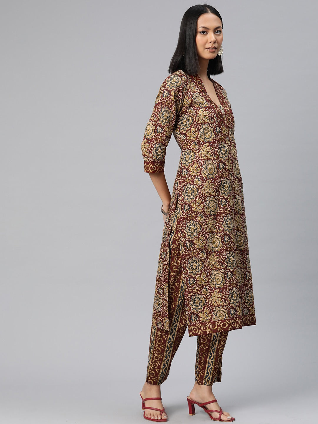 Straight Style Cotton Fabric Red Color Floral Printed Kurti With Palazzo And Dupatta With Beads Work