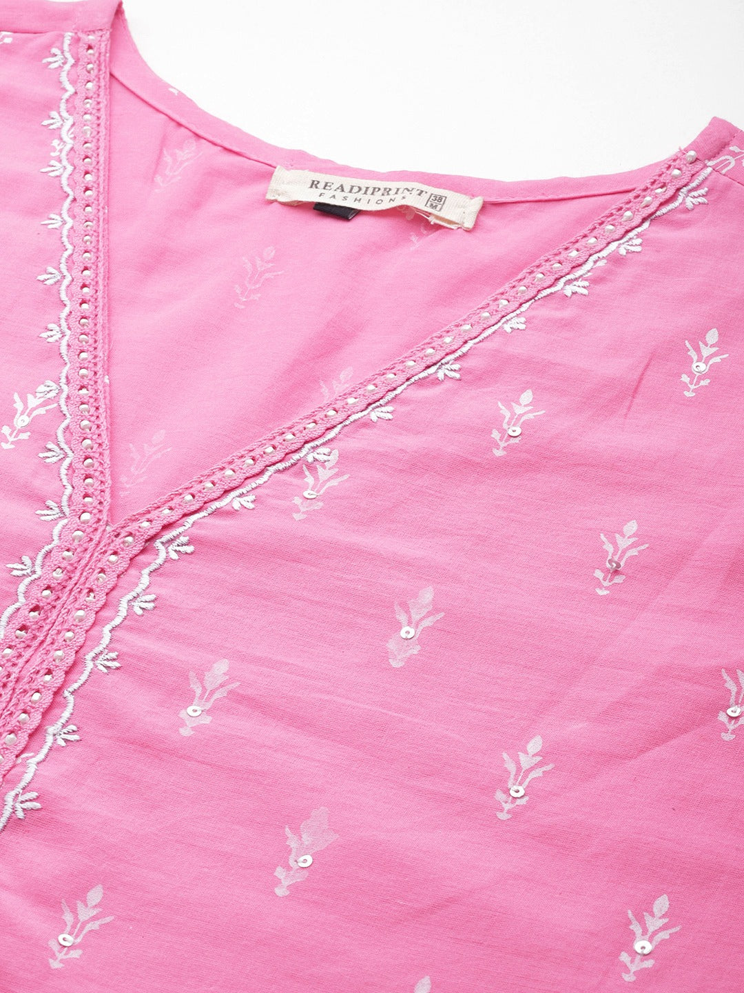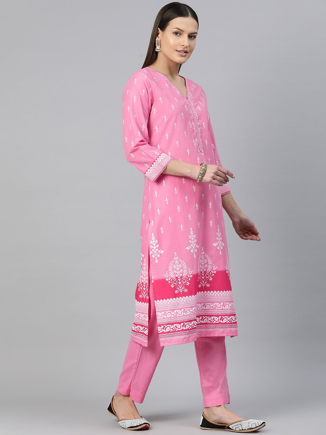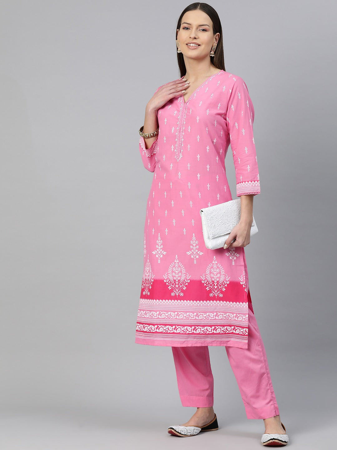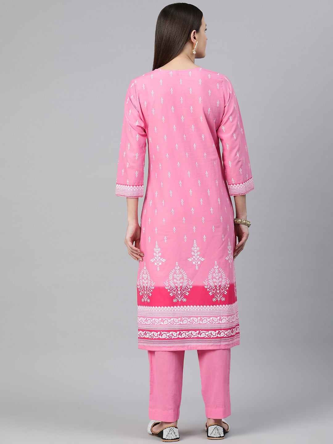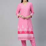 Straight Style Cotton Fabric Pink Color Printed Kurti With Palazzo