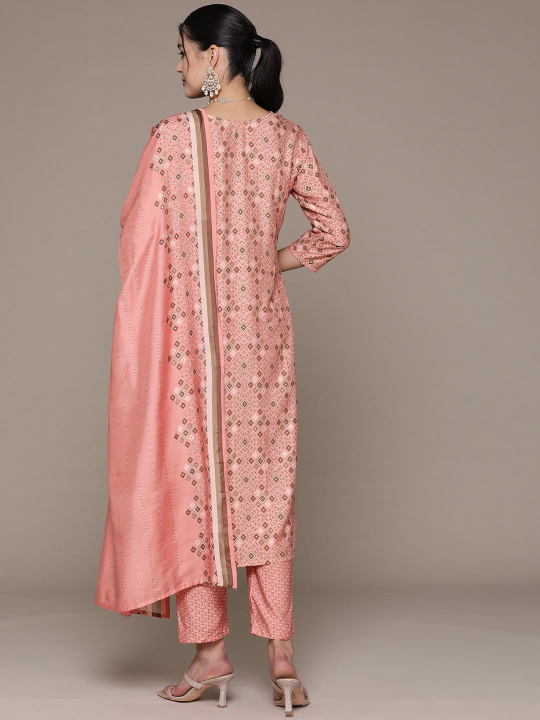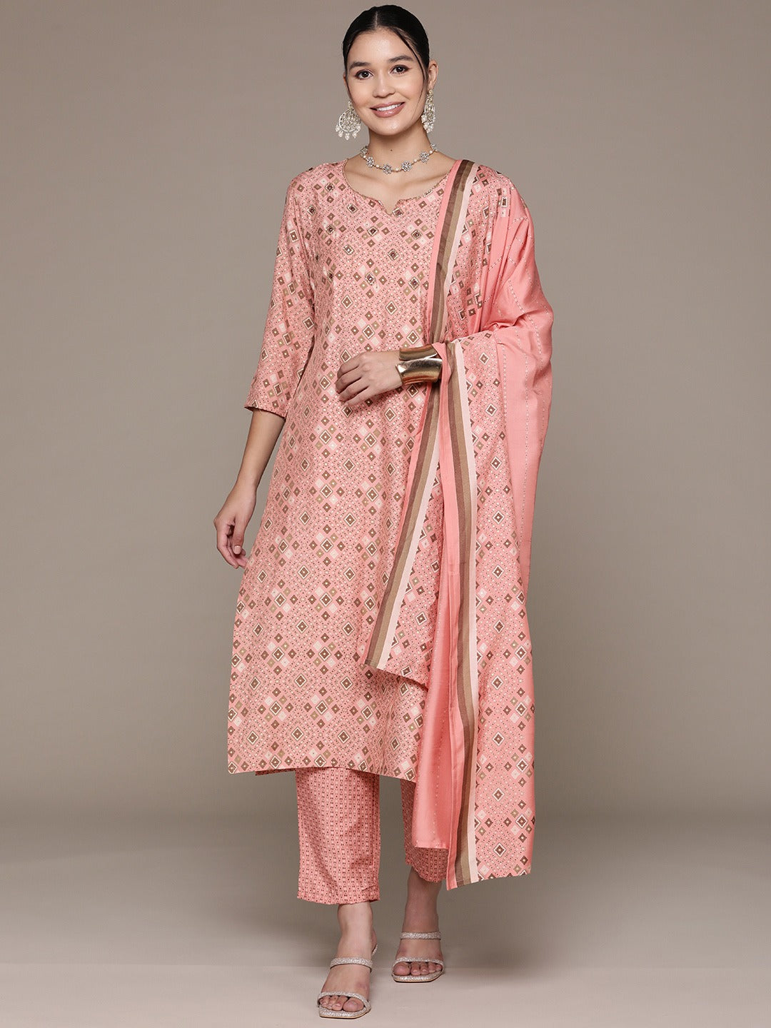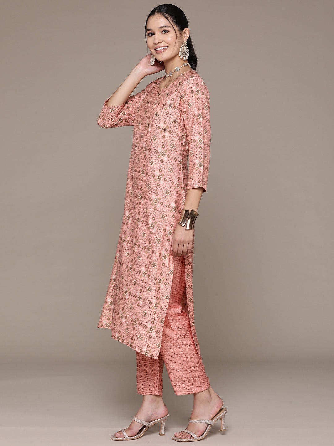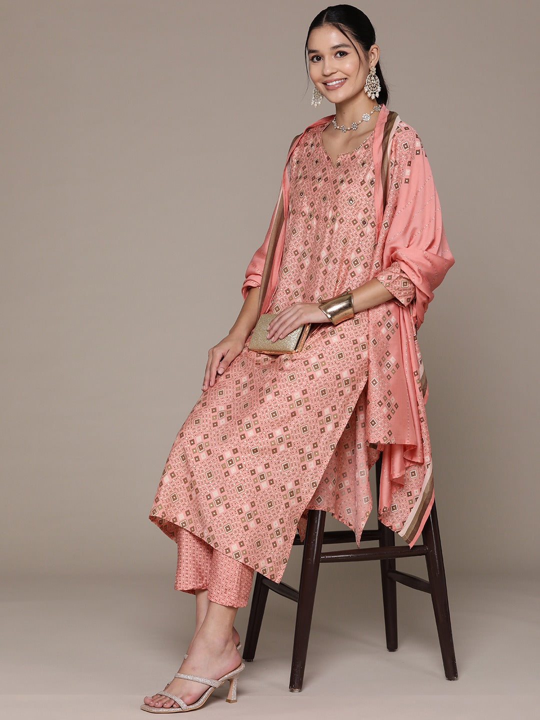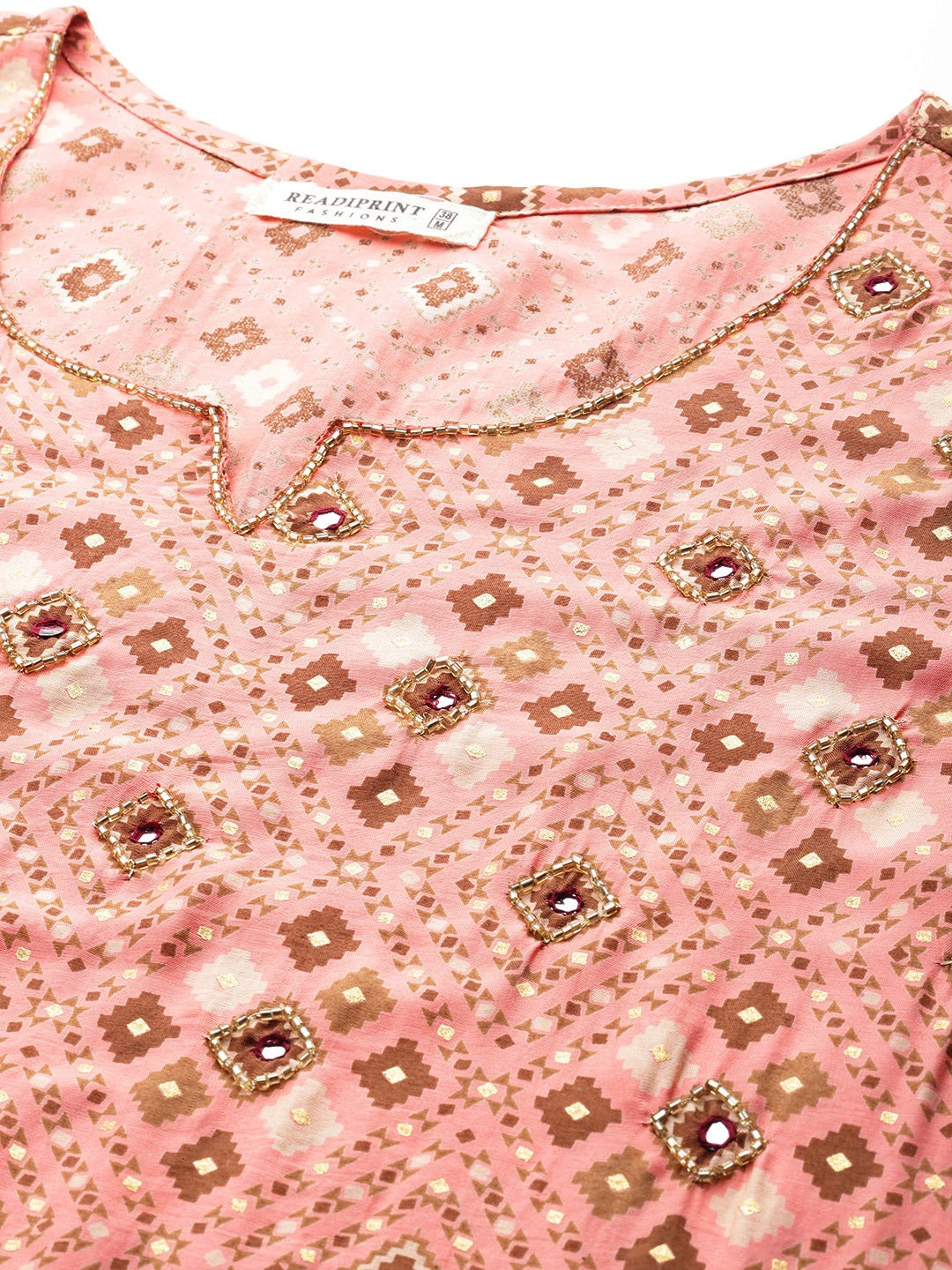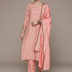 Straight Style Silk Fabric Pink Color Printed & Cut Dana Work Kurti With Palazzo And Dupatta