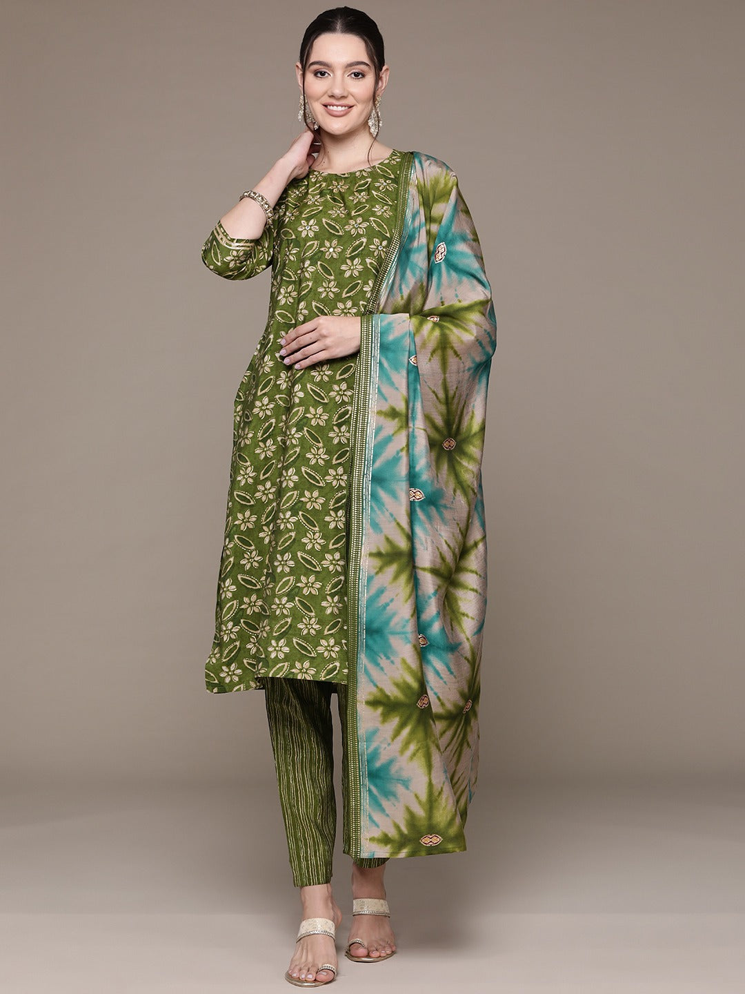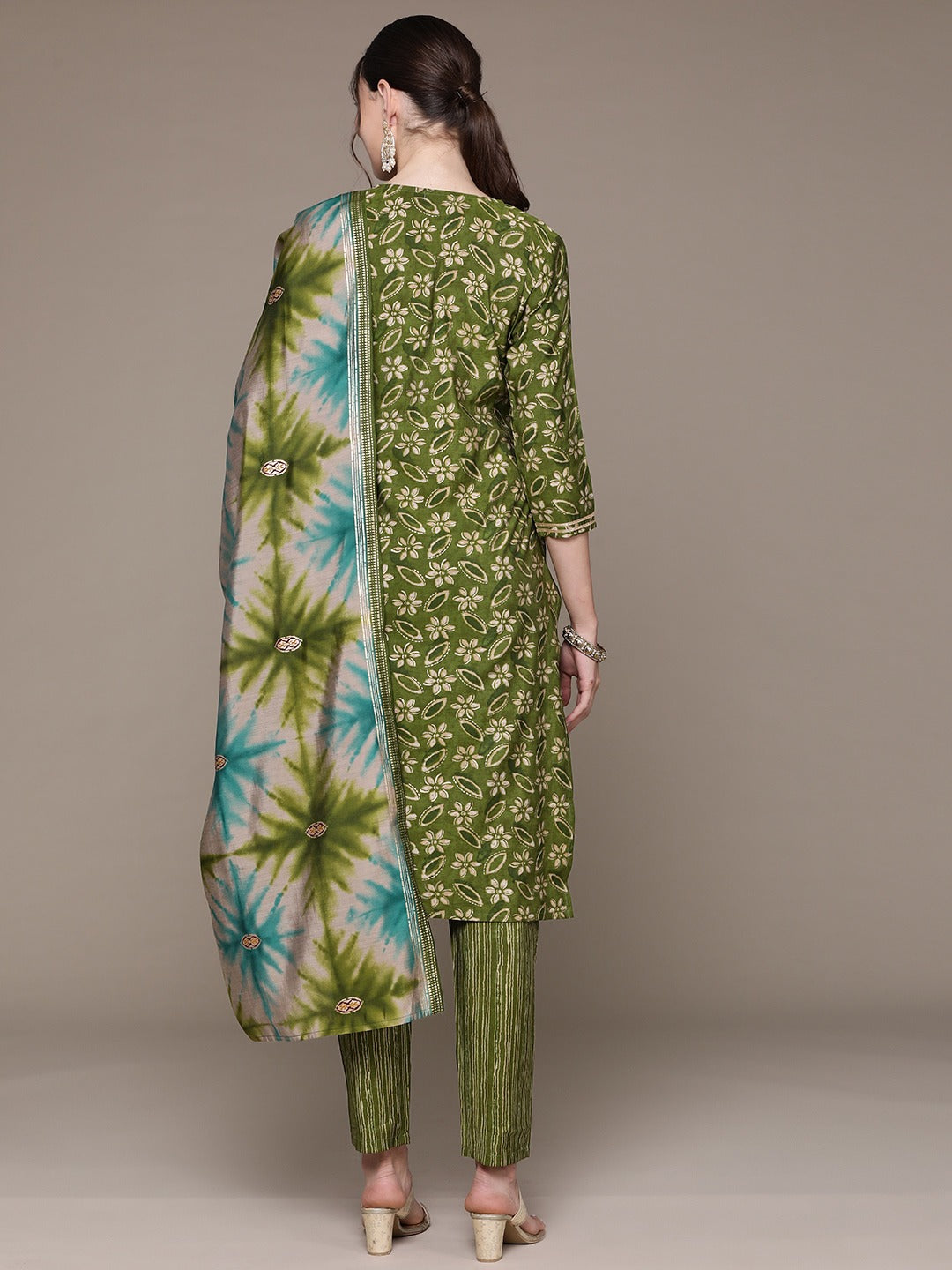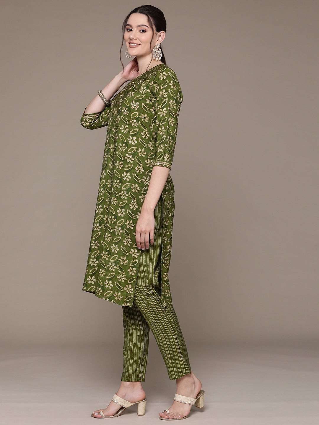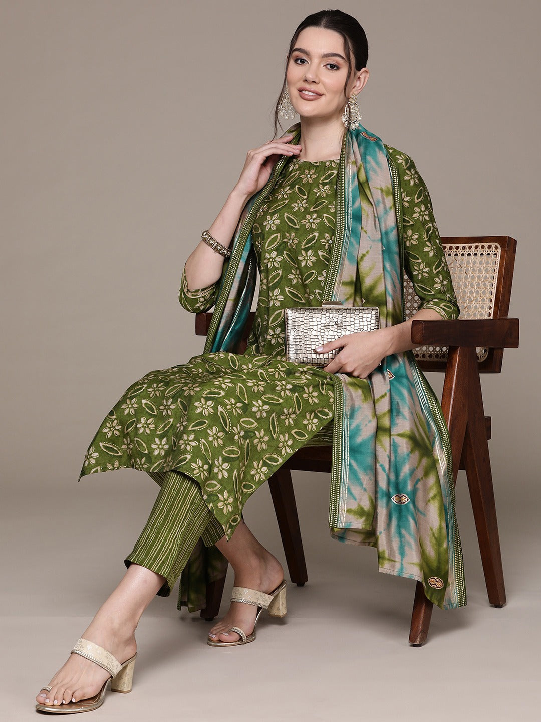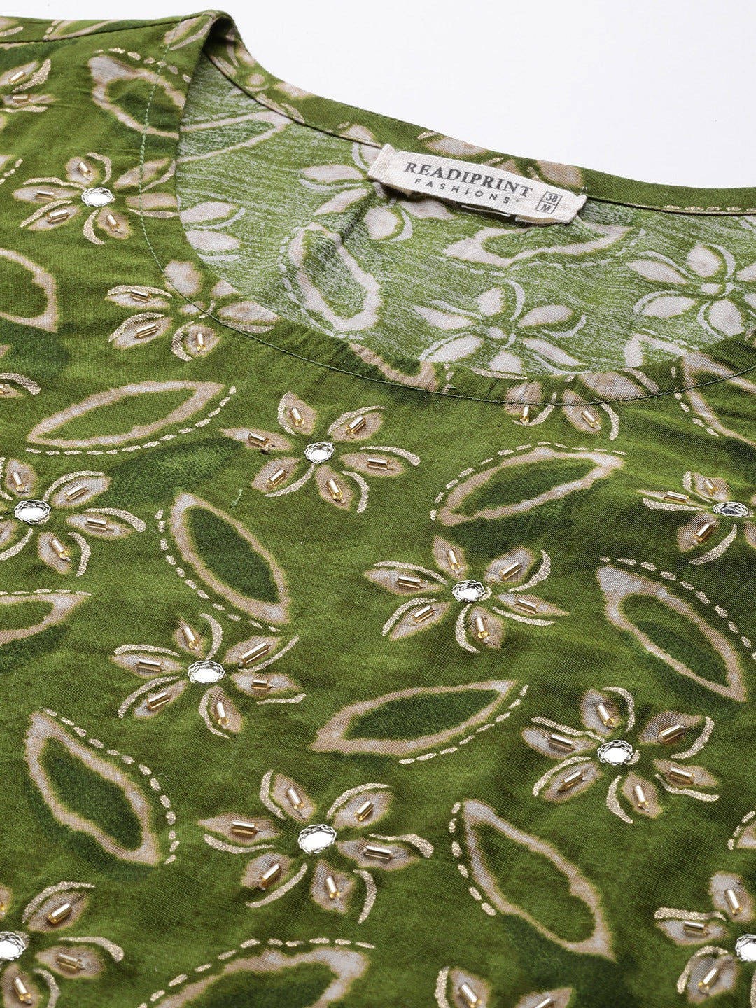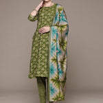 Straight Style Silk Fabric Green Color Printed & Cut Dana Work Kurti With Palazzo And Dupatta