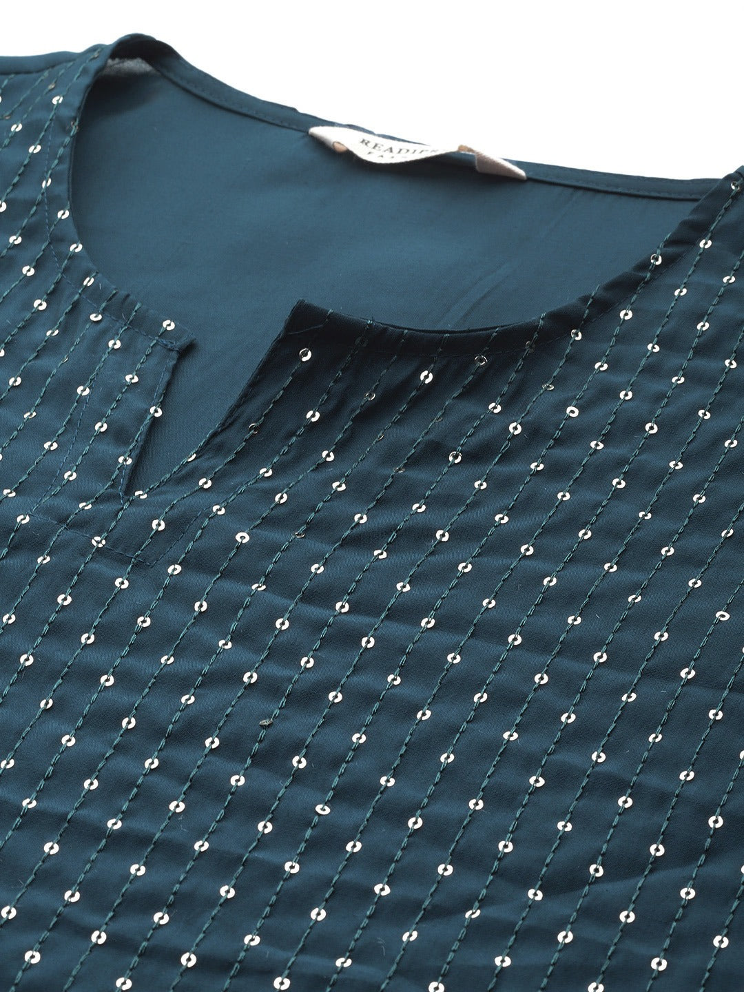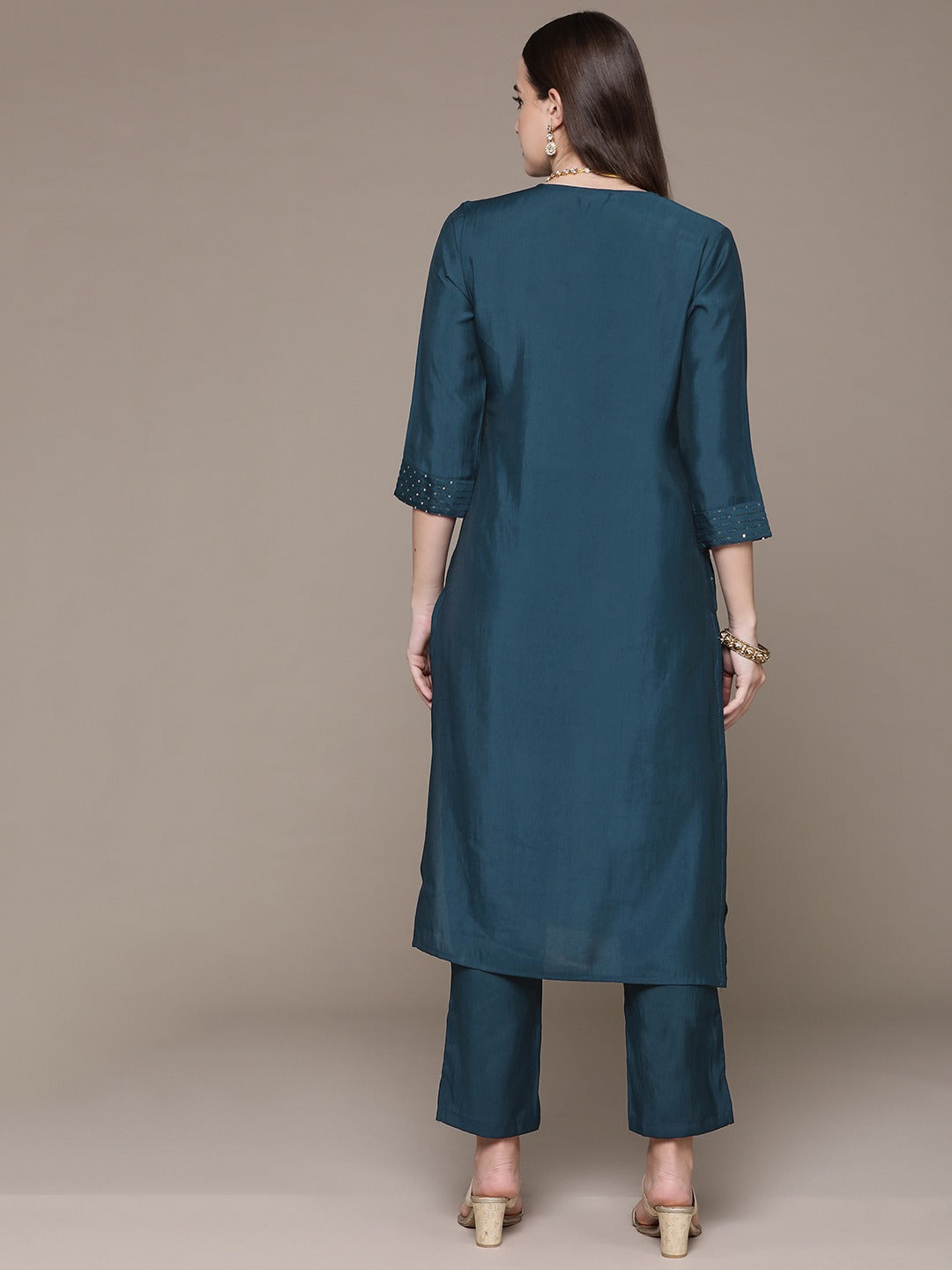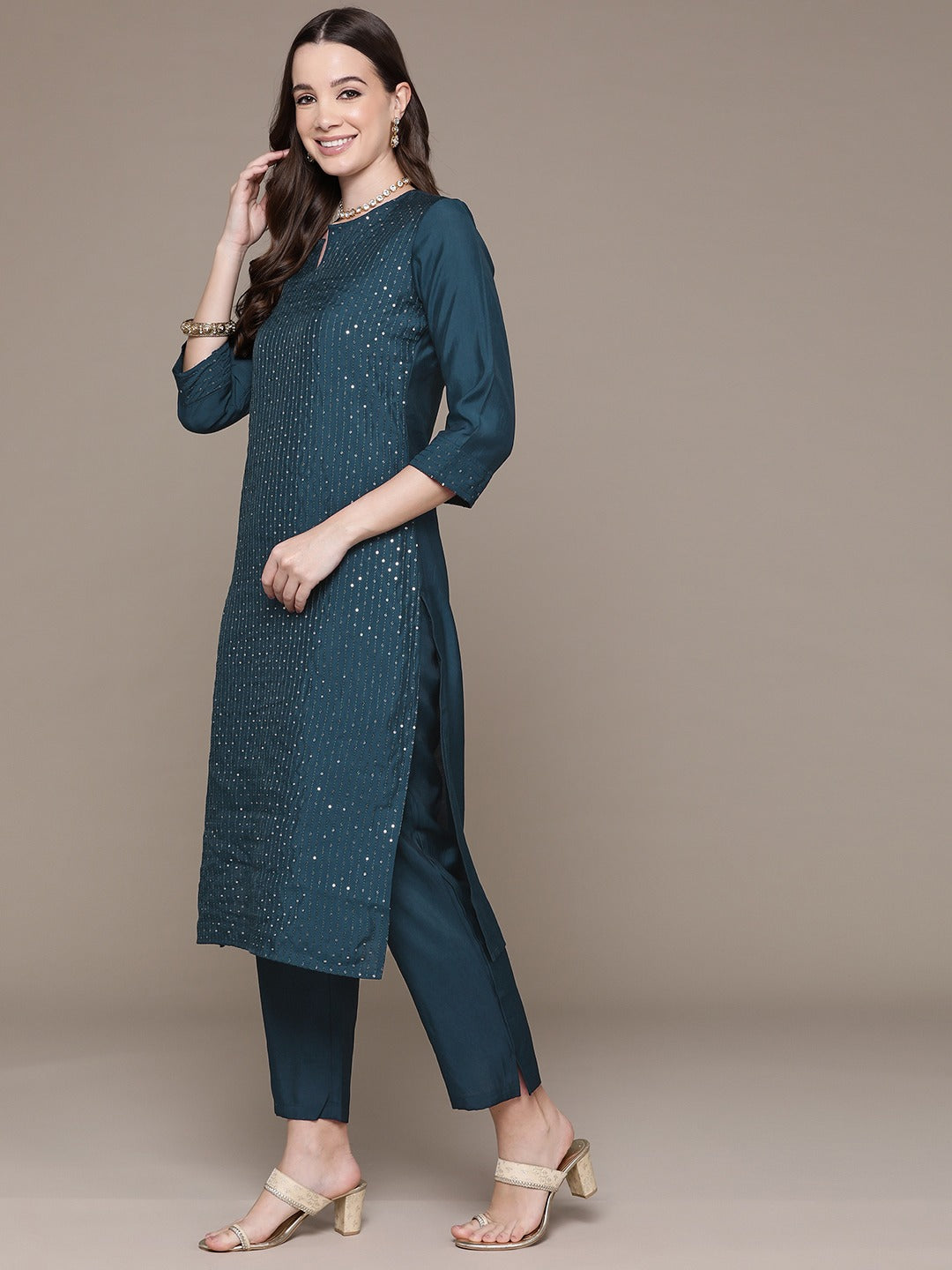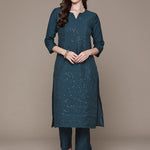 Straight Style Silk Fabric Teal Color Sequined Work Kurti With Palazzo