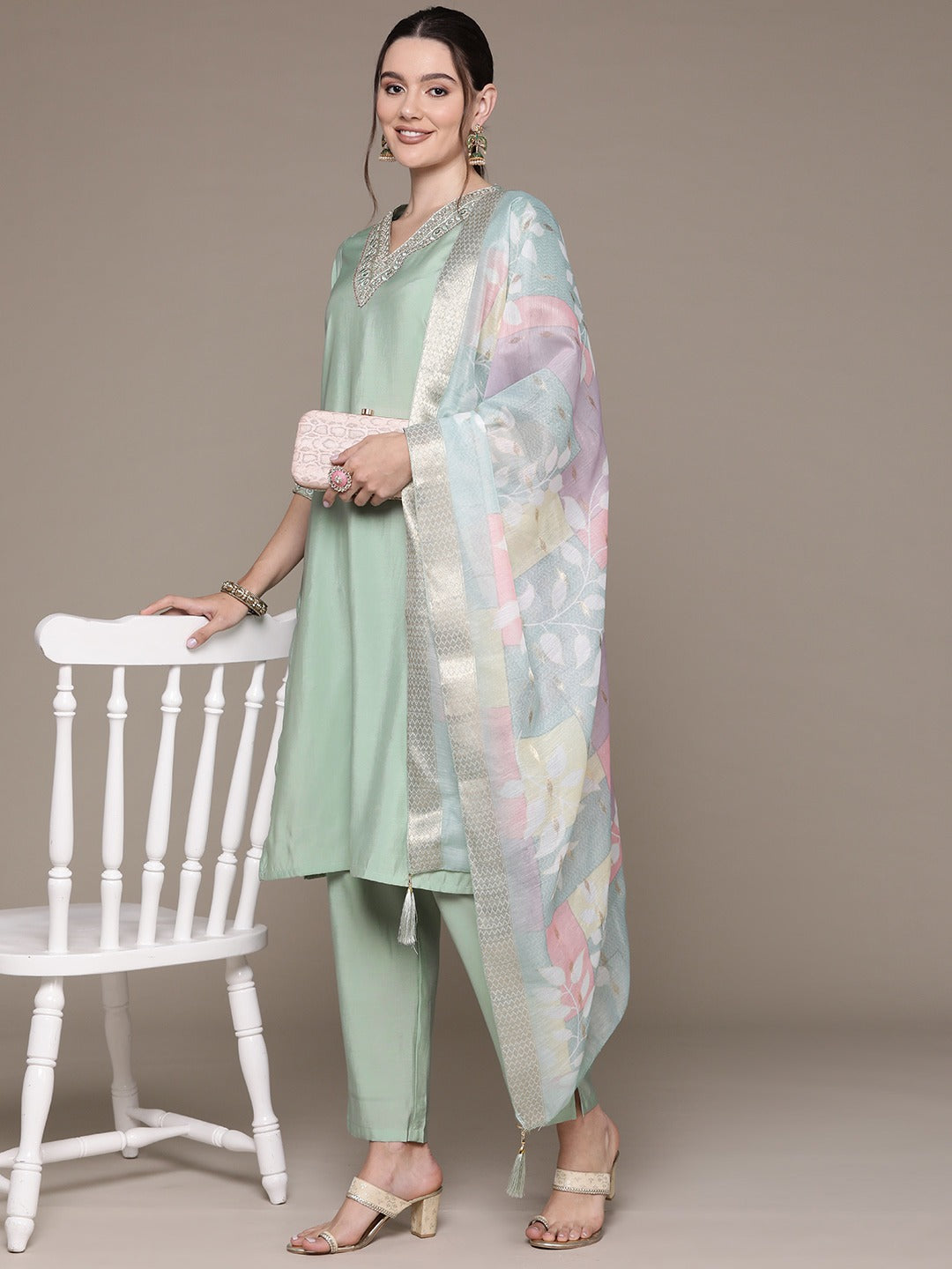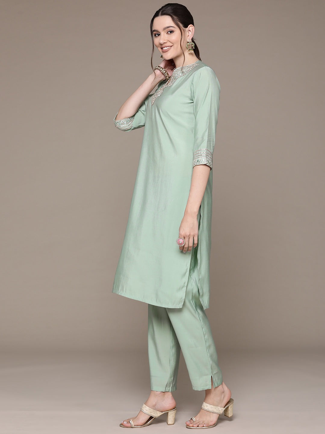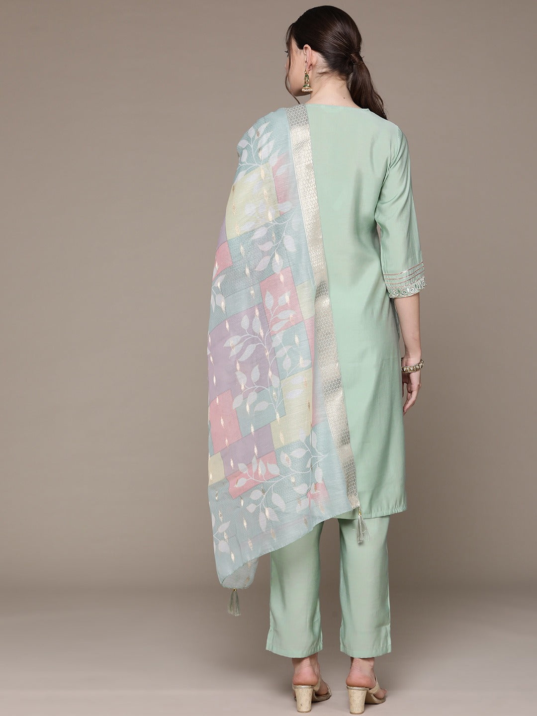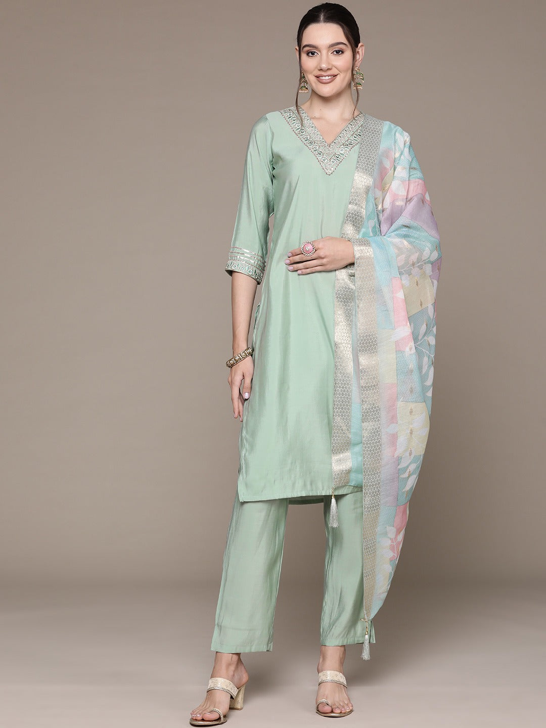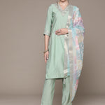 Straight Style Silk Fabric Green Color Embroidered & Zari Work Kurti With Palazzo And Dupatta