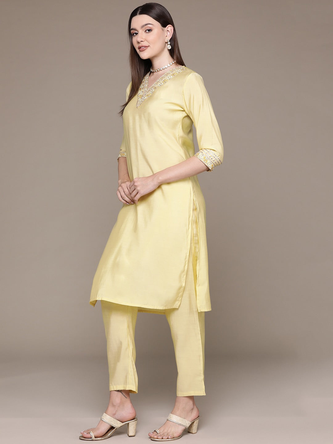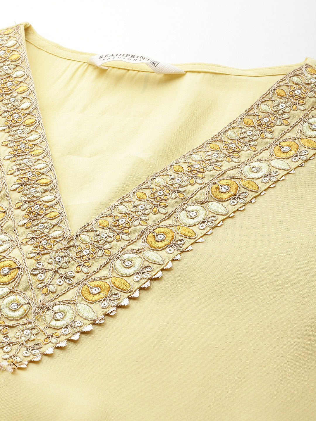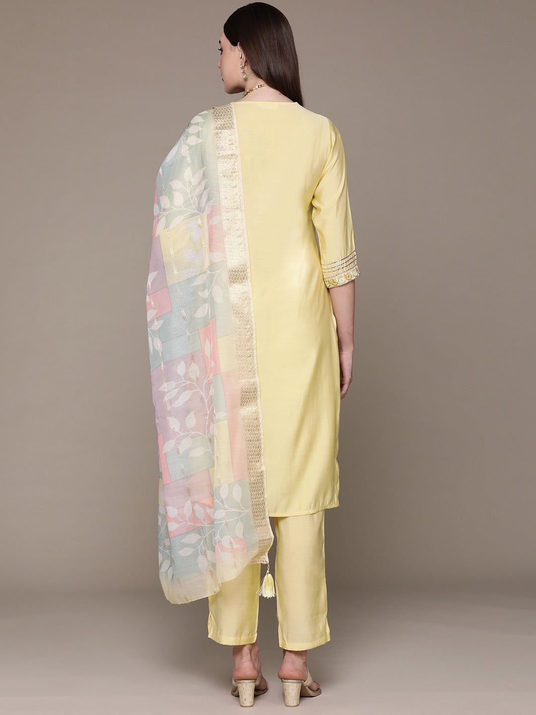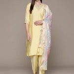 Straight Style Silk Fabric Yellow Color Embroidered & Zari Work Kurti With Palazzo And Dupatta