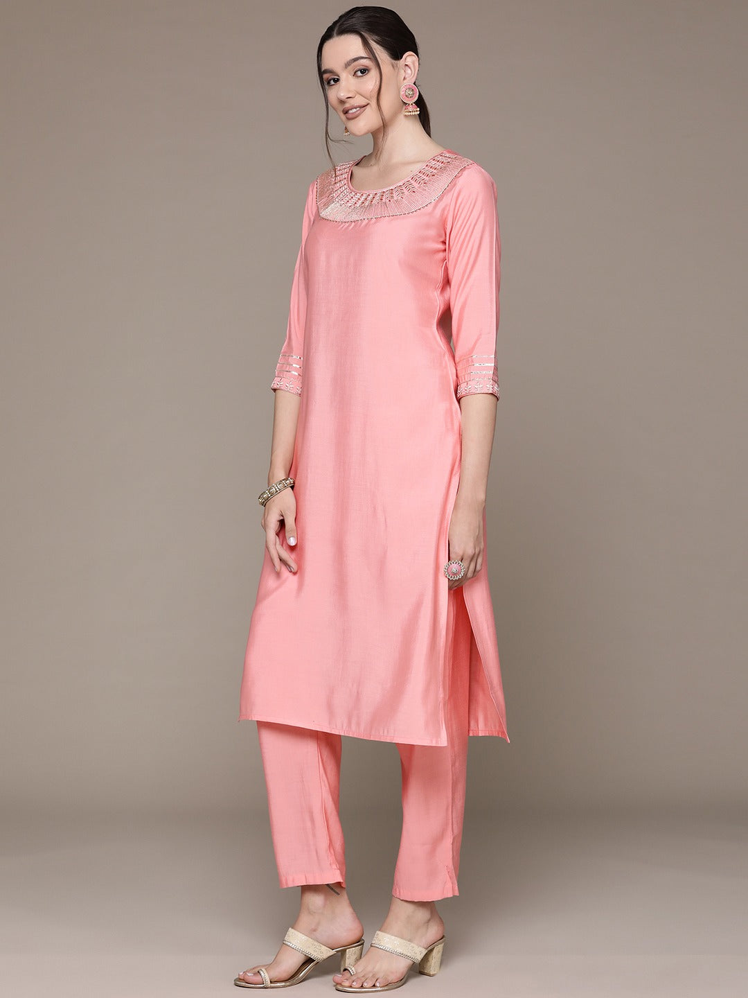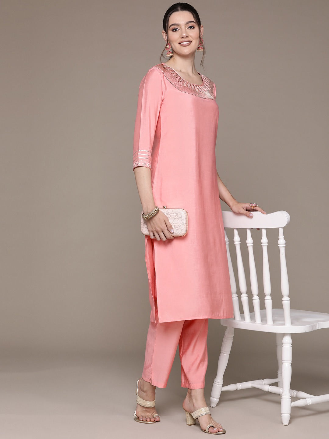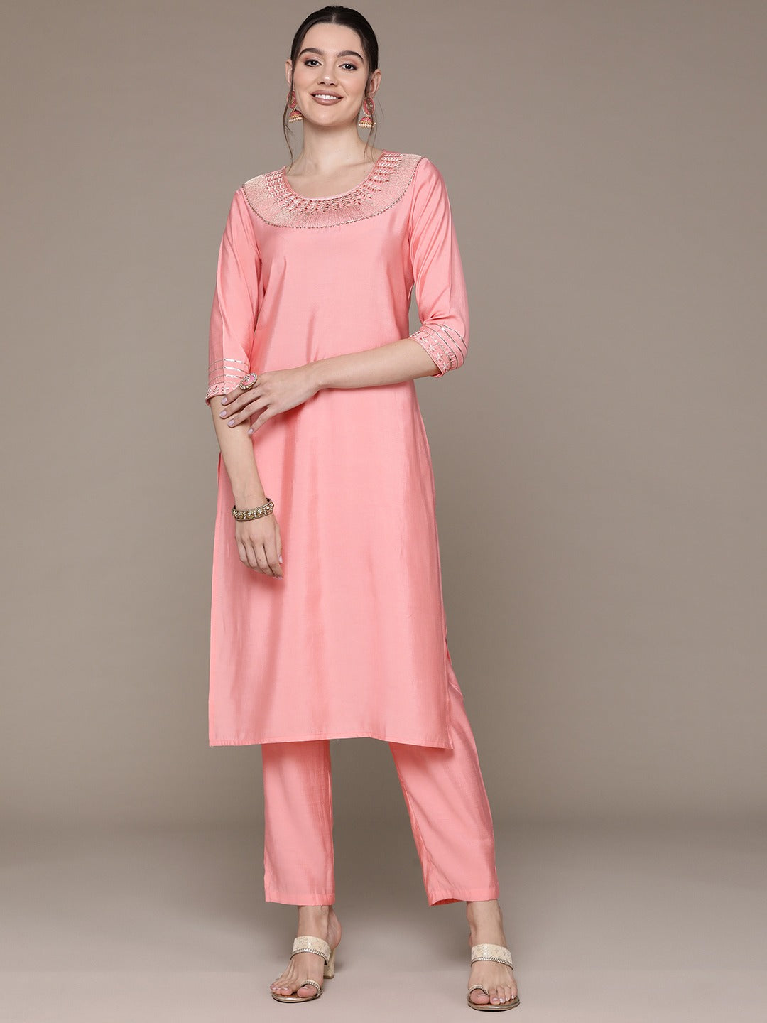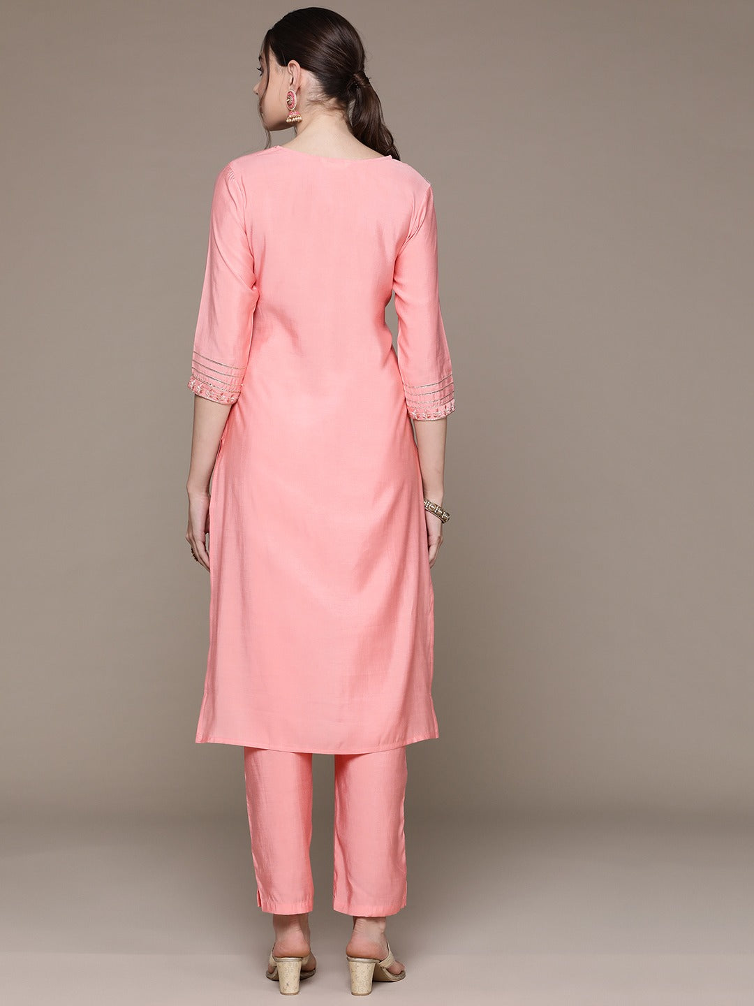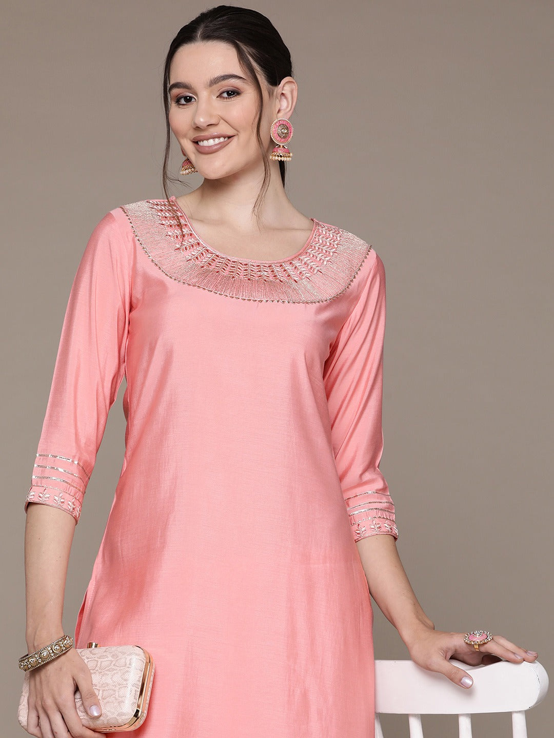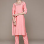 Straight Style Silk Fabric Peach Color Embroidered & Zari Work Kurti With Palazzo