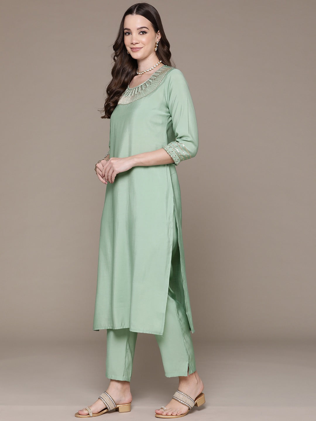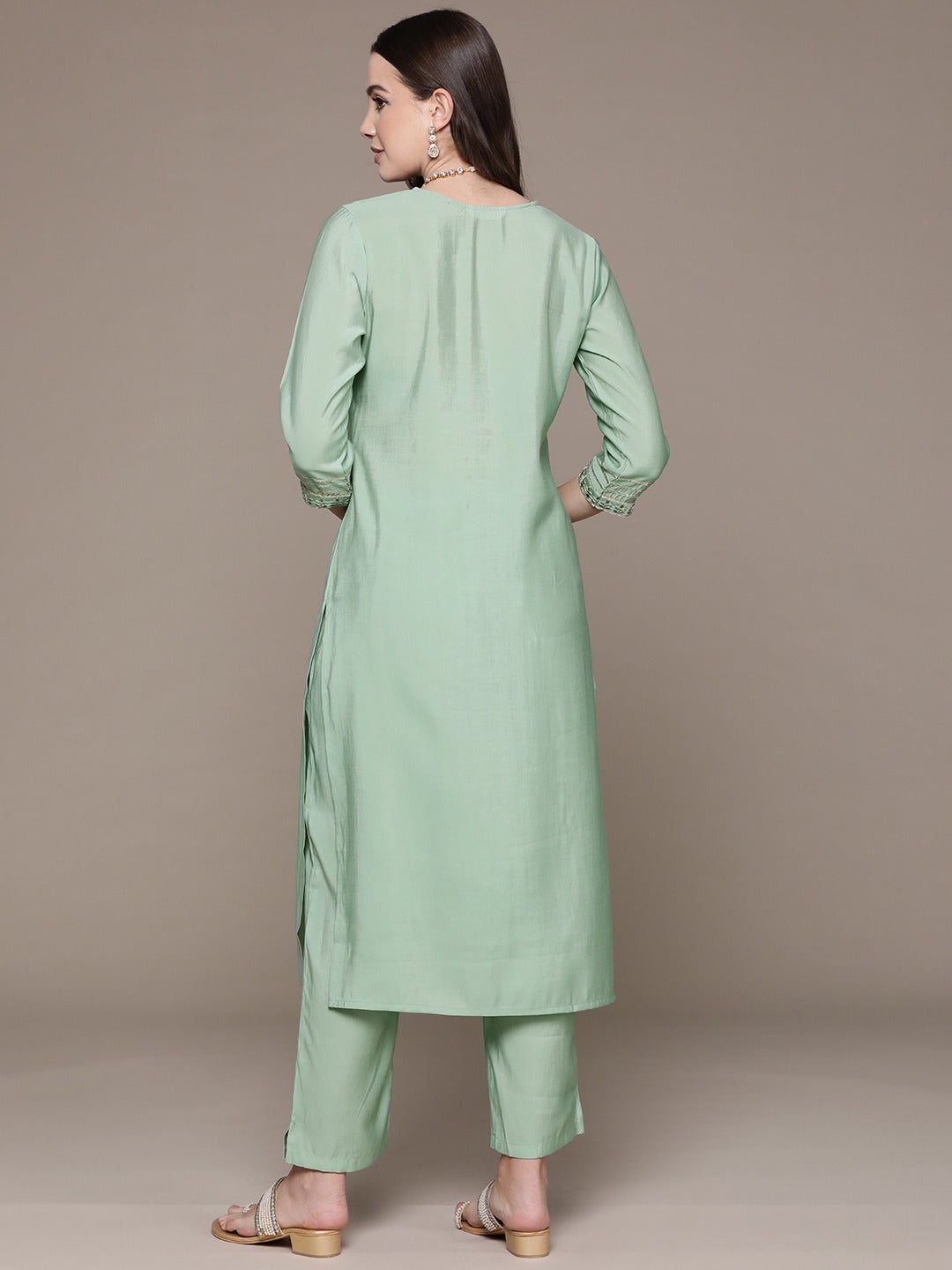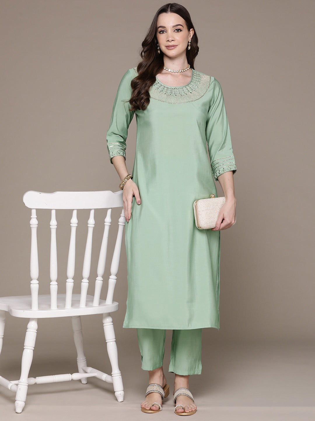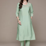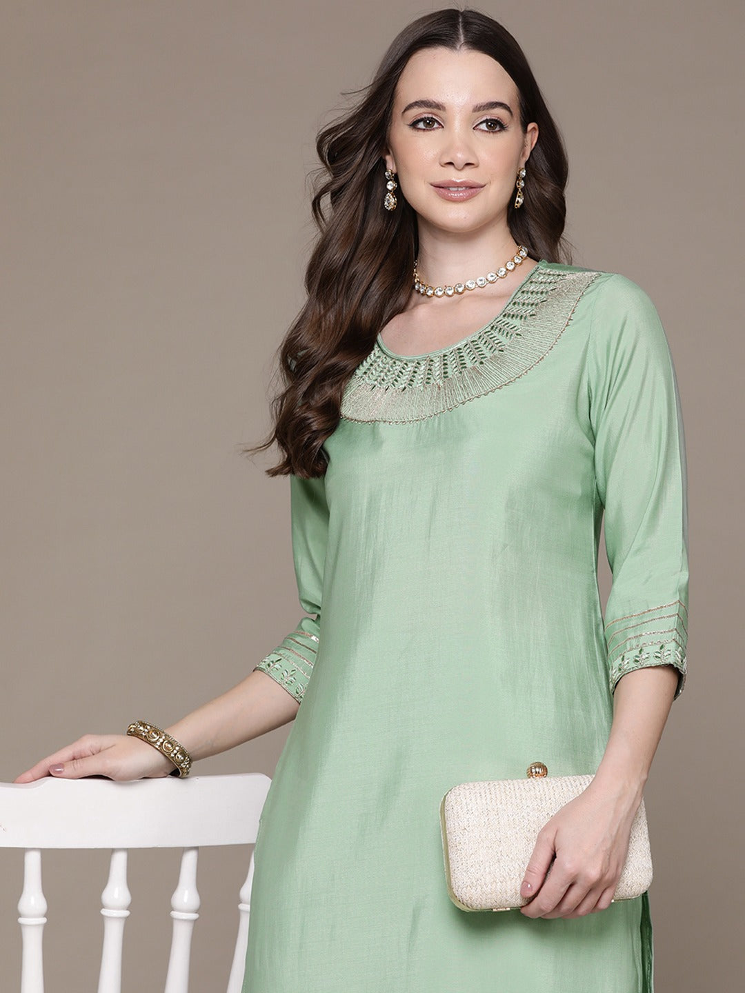 Straight Style Silk Fabric Green Color Embroidered & Zari Work Kurti With Palazzo